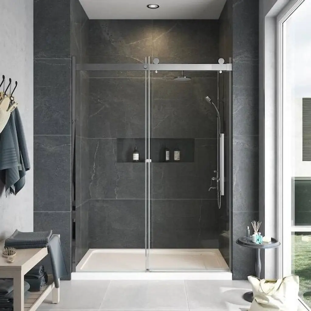 The Transolid Madeline Frameless Sliding Shower Door Collection offers an elegant, sophisticated look. It is available in 60 in. W and either 60 or 76 in. H and features thick, premium 5/16 in. (8mm) clear tempered glass with professionally applied Nano clear glass coating, which provides superior dirt and water repellant and stain resistant benefits. TruMotion® technology makes our shower doors close softly and effortlessly no matter how hard you slam them or how heavy they are and the Madeline door provides up to 3/8 in. of out-of-plumb adjustability on each side to provide a watertight fit in your alcove. The Madeline Door is available in several desirable hardware finish options to match your bathroom's interior design and layout perfectly. Built for an alcove (3-wall) shower enclosure, this door can be installed for the door to slide on the left or the right, with the other panel remaining in a fixed position. 20 in. (500 mm from center to center) vertical shower door handles enhance the modern look. Multiple Transolid handle options are available, but this combination features the Riley handles. The Riley handles feature a unique, high-end design, adding a distinctive look to your Madeline shower door. These handles are substantial in weight and are every bit as functional as they are beautiful. Look for the matching grab bar to complete the look!Transolid MBDT607608FL-R Features: