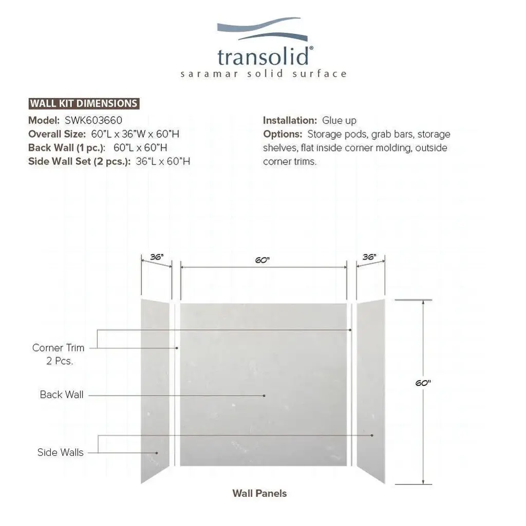 Subway tile has become a staple for design and Transolid is staying current with this trend by offering the SaraMar bath and shower wall panels. Subway tile offers a classic element that can elevate the design of any room; however, its clean and bright characteristics really appeal to a bathroom. These walls are ideal for a quick remodel, because there is no messy demolition required, instead, SaraMar walls simply glue right over your existing surface. SaraMar walls are hygienic, durable, and resistant to stain; they work with new and existing construction, they are trimmable to fit any space, and are on trend with the latest colors and patterns. Discover whether these bathroom wall panels are the right choice for you!Transolid SWK603660 Features:Transolid SWK603660 Specifications: