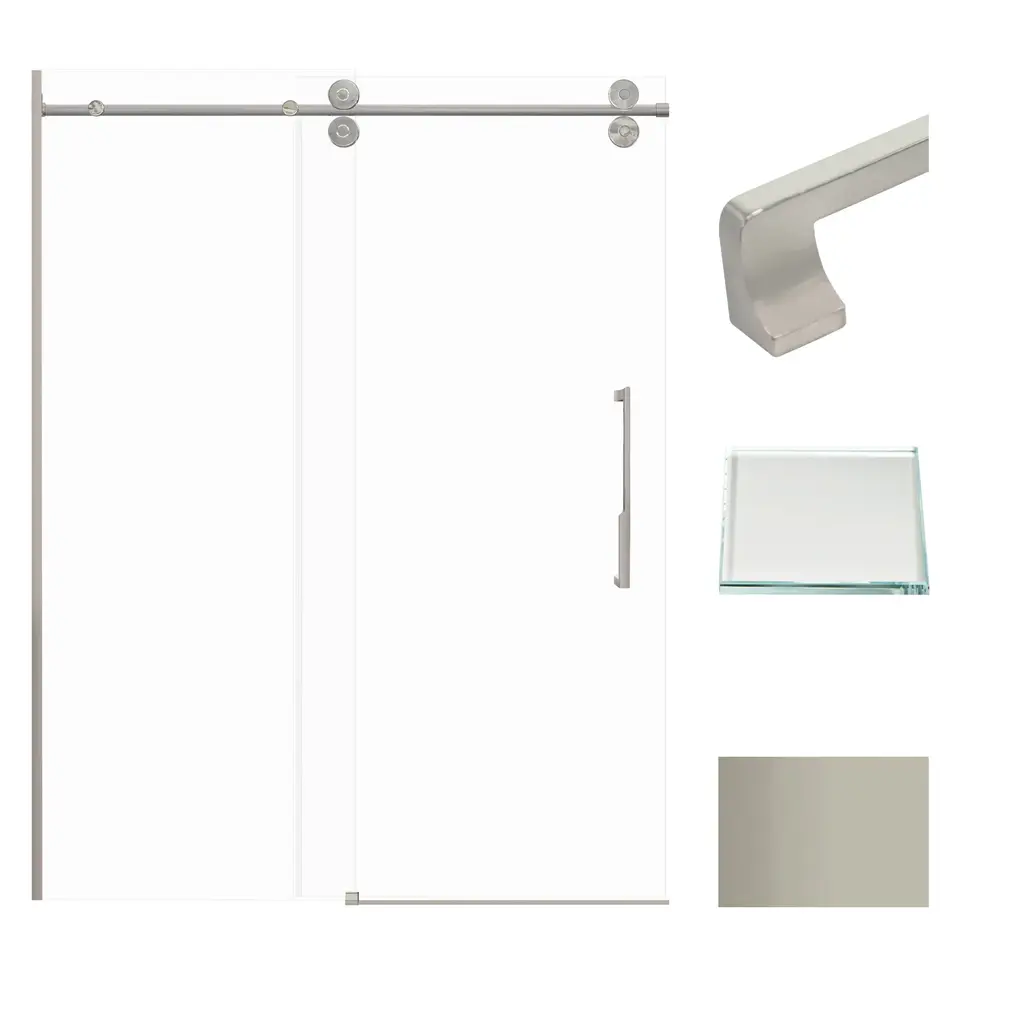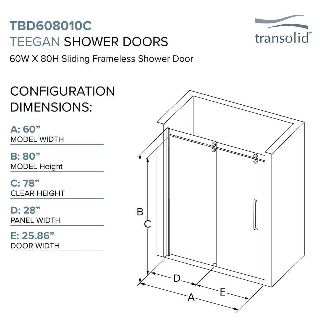 The Transolid Teegan Frameless Sliding Shower Door Collection offers an elegant, sophisticated look. It is available in 59 in. W x 80 in. H and features thick, premium 3/8 in. (10mm) clear tempered glass with professionally applied Nano clear glass coating, which provides superior dirt and water repellant and stain resistant benefits. The Teegan door provides up to 1/2 in. of out-of-plumb adjustability on each side to provide a watertight fit in your alcove. The Teegan Door is available in several desirable hardware finish options to match your bathroom's interior design and layout perfectly. Built for an alcove (3-wall) shower enclosure, this door can be installed for the door to slide on the left or the right, with the other panel remaining in a fixed position. 20 in. (500 mm from center to center) vertical shower door handles enhance the modern look. Multiple Transolid handle options are available, but this combination features the Riley handles. The Riley handles feature a unique, high-end design, adding a distinctive look to your Teegan shower door. These handles are substantial in weight and are every bit as functional as they are beautiful. Look for the matching grab bar to complete the look!Transolid TBD608010L-R Features: