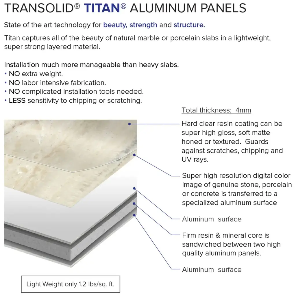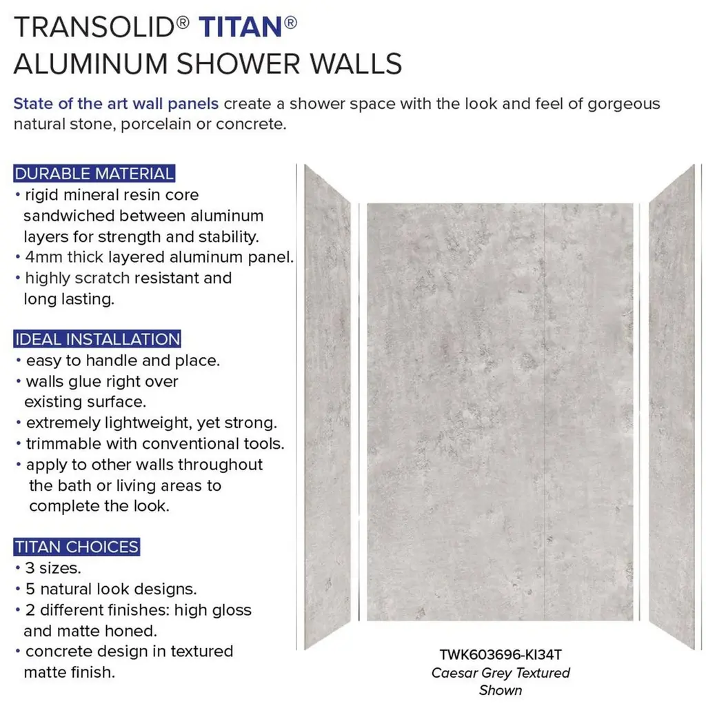 Perfect for new construction or a refreshing remodel, Transolid Titan Shower Walls add a luxurious natural stone look to any area of your home. Customize your space by using these versatile walls in your shower, bathroom, or laundry room, as accent pieces, or as kitchen backsplash. Make your design dreams come true without the hassle; Transolid’s lightweight walls glue right over existing surfaces for a quick and easy installation. Choose Transolid and let the easy-to-clean, water and scratch resistant walls simplify your life for years to come.Transolid TWK603696-T Features:Transolid TWK603696-T Specifications: