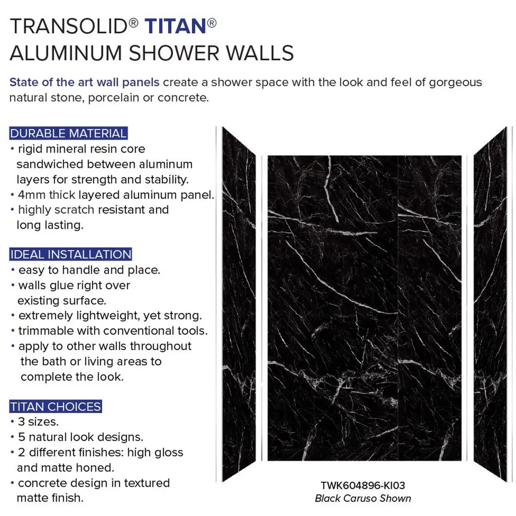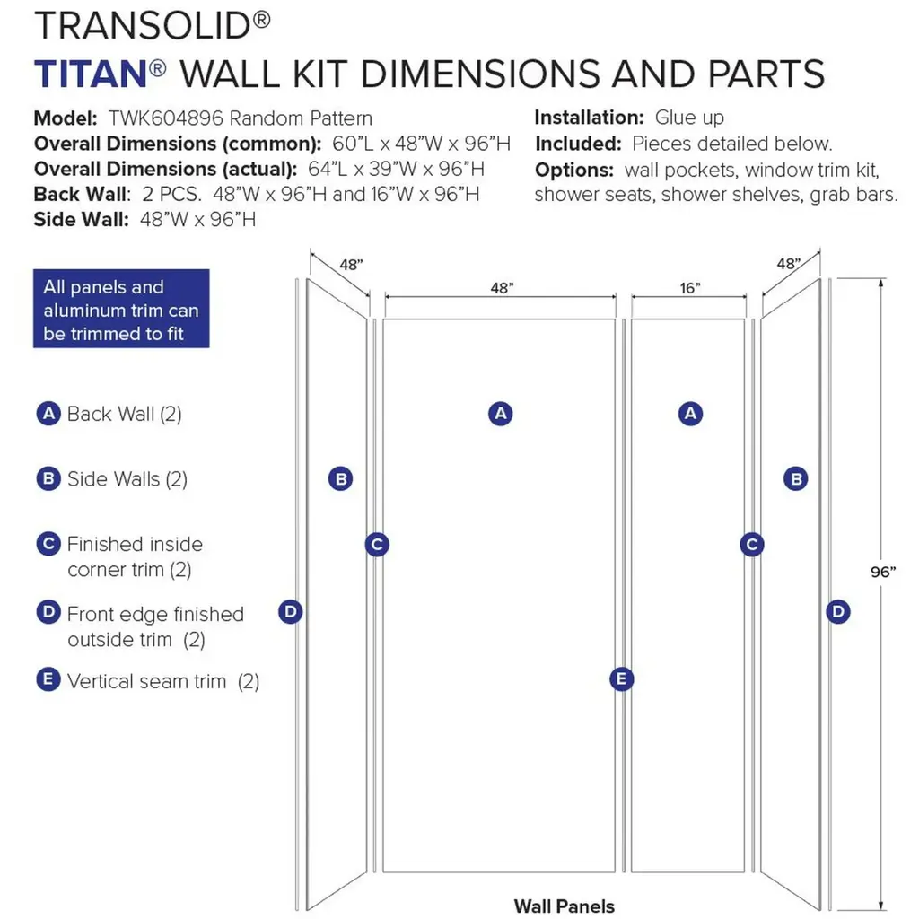 Perfect for new construction or a refreshing remodel, Transolid Titan Shower Walls add a luxurious natural stone look to any area of your home. Customize your space by using these versatile walls in your shower, bathroom, or laundry room, as accent pieces, or as kitchen backsplash. Make your design dreams come true without the hassle; Transolid’s lightweight walls glue right over existing surfaces for a quick and easy installation. Choose Transolid and let the easy-to-clean, water and scratch resistant walls simplify your life for years to come.Transolid TWK604896-G Features:Transolid TWK604896-G Specifications: