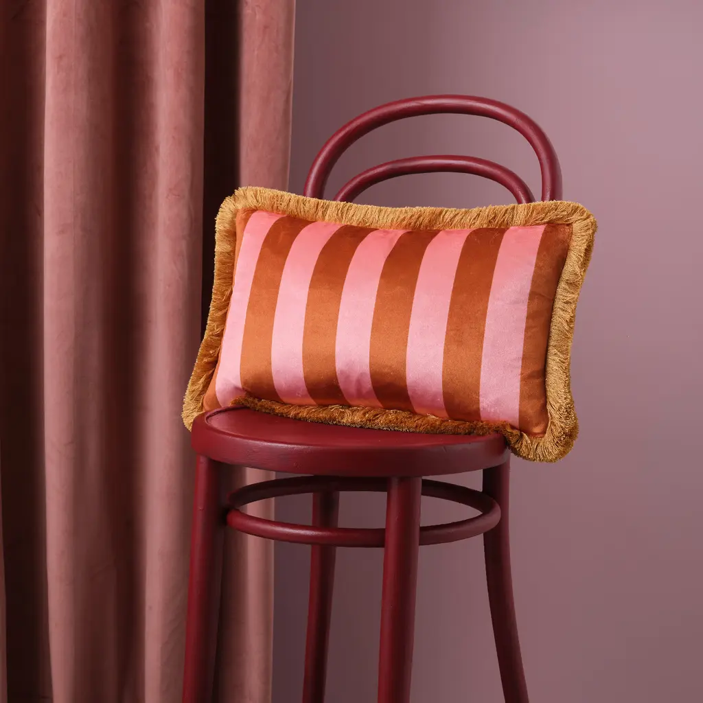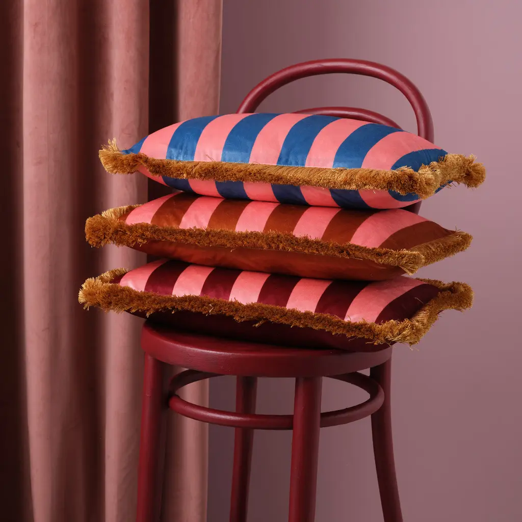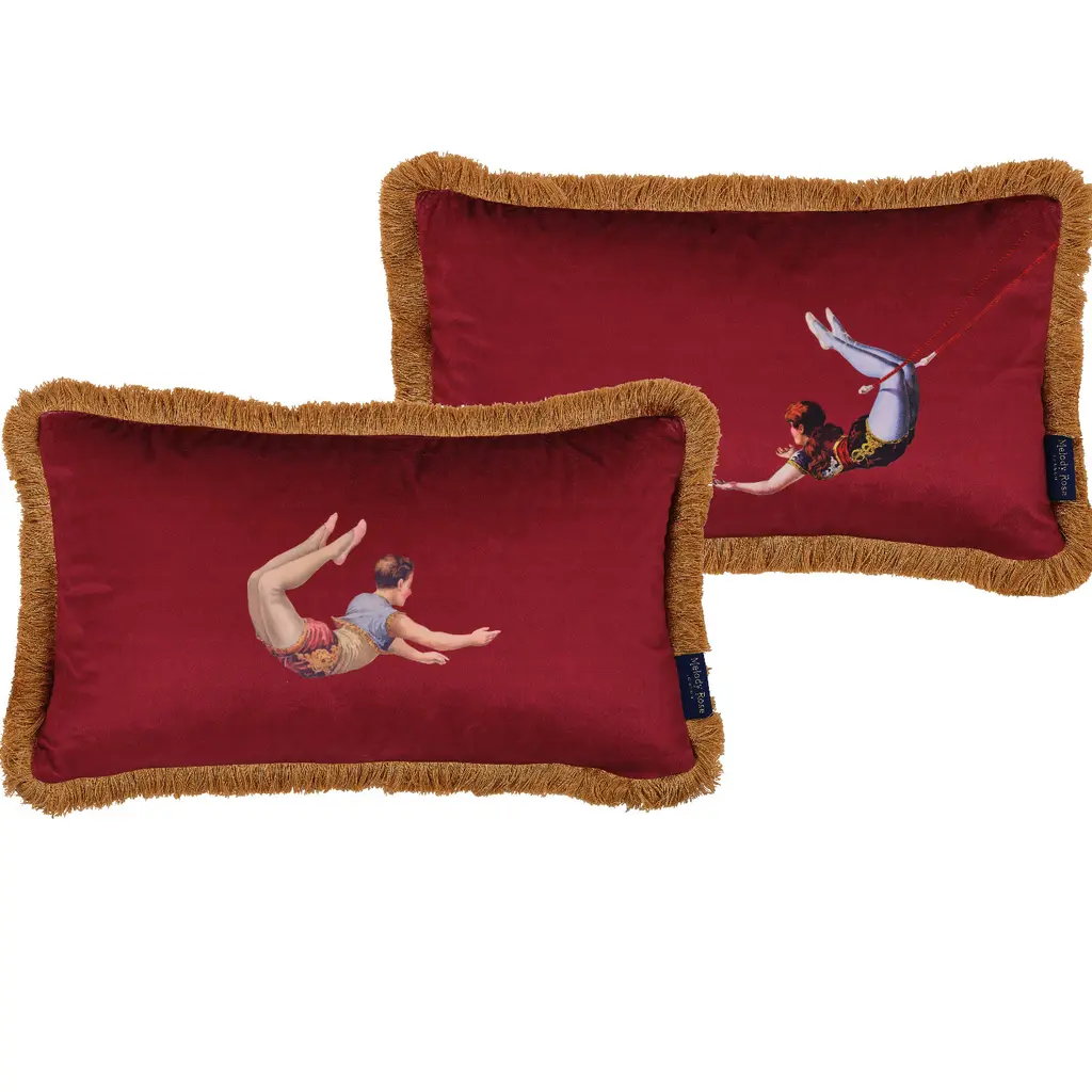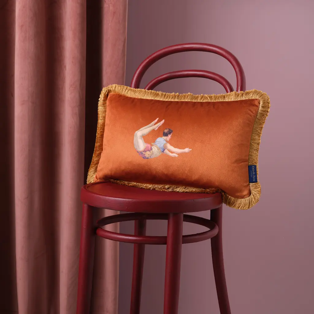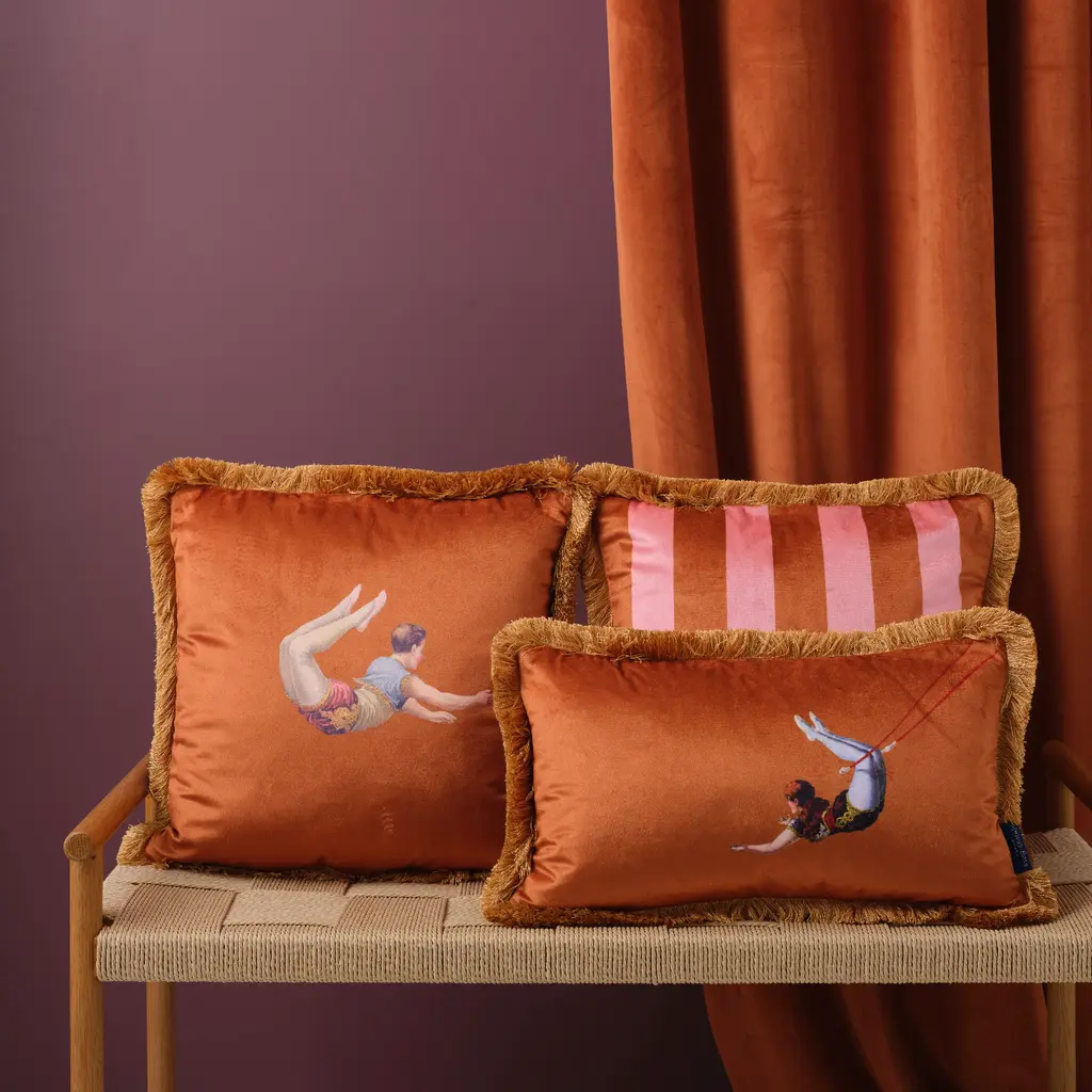 A sumptuous velvet cushion with a double-sided design featuring the Trapeze Boy in burnt orange on one side and pink and burnt orange wide stripes on the reverse. Finished with a handcrafted gold fringe ruche for an added touch of playful luxury.Features hidden zip and Includes ethically sourced feather inner cushion pad.Perfect on it’s own, paired with the Trapeze Girl design or mix and match cushion designs, colours and sizes to create your own unique lookArrives wrapped in bespoke tissue with fringe held in place by 'string'. Once string is removed, please allow a few days for fringe to fluff up and cushion to settle.