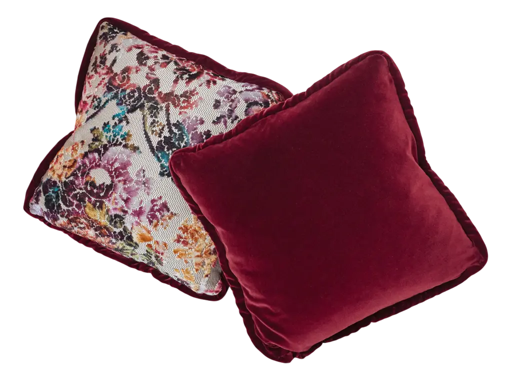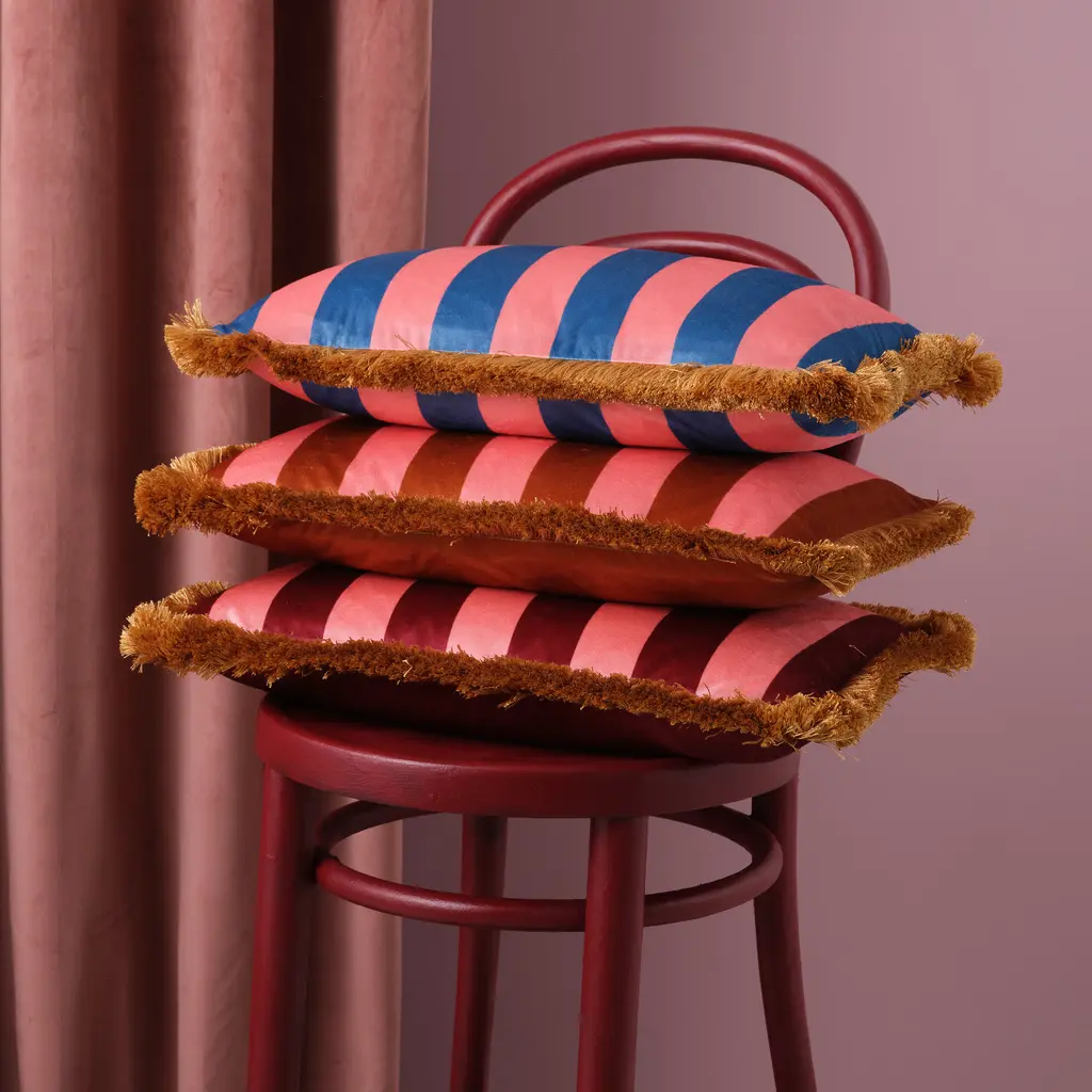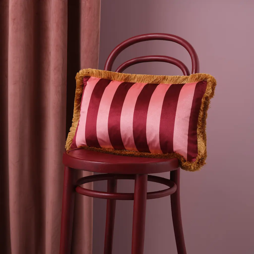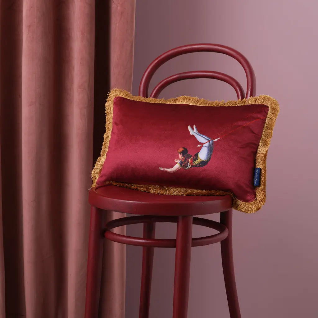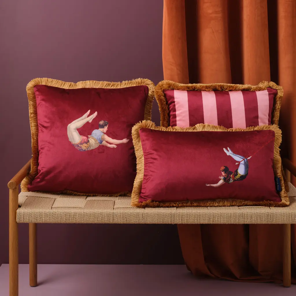 Bring instant colour and texture to you home with a set of two sumptuous velvet cushions featuring the circus inspired Trapeze Girl and Boy designs in deep berry red on one side and wide pink and red candy stripe design on the reverse side.The reversible, double-sided design offers two eye-catching, inter-changeable choices. Simply flip the cushion over for an instant update to any room.The oblong shape makes these cushions perfect as a pair, layered up with larger square cushions or to use as bolster cushions.Features hidden zip, handmade gold fringe finish and ethically sourced duck feather inner cushion pad.Arrives wrapped in bespoke tissue with fringe held in place by 'string'. Once string is removed, please allow a few days for fringe to fluff up and cushion to settle.