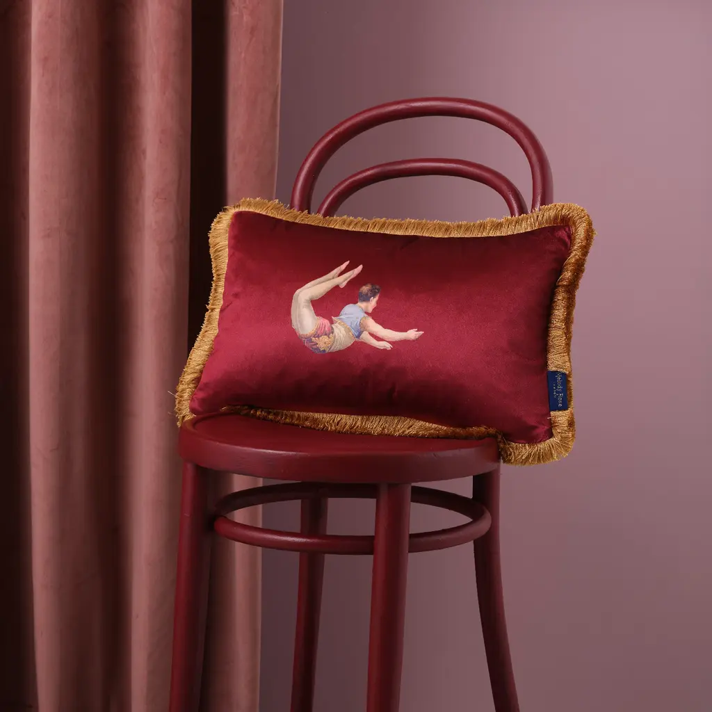 Trapeze Girl & Boy Set Of Two Velvet Cushions Deep Berry Red Oblong