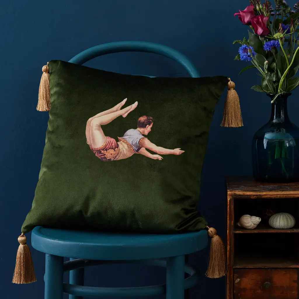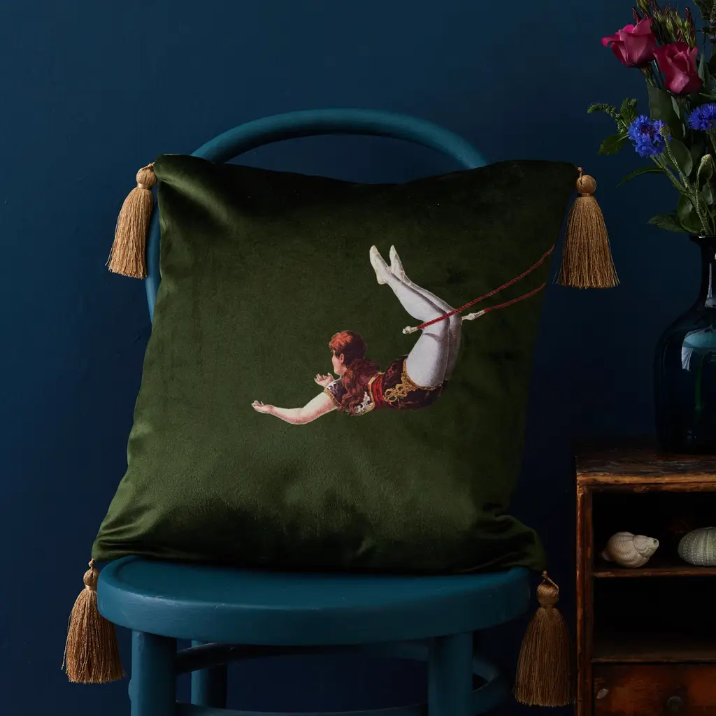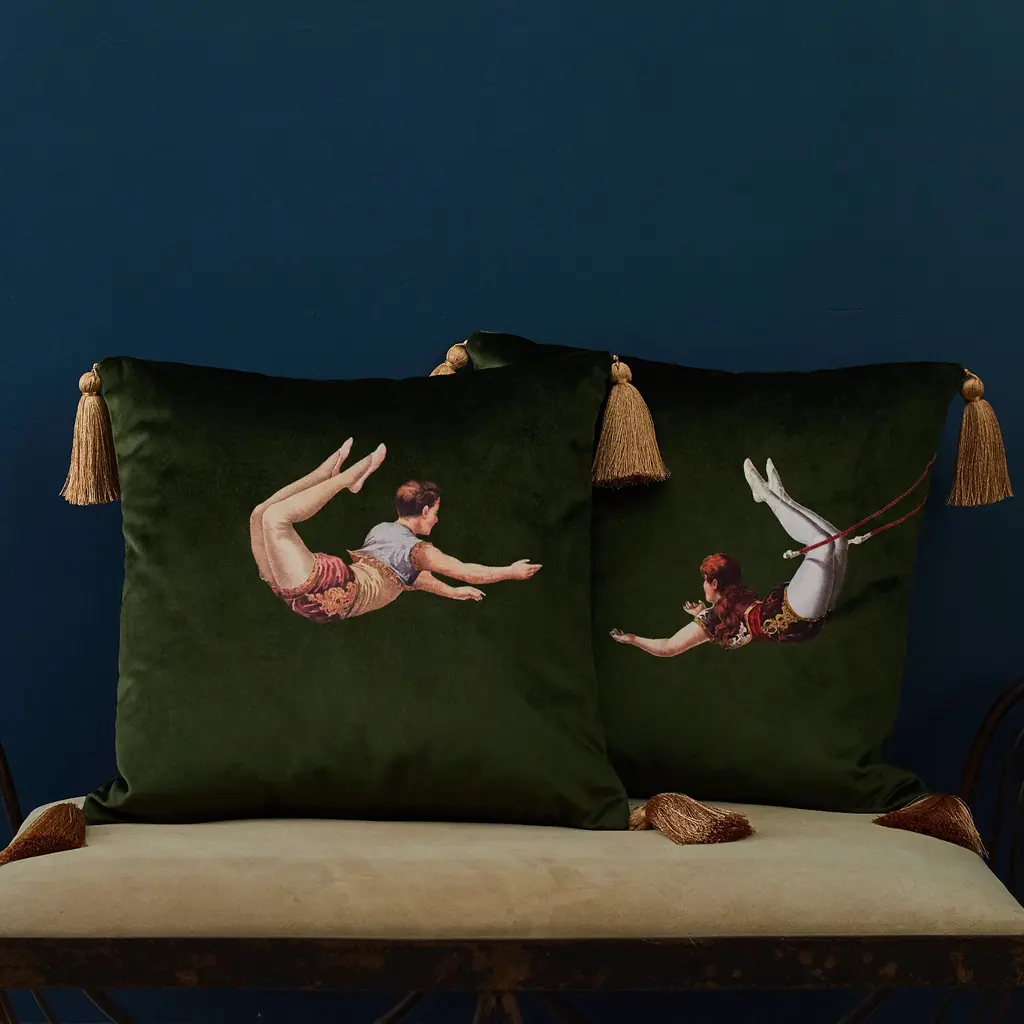 Bring instant colour and texture to you home with a set of two sumptuous velvet cushions in lush meadow green featuring Melody Rose's Trapeze Girl and Boy designs.From the Act of Daring collection, the circus inspired designs celebrate the glamour, colourful costumes and thrill of life under the big top. The pair of cushions will lend a decadent and eclectic touch to any home interior, breathing life into love-worn sofas and chairs.Feature hidden zip and luxurious, handmade golden tassels, the Trapeze Girl and Boy designs are also available in sharkskin grey, deep berry red and burnt orange.Comes wrapped in recyclable bespoke tissue and makes a delightful gift.