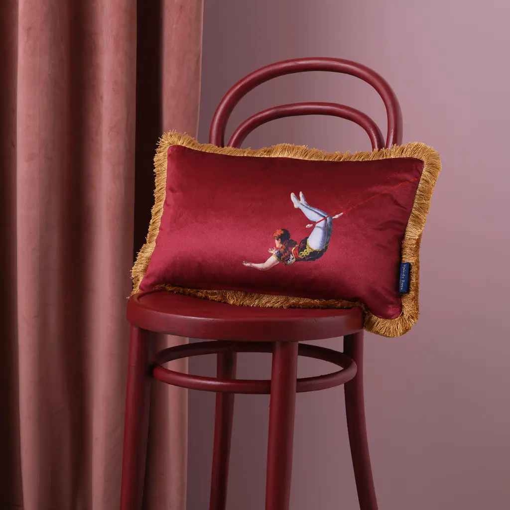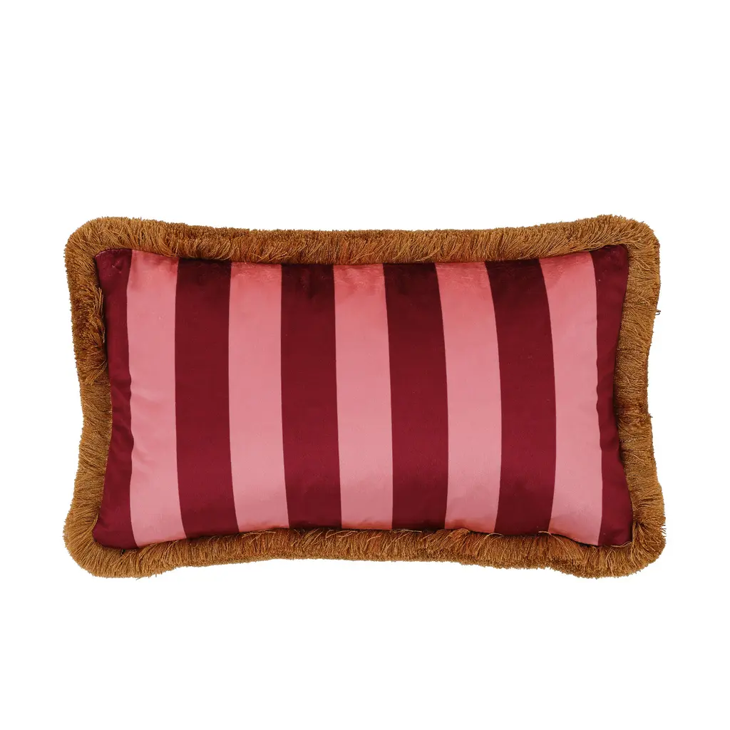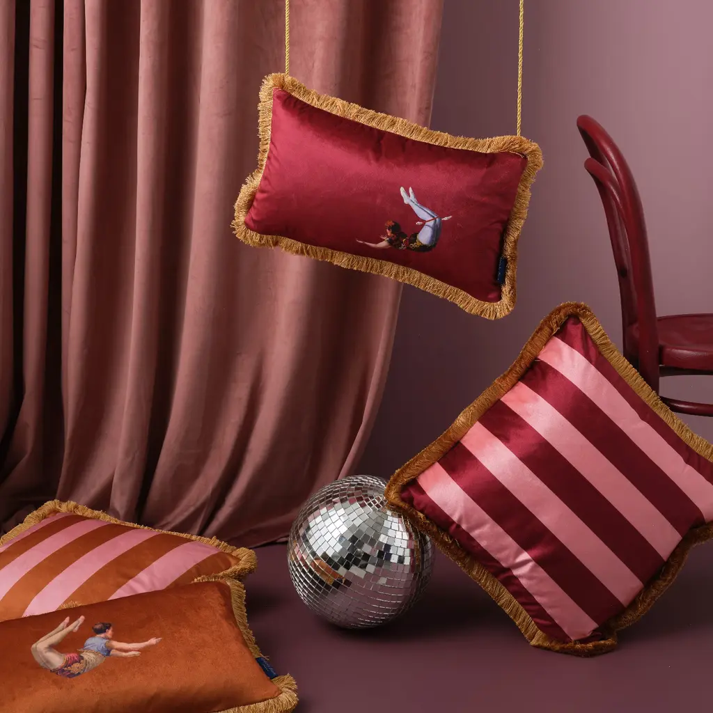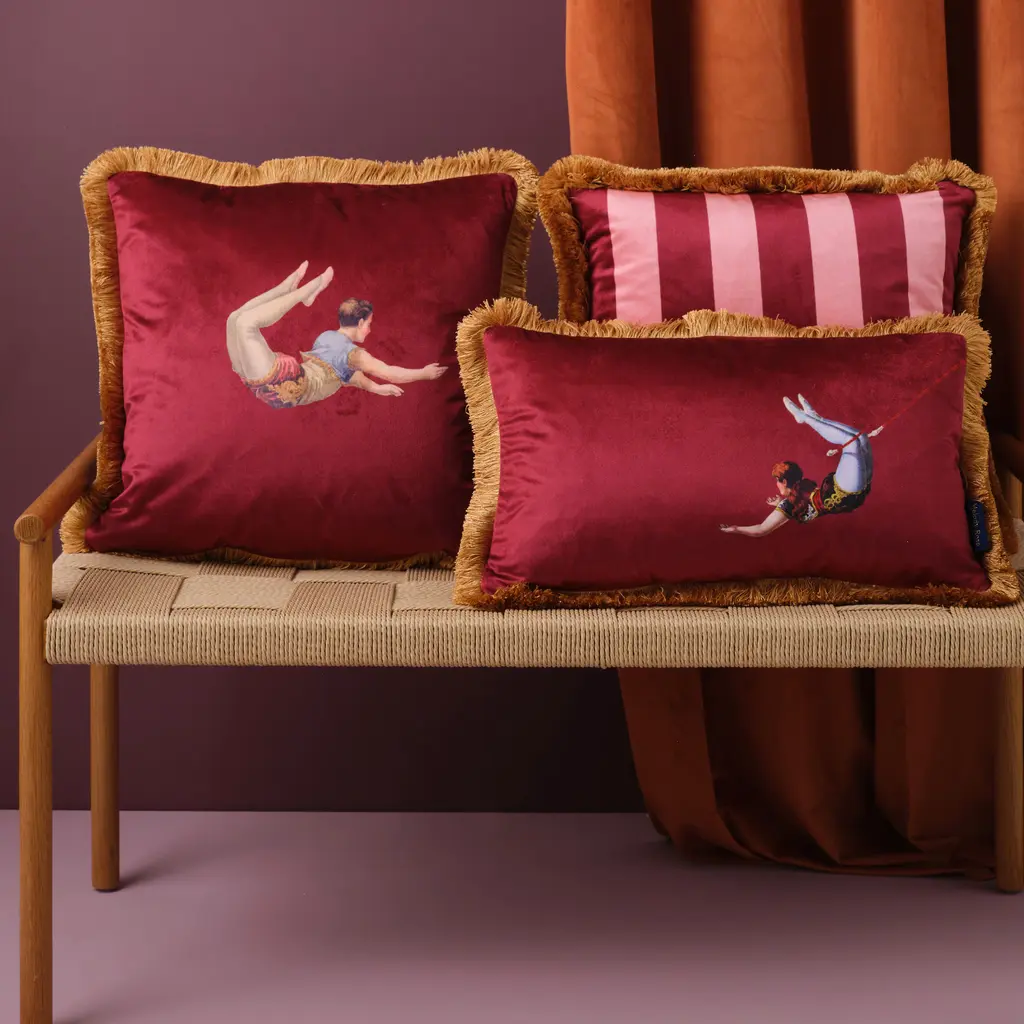 Bring instant colour and texture to your home with a sumptuous fringed velvet cushion with a double-sided design.Featuring the Trapeze Girl design in deep berry red on one side and wide pink and deep berry red wide stripe design on the reverse for two eye-catching, inter-changeable choices. Simply flip the cushion over for an instant update to any room. Perfect on it's own, paired with the Trapeze Boy design or mixed and layered with any of the Melody Rose range of cushions.Features hidden zip, handmade gold fringe finish and ethically sourced duck feather inner cushion pad.Arrives wrapped in bespoke tissue with fringe held in place by 'string'. Once string is removed, please allow a few days for fringe to fluff up and cushion to settle.