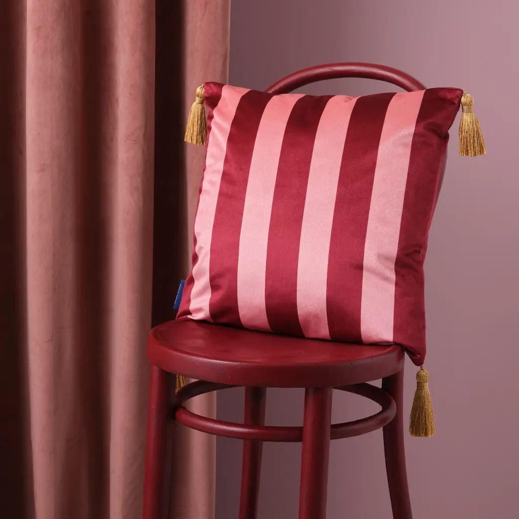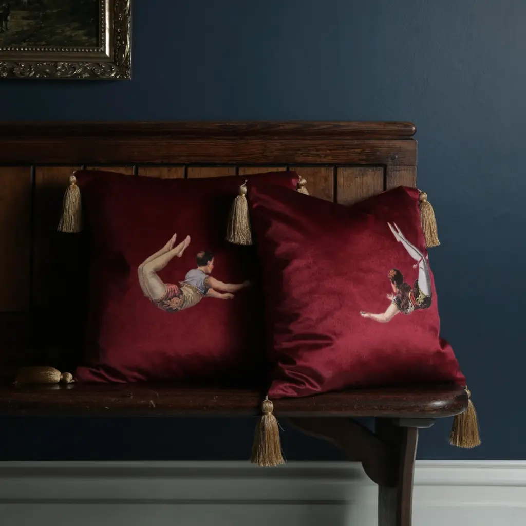A sumptuous velvet cushion features the trapeze girl design in deep berry red on one side and wide candy stripes in seashell pink and deep berry red on the reverse. The reversible, double-sided design offers two eye-catching, inter-changeable choices. Simply flip the cushion over for an instant update to any room.Finished with handcrafted gold tassels and hidden zip.Perfect on it's own, paired with the Trapeze Boy design or mix and pile up cushion designs and colours to create your own unique look.Includes ethically sourced duck feather inner cushion pad.