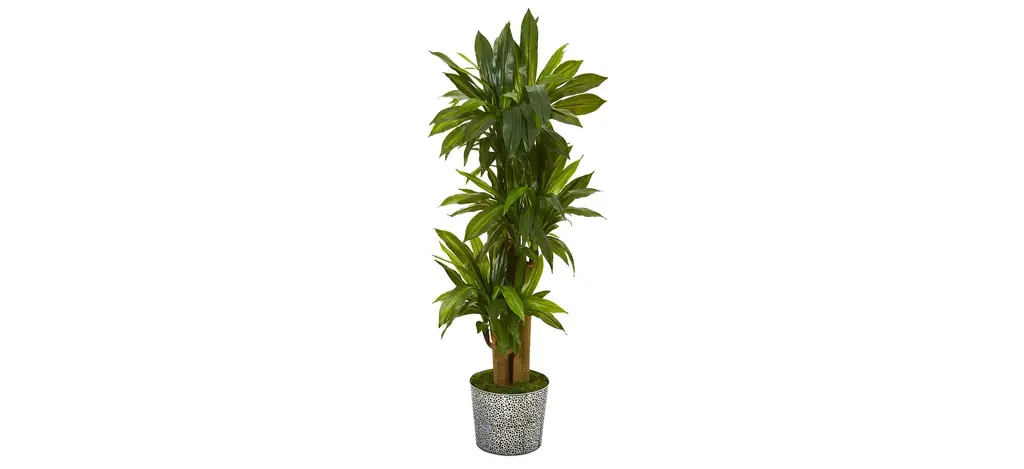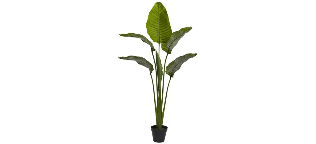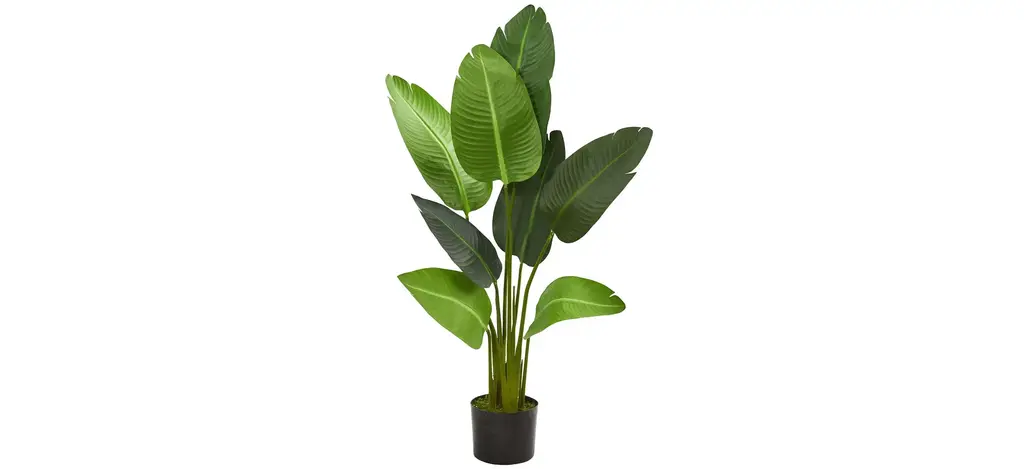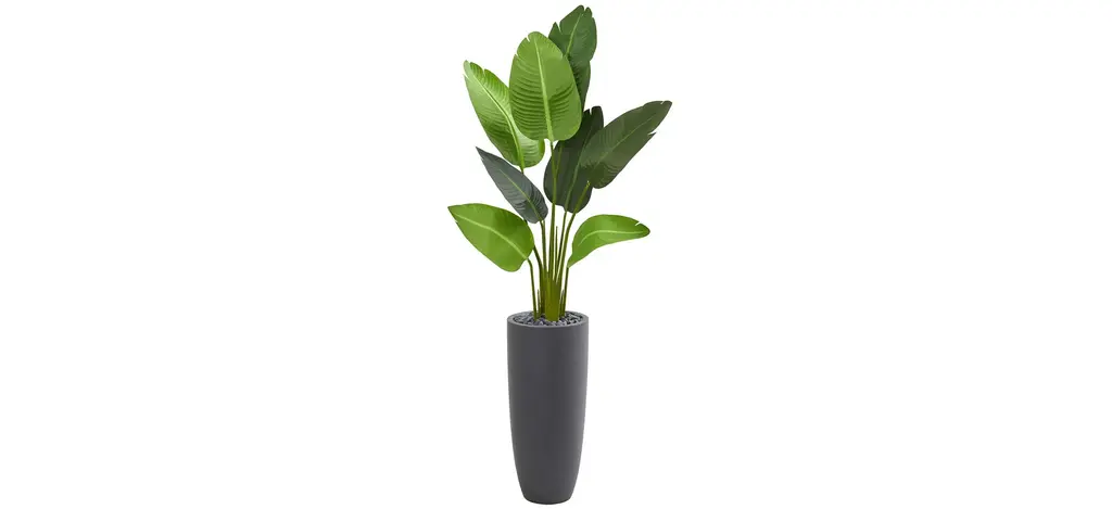 Requiring no maintenance, the artificial traveler's palm tree is a good addition to your sun room's garden arrangement. With beautiful, large green leaves that sprout out from a pure white oval textured planter, the vivid coloring of this ornament will look wonderful in any bright room. When paired with a artificial flowering plant, it'll complement and add balance to the colorful blooms.