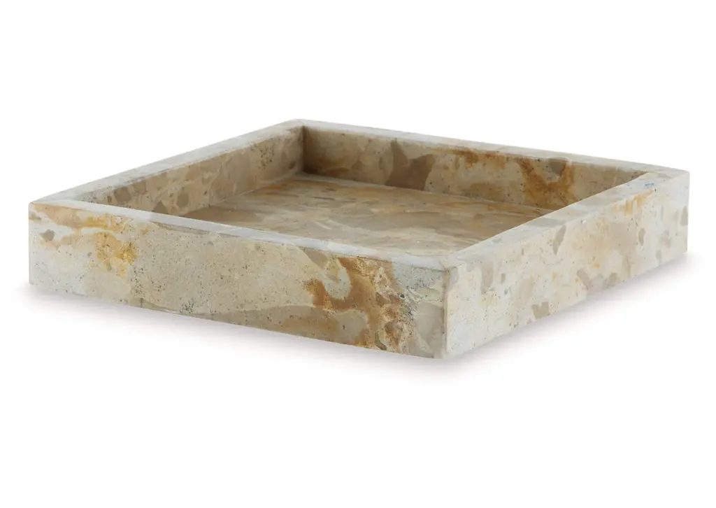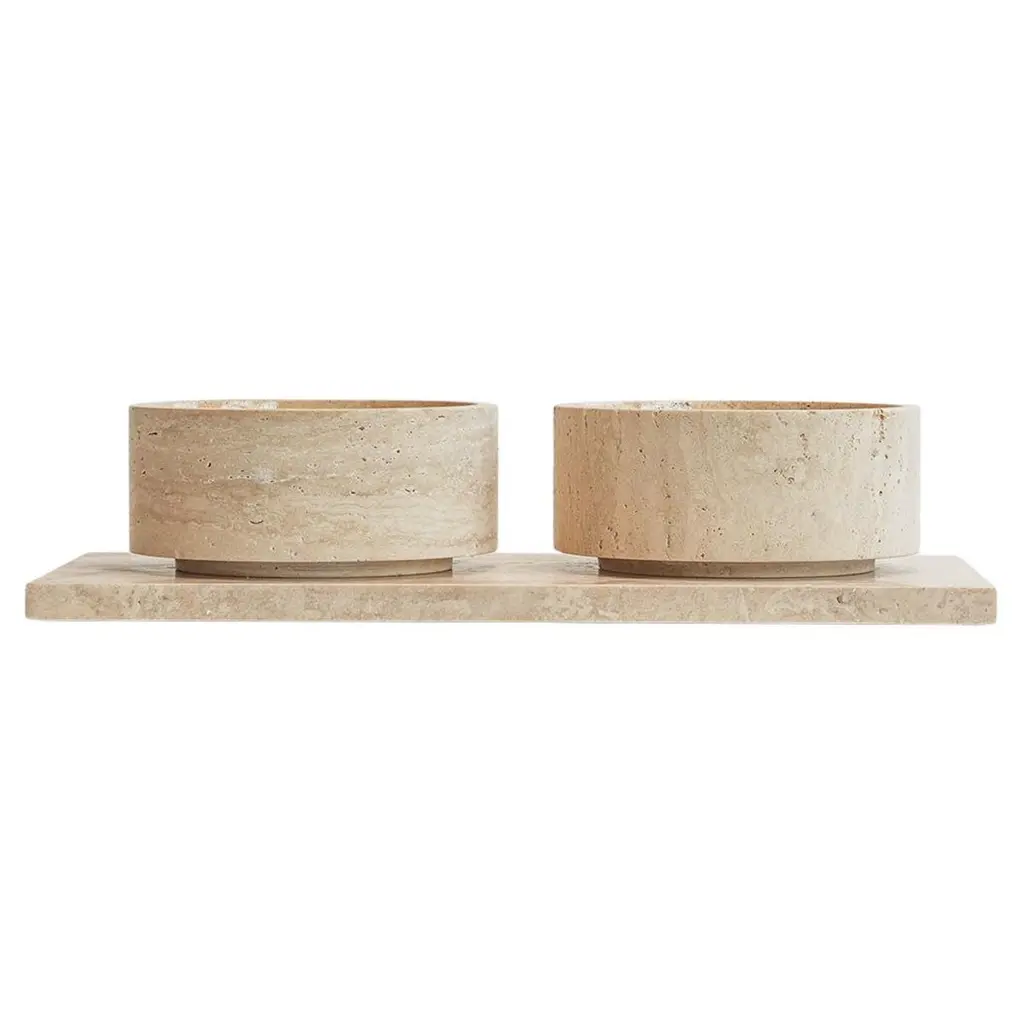 Modeled after a Bronze Age mortar, our exacting reproduction evokes the organic beauty of the original. Set on angular feet, the shallow form is hand-sculpted from honed travertine whose natural variations in tone and texture impart one-of-a-kind character.