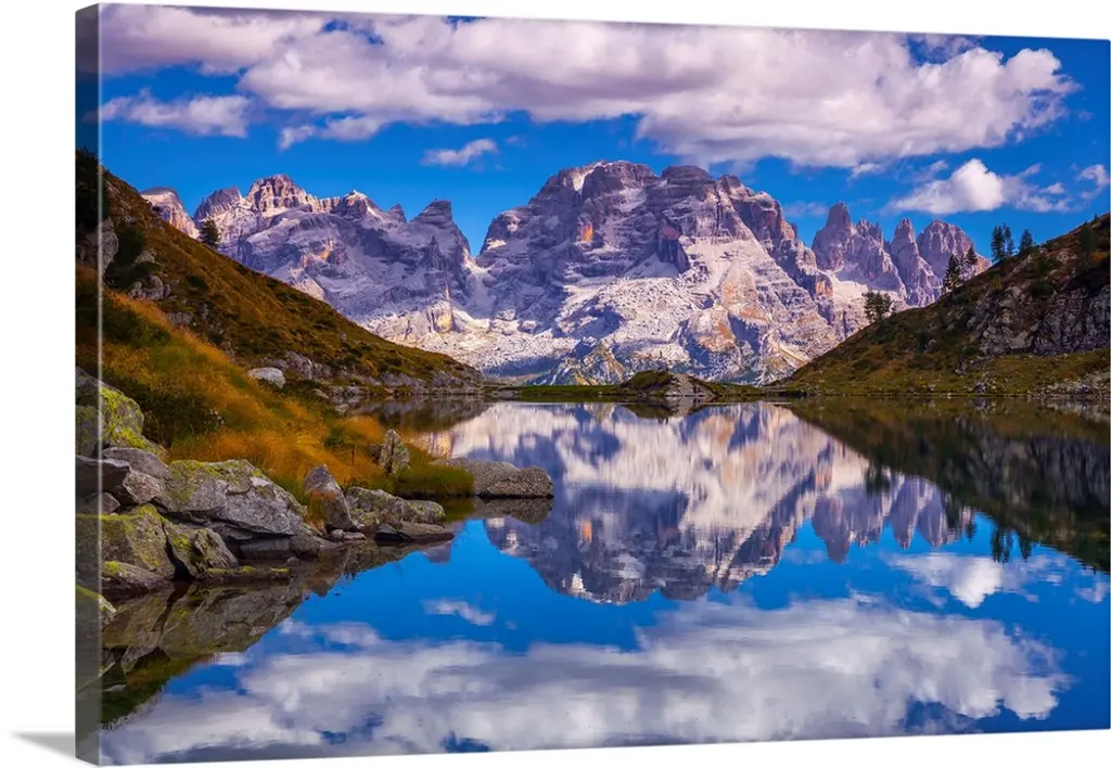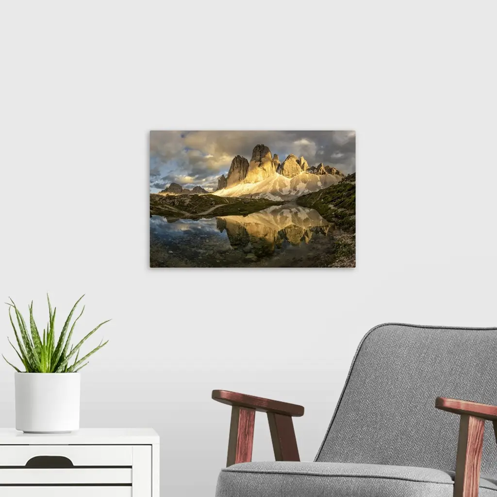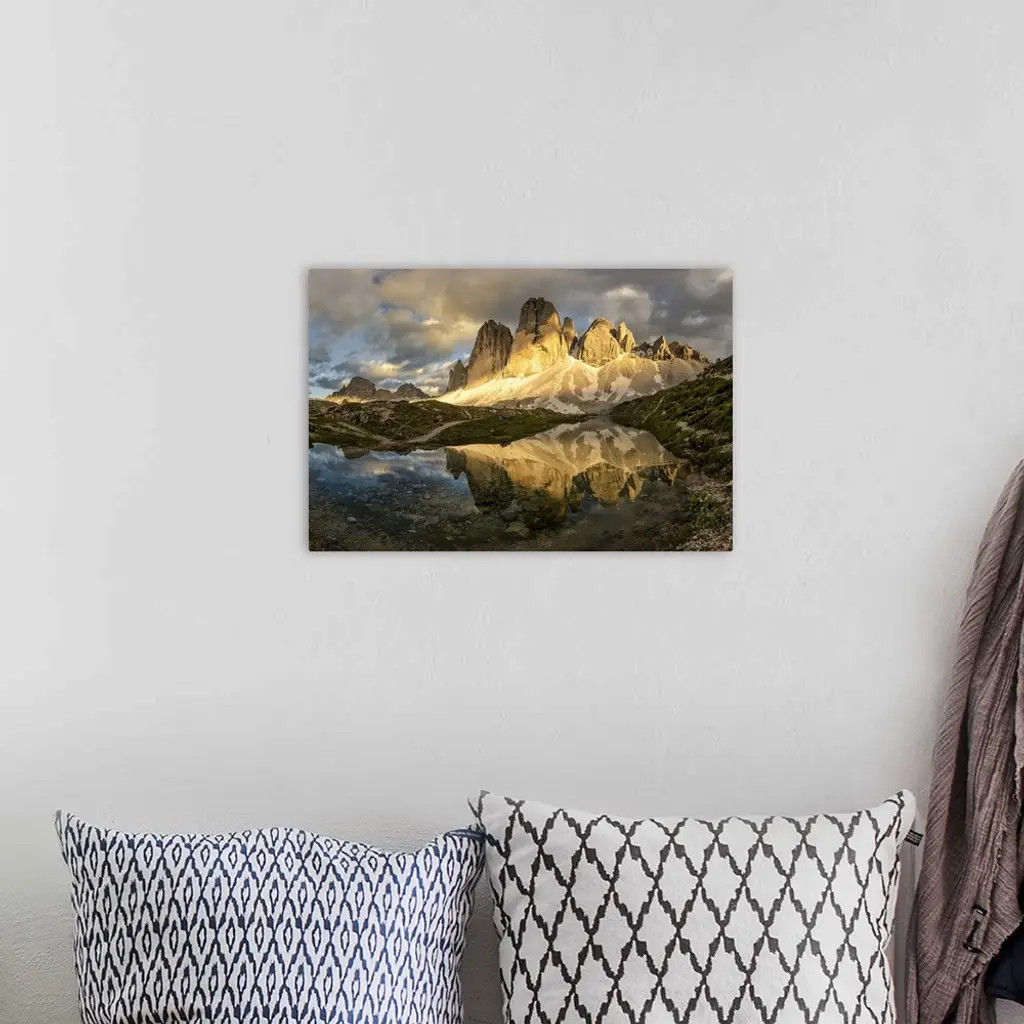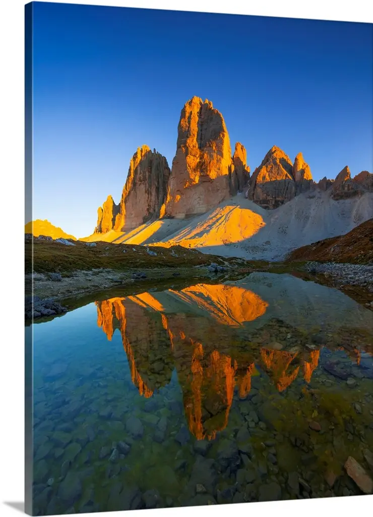 Tre Cime di Lavaredo are reflected in an alpine lake during a sunset with warm light, Dolomiti, Unesco World Heritage Site, belluno province, Veneto, Italy