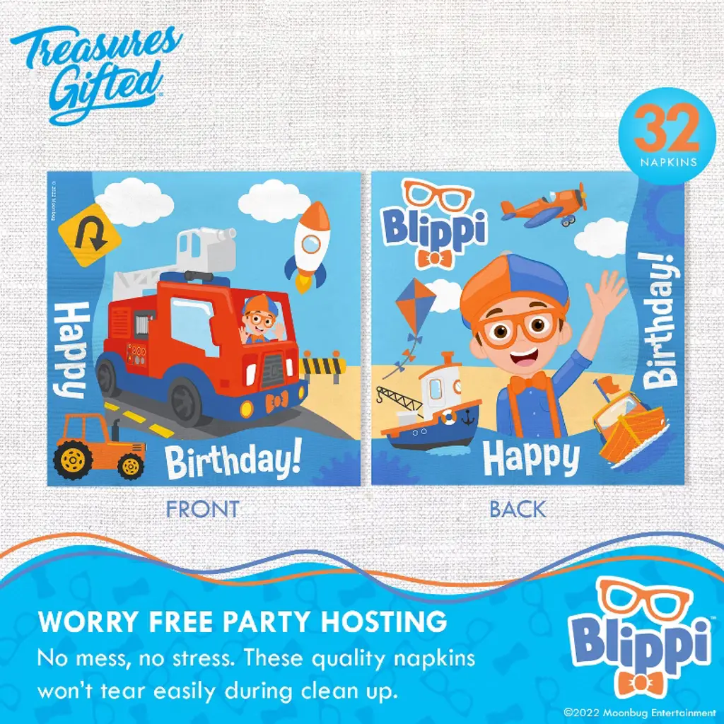 Get the party started with our Blippi party decorations! With its brightly colored design featuring your child's best friend Blippi and all of his favorite vehicles, our high-quality decorations are the perfect addition for creating a Blippi themed celebration. Check out our store for more authentic Blippi birthday party supplies, including backdrops, cake toppers, banners, and more!! This Blippi birthday decorations kit for 24 guests includes: (2) 54in x 108in tablecloth (1) pre-strung happy birthday banner (1) pre-strung pennant banner (24) 9in dinner plates (24) 7in dessert plates (32) 6.5in luncheon napkins (12) latex balloons