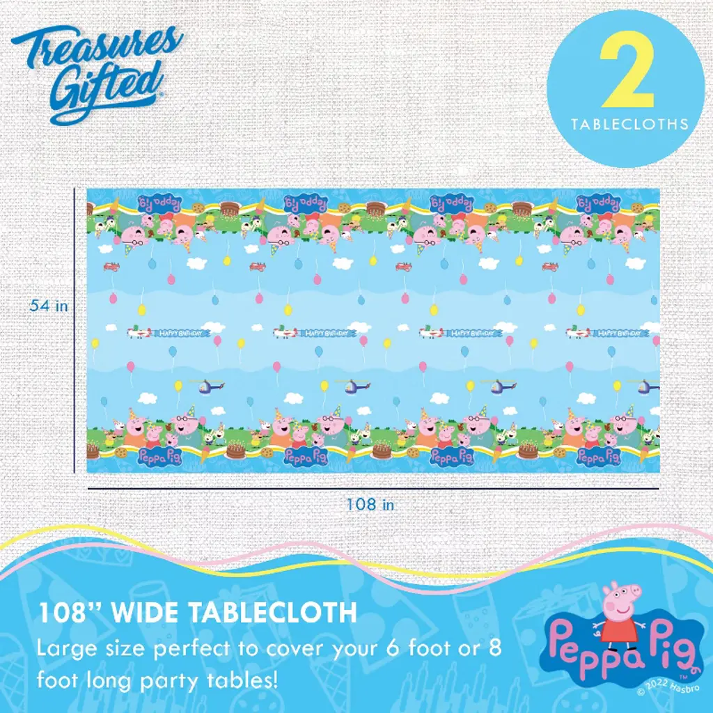 Take your little one's birthday to the next level with our Peppa Pig birthday party supplies! Our decorations feature Peppa Pig and her friends in vibrant colors, creating an adorable and playful atmosphere for your party. We use high-quality materials, so these decorations will last and bring excitement to your child's special day. Check out our store for more authentic Peppa Pig party supplies like balloons, banners, backdrops, and more! This Peppa Pig party kit for 24 guests includes: (2) 54in x 108in tablecloth (24) 9in dinner plates (24) 7in dessert plates (24) 9oz paper cups (32) 6.5in luncheon napkins