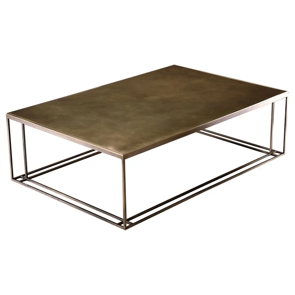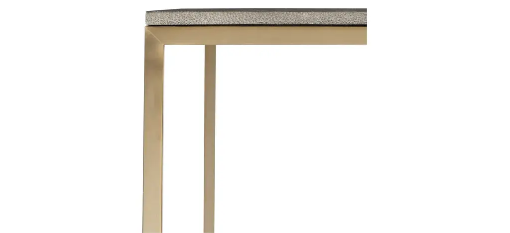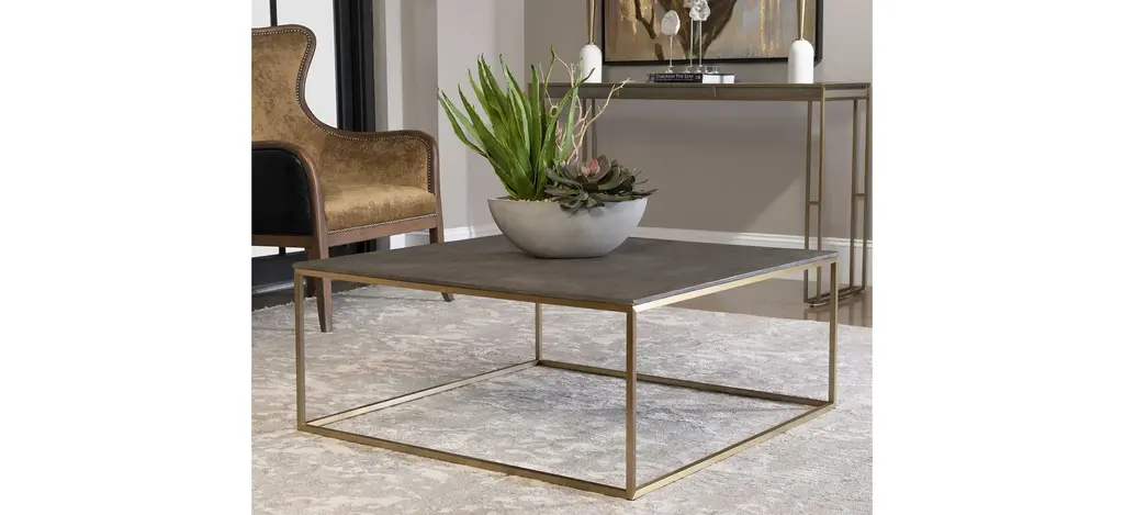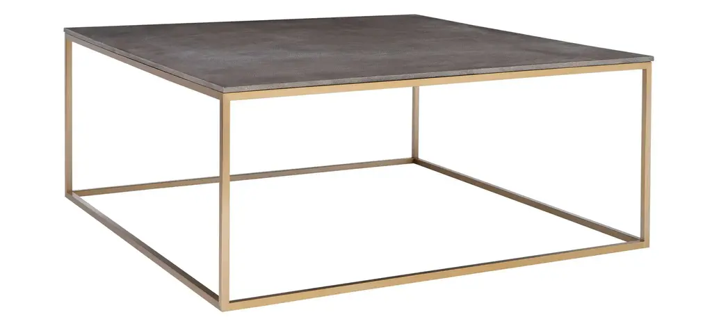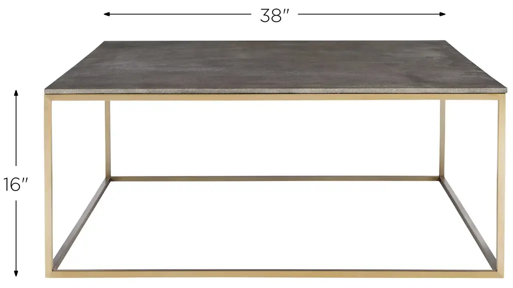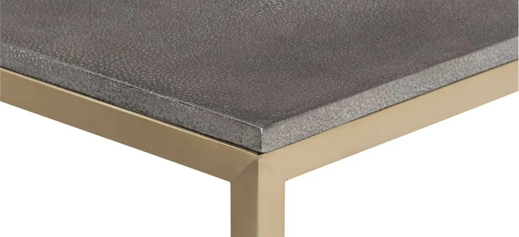 Inspired by modern styling, this Trebon Coffee Table features a beveled faux shagreen wrapped top in charcoal gray paired with a sleek stainless-steel base finished in brushed brass.