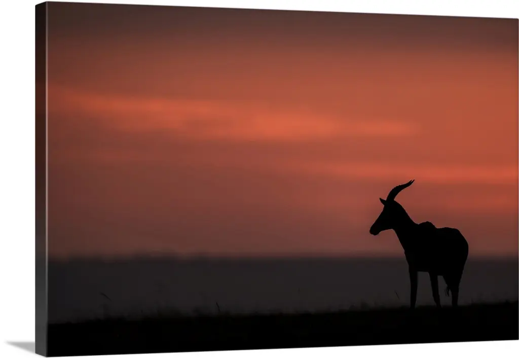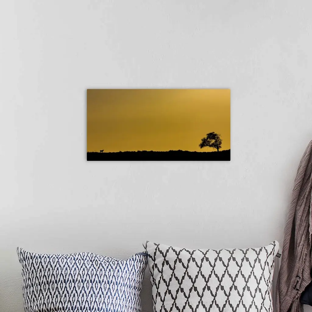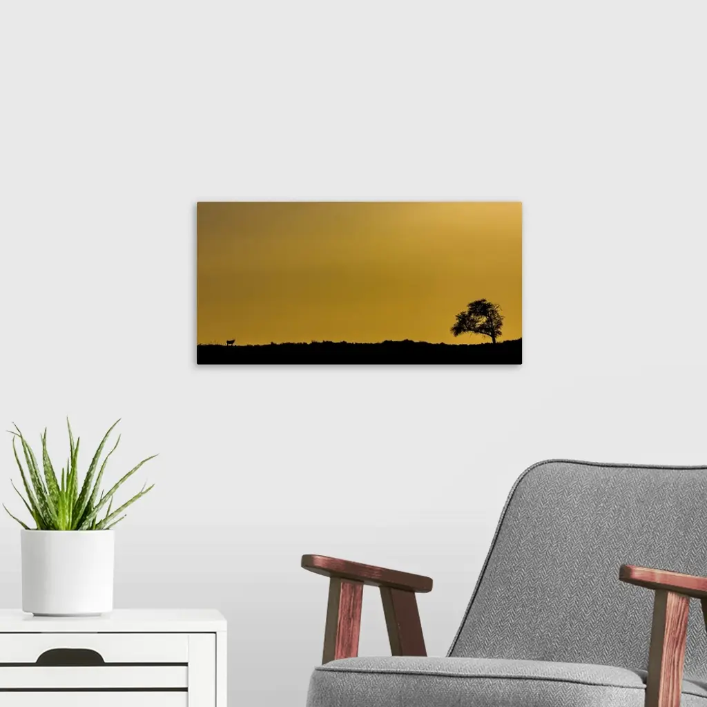 Silhouette of a tree and antelope with a golden sky; Sossusvlei, Hardap Region, Namibia