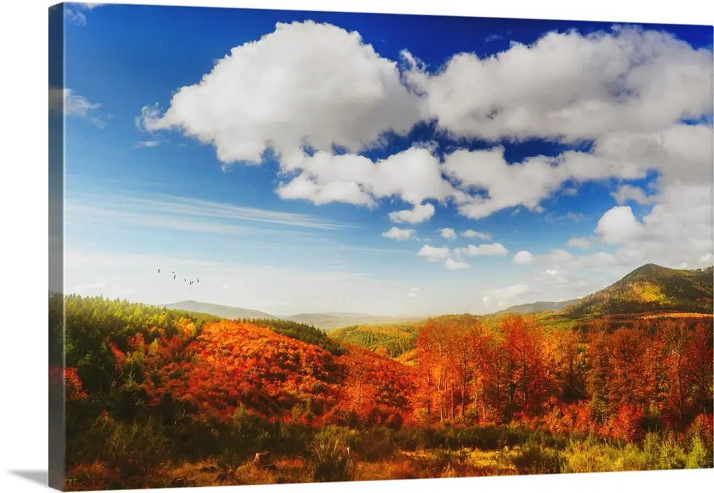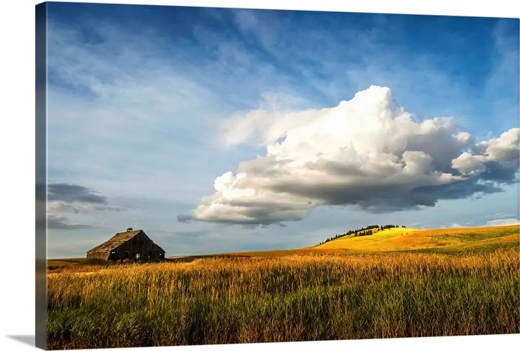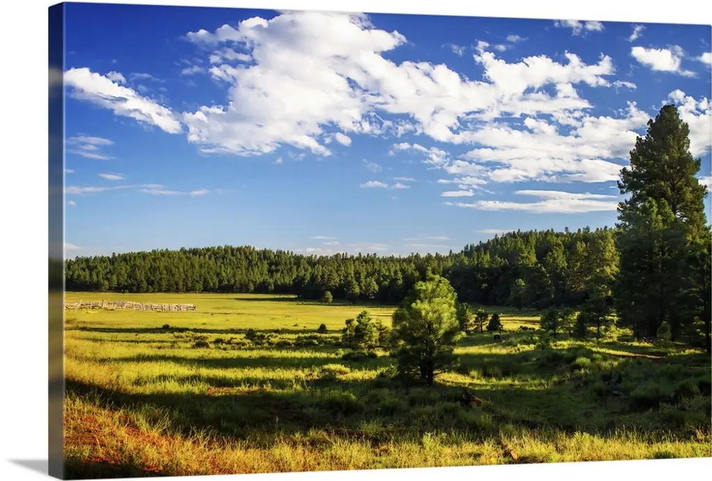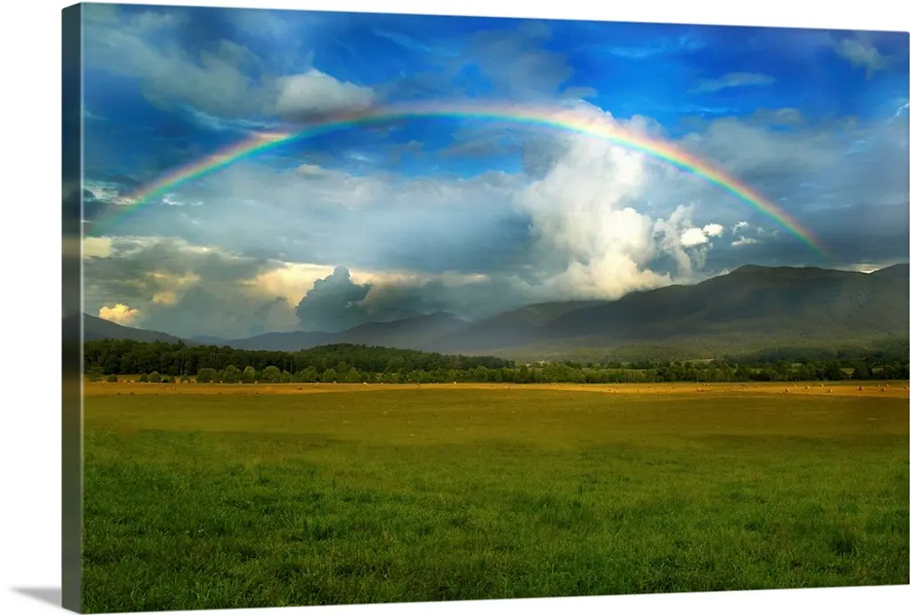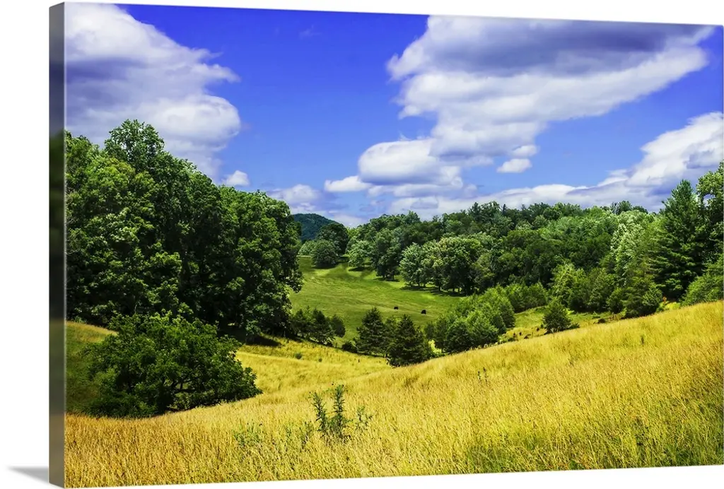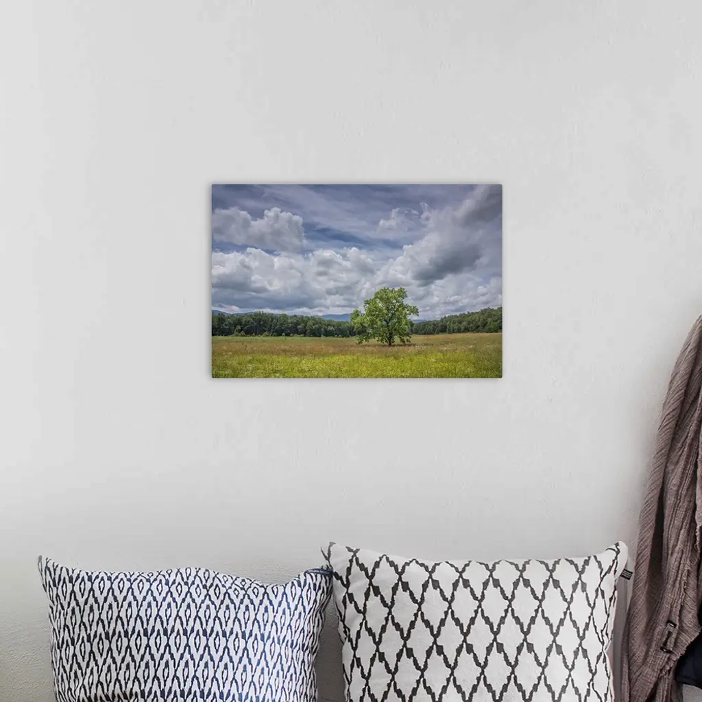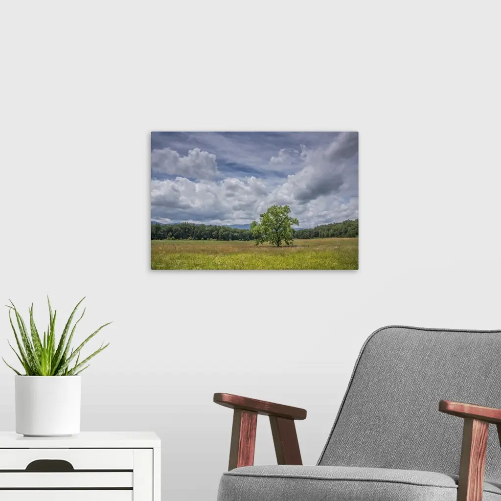 A tree standing in a field under a cloudy sky in the summer, Great Smoky Mountains, Tennessee.