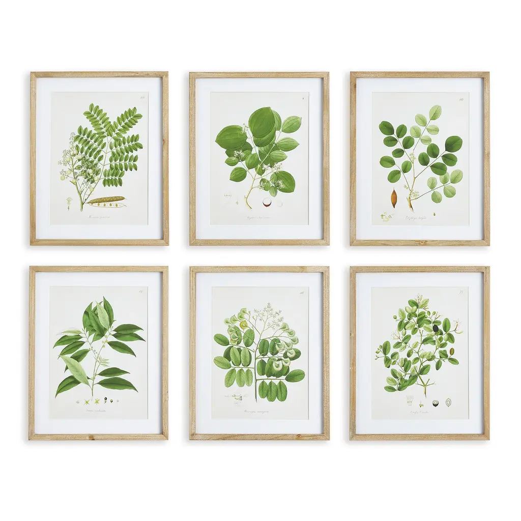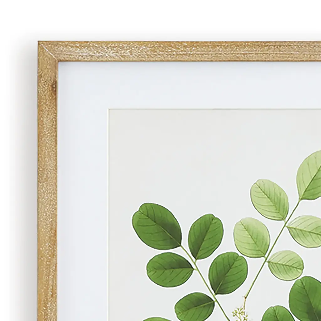 Each with their own signature characteristics, these tree leaf study prints are proof of diversity in nature. The natural wood distressed frames and beveled cardboard mats are a fitting choice for this traditional series.