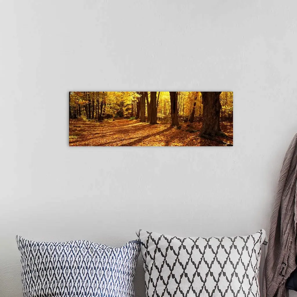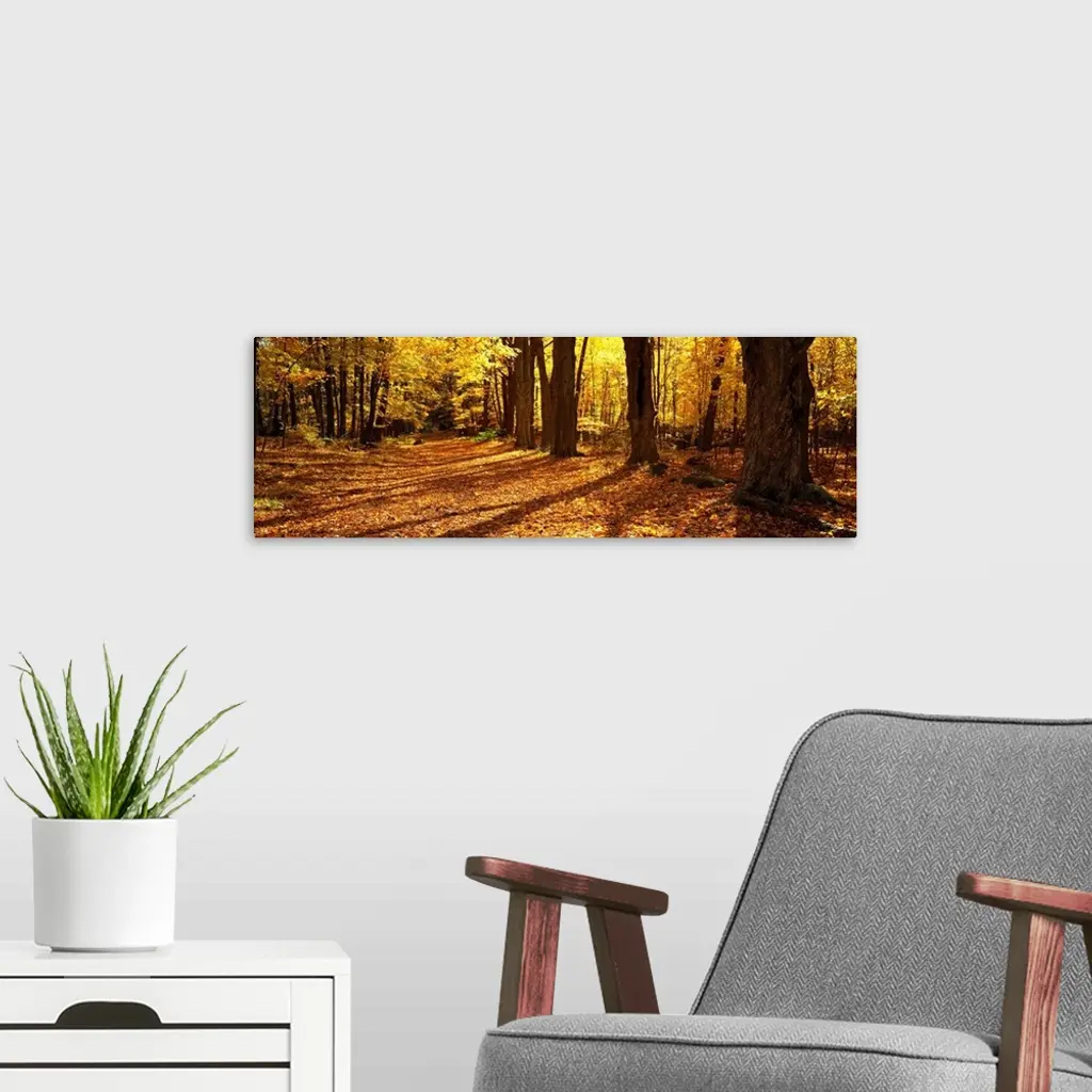 Large canvas print of a road covered in fall leaves and a forest surrounding it.
