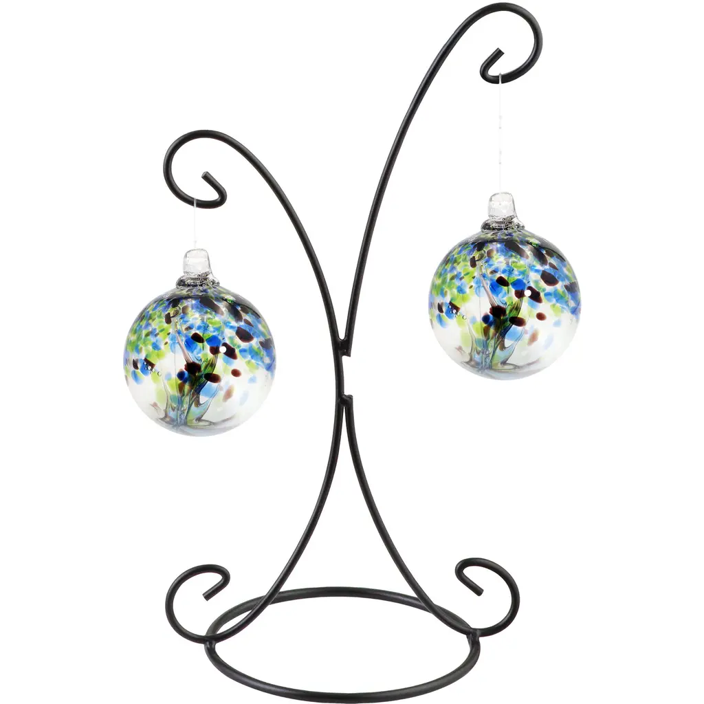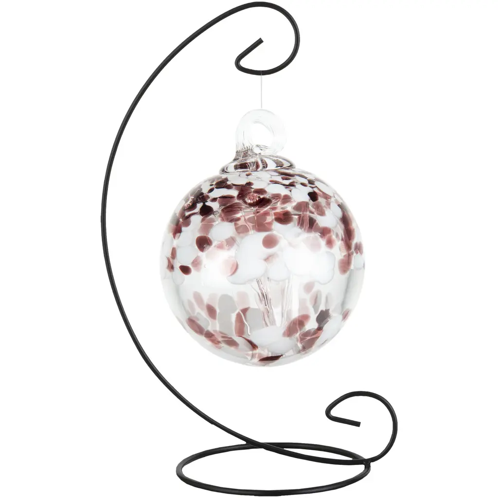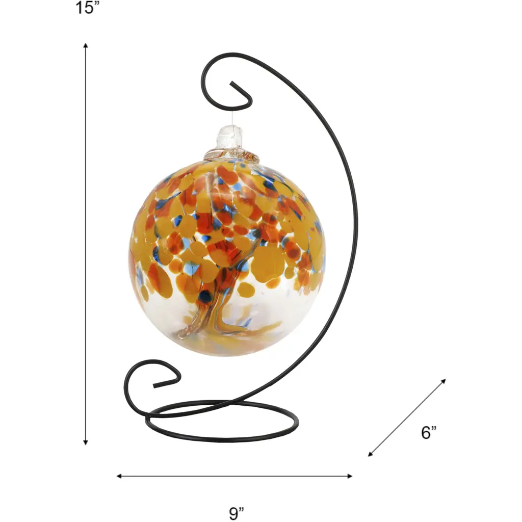 Ignite your surroundings with the "Aura" witch globe gazing ball, a part of Dale Tiffanys Rainbow Tree of Life series, where the fiery energy of hand-blown art glass comes to life. This 6-inch diameter globe is a vibrant spectacle, adorned with a lively pattern of orange and amber tones that seem to dance across its surface, complemented by specks of blue that add depth and contrast. It dangles elegantly from a beautifully crafted black hanging stand, forming a floating beacon of warmth and creativity. This gazing ball is perfect for those seeking to introduce a bold statement piece into their home, promising to cast a radiant glow and capture the eye of any admirer.