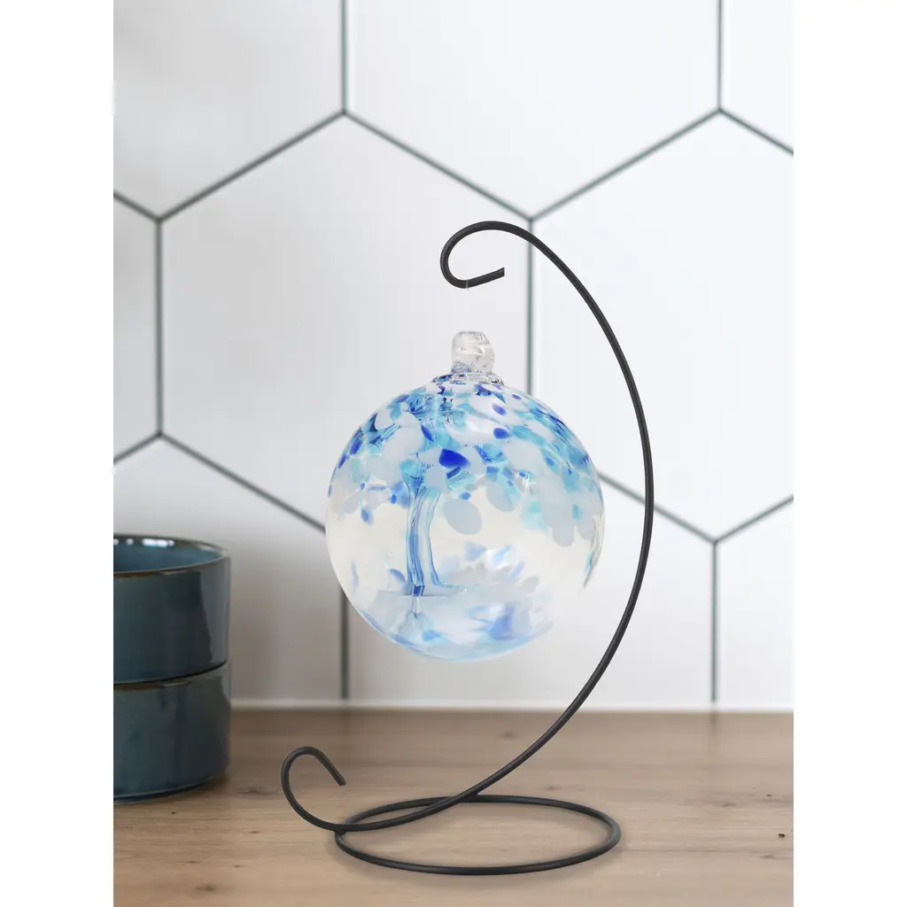 The "Aqua" witch globe gazing ball from Dale Tiffany's Rainbow Tree of Life collection is a testament to the tranquil beauty of hand-blown art glass. This delicate 3-inch diameter globe is a swirl of serene aqua and soft blue shades, evoking the peaceful essence of water and sky. Each globe is a unique creation, with subtle variations in color and form that make it a one-of-a-kind piece of art. Cradled by an elegantly swirling black metal stand, this gazing ball brings a touch of calm and sophistication to any setting, perfect for enhancing the ambiance of a quiet nook or becoming a standout piece in any room's decor.