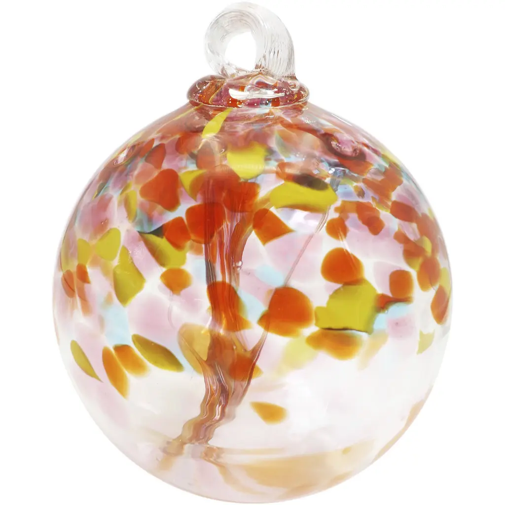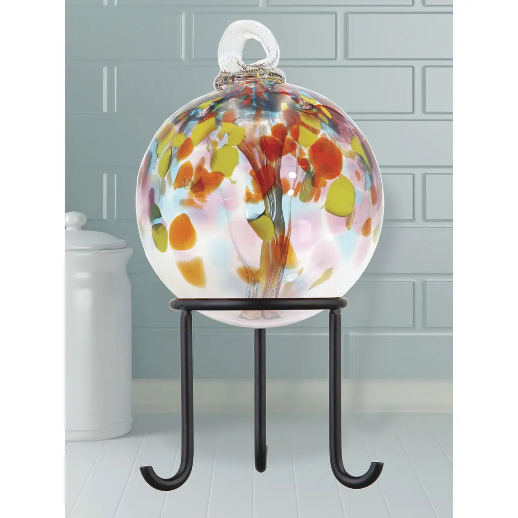 Dale Tiffany Rainbow Tree of Life Hand Blown Art Glass Ornament Witch Globe Gazing Ball is a captivating 4-inch diameter ornament featuring a vibrant, multicolored tree of life design swirling with orange, yellow, pink, and aqua hues against clear glass. Meticulously hand-blown for a unique, three-dimensional effect, this enchanting piece can be hung as an ornament or displayed on its included sleek black metal stand as a mesmerizing gazing ball or tabletop accent, perfect for adding a touch of artisan craftsmanship to your seasonal or year-round home decor.