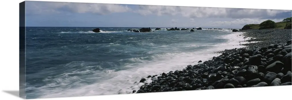Panoramic photograph of rocky shoreline with breaking waves and one tall tree under a cloudy sky.