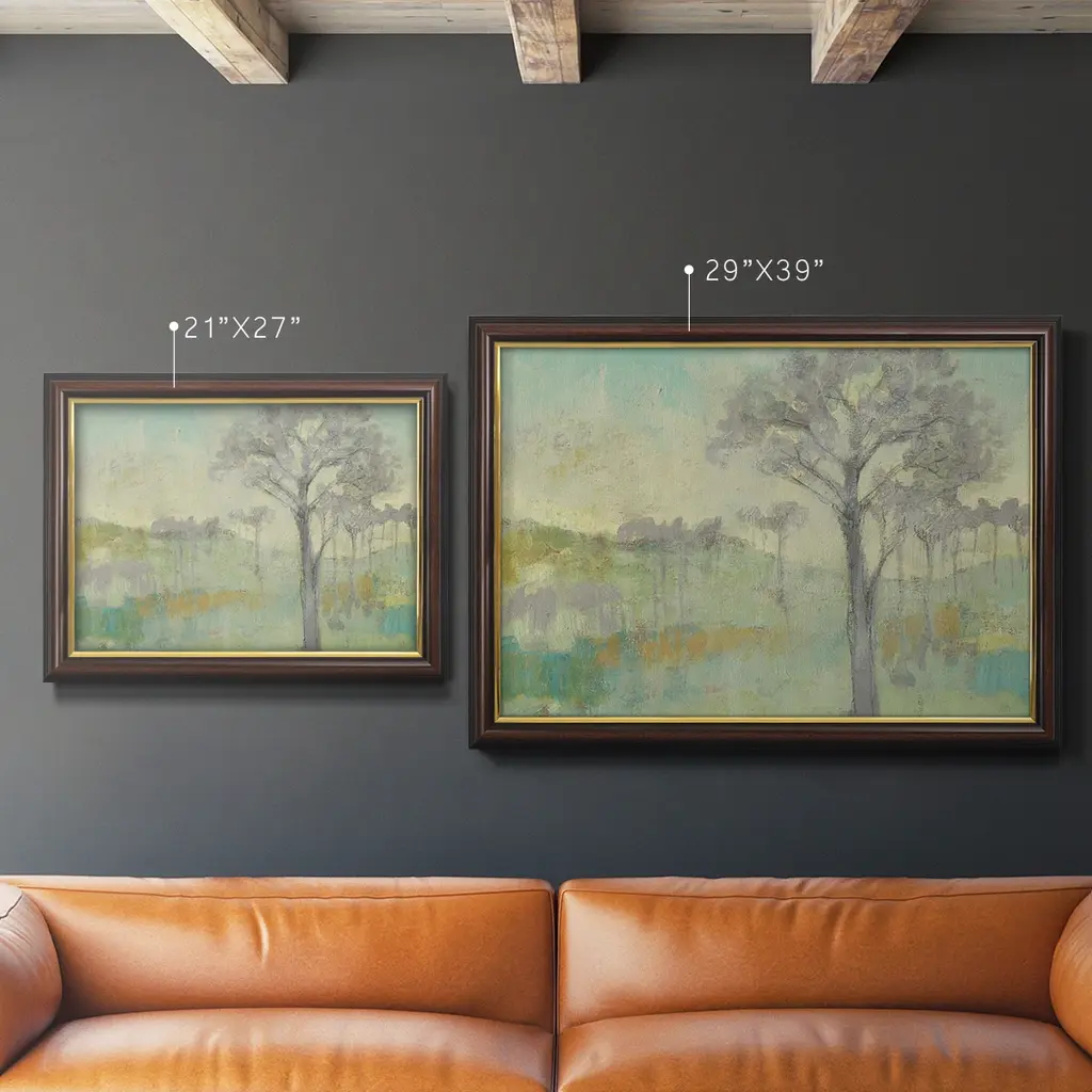 Tree Stand I Premium Framed Canvas- Ready to Hang A Premium Framed Canvas created to last. Framed in distressed wood and available in an array of sizes and colors Featuring a beveled a solid wood stretcher bar, each piece comes ready to hand 3 SIZES AVAILABLE 16''X20'' - Overall Size 18'X27'' - Overall Size 24''x36'' - Overall Size Each piece is made to order. Each piece comes with hanging hardware. Made in the USA Ready to Hang Giclee Paper Print Acrylic Glass Beveled Matt Board
