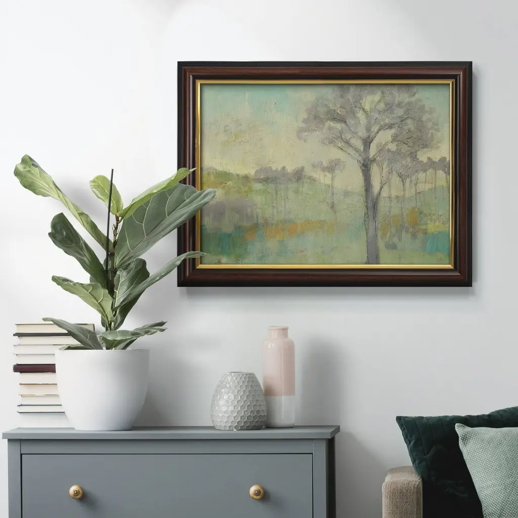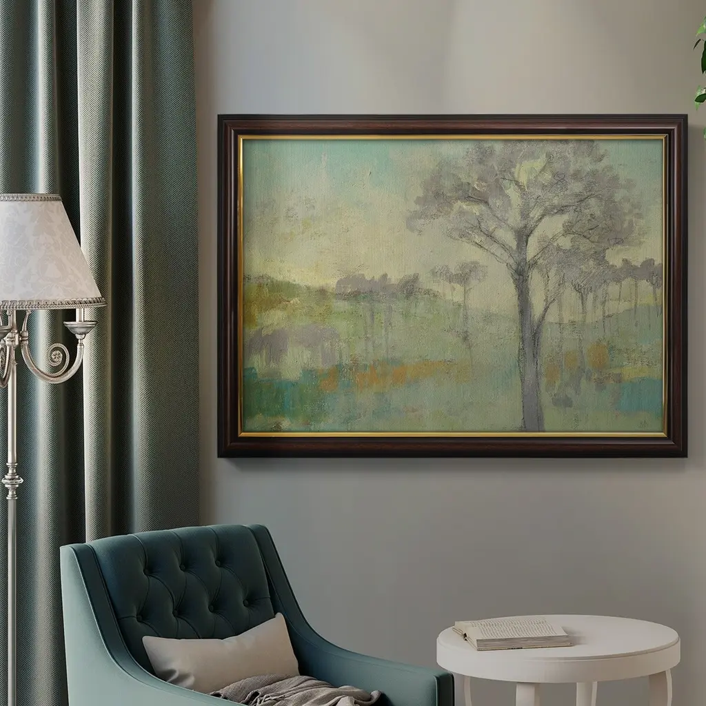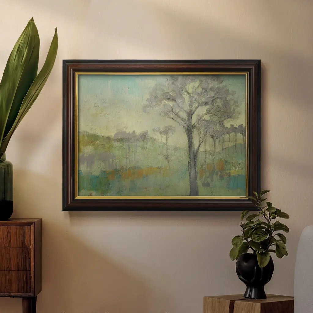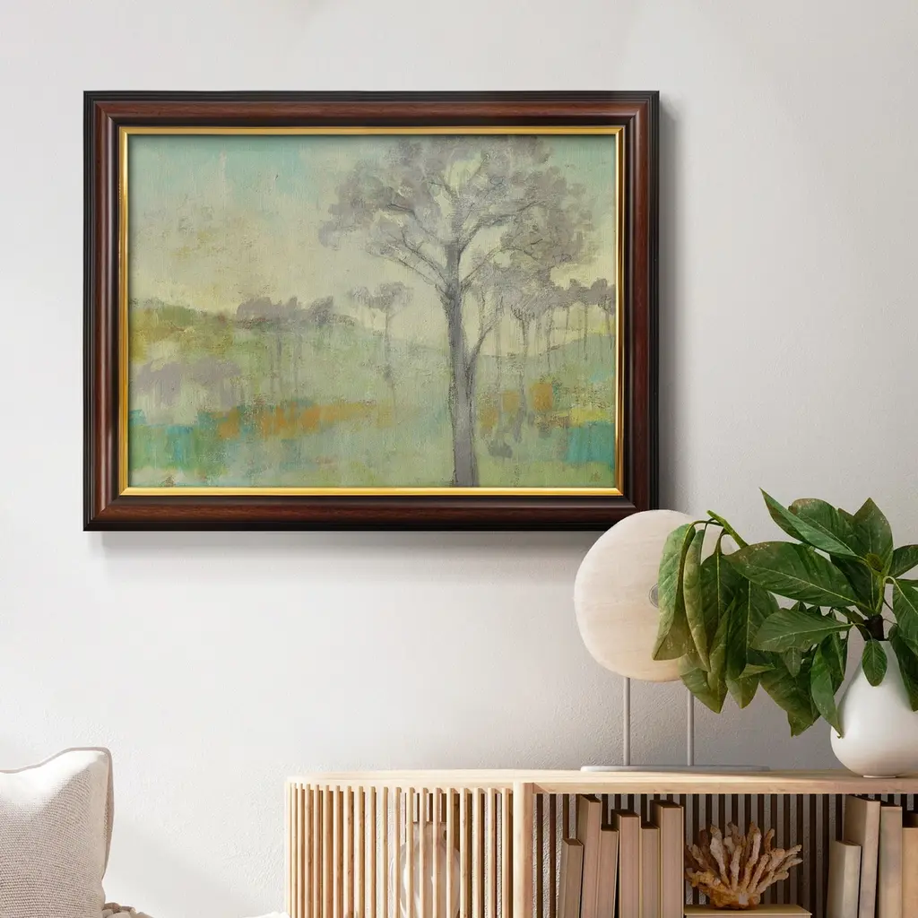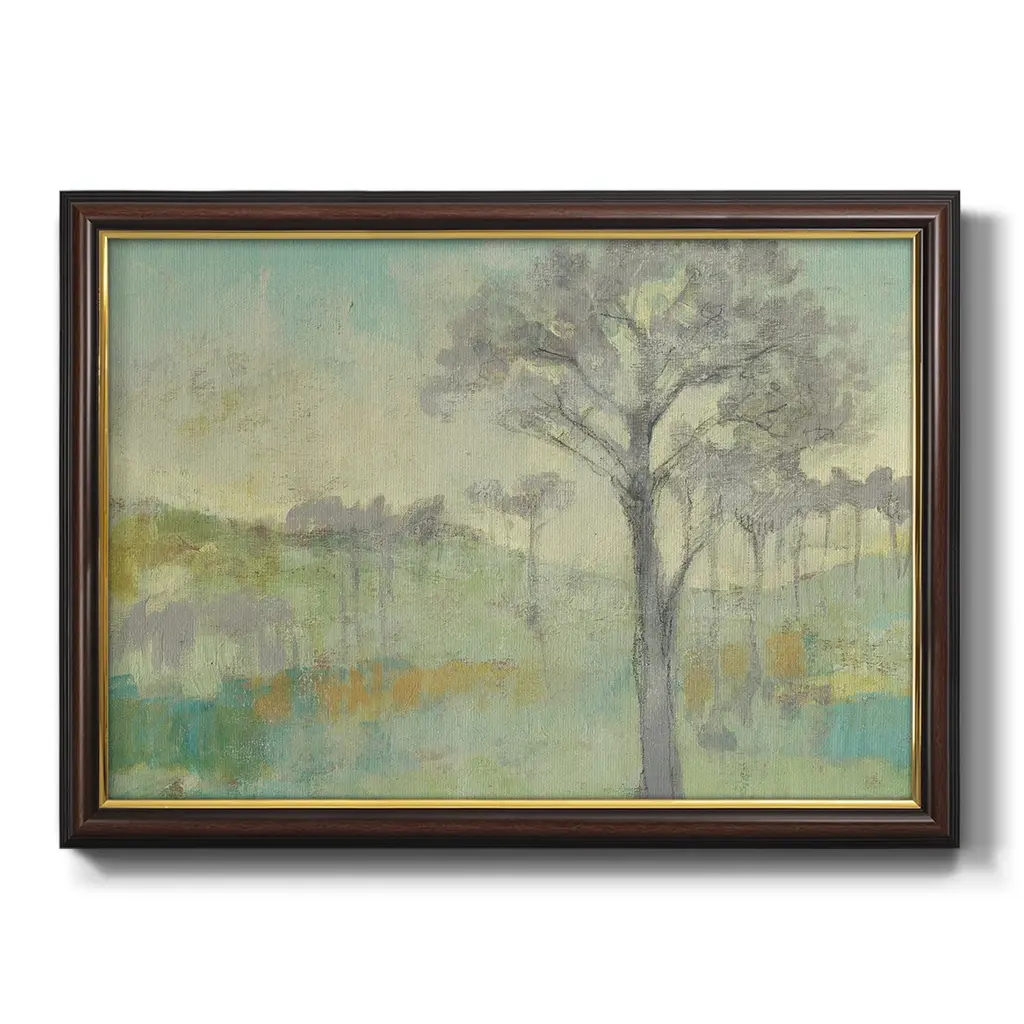 Tree Stand I Premium Framed Canvas- Ready to Hang A Premium Framed Canvas created to last. Framed in distressed wood and available in an array of sizes and colors Featuring a beveled a solid wood stretcher bar, each piece comes ready to hand 3 SIZES AVAILABLE 16''X20'' - Overall Size 18'X27'' - Overall Size 24''x36'' - Overall Size Each piece is made to order. Each piece comes with hanging hardware. Made in the USA Ready to Hang Giclee Paper Print Acrylic Glass Beveled Matt Board