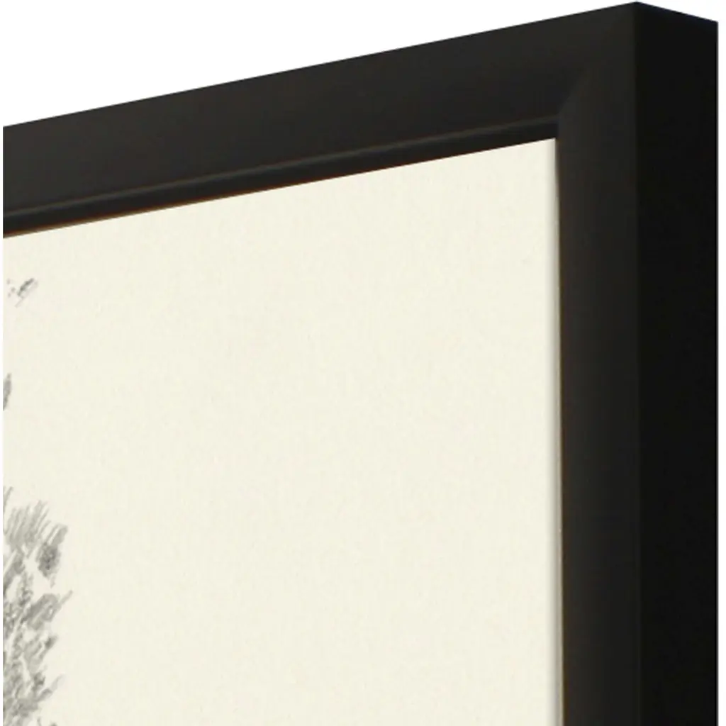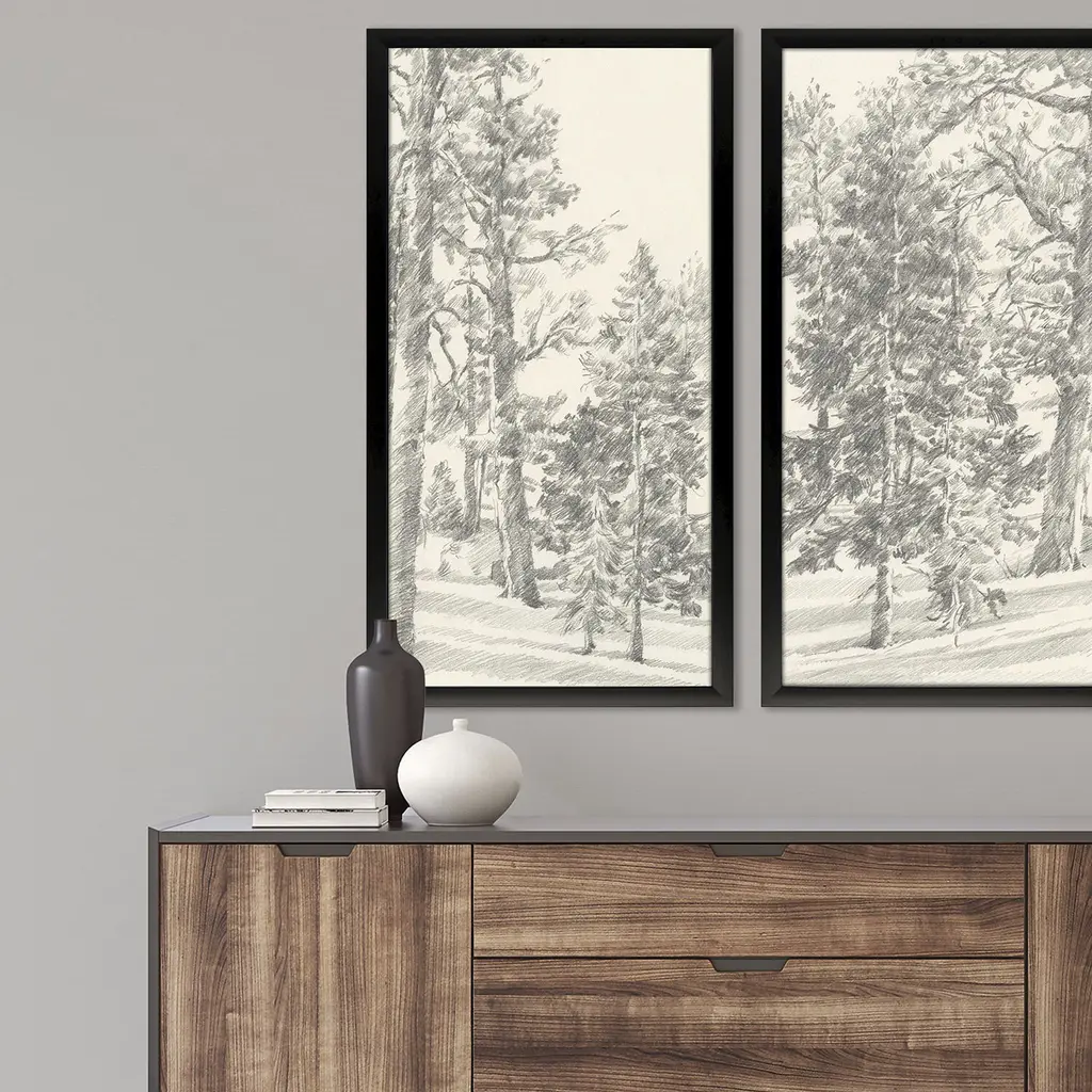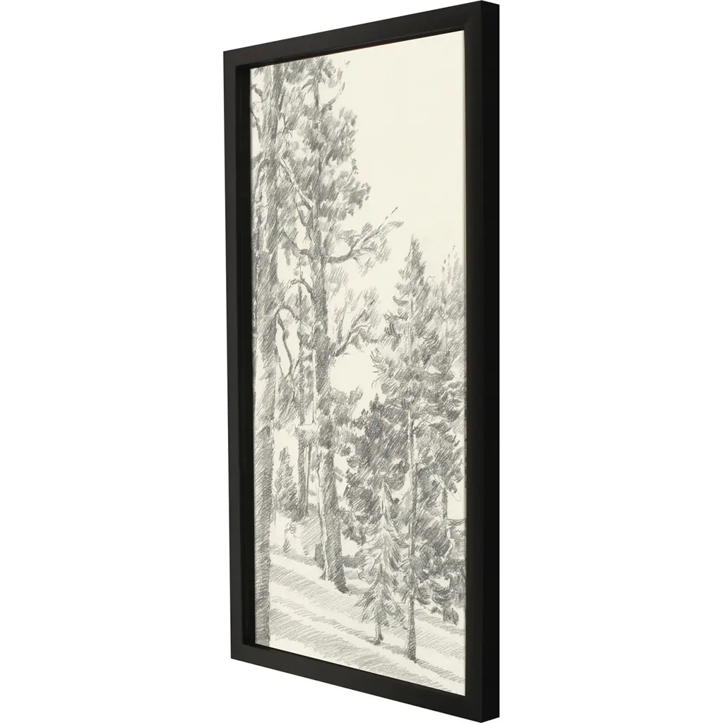 A serene northwestern forest scene in black and beige is framed in a matte black shadow box style moulding.