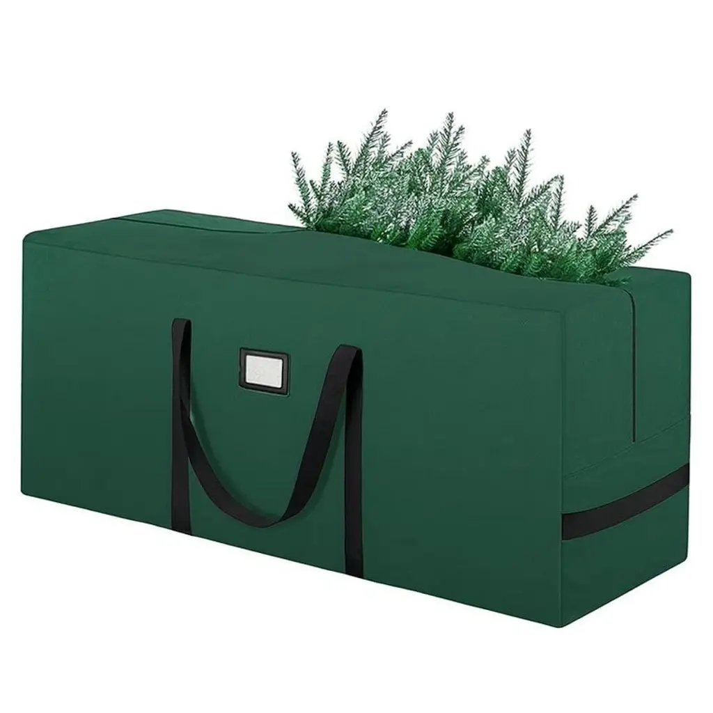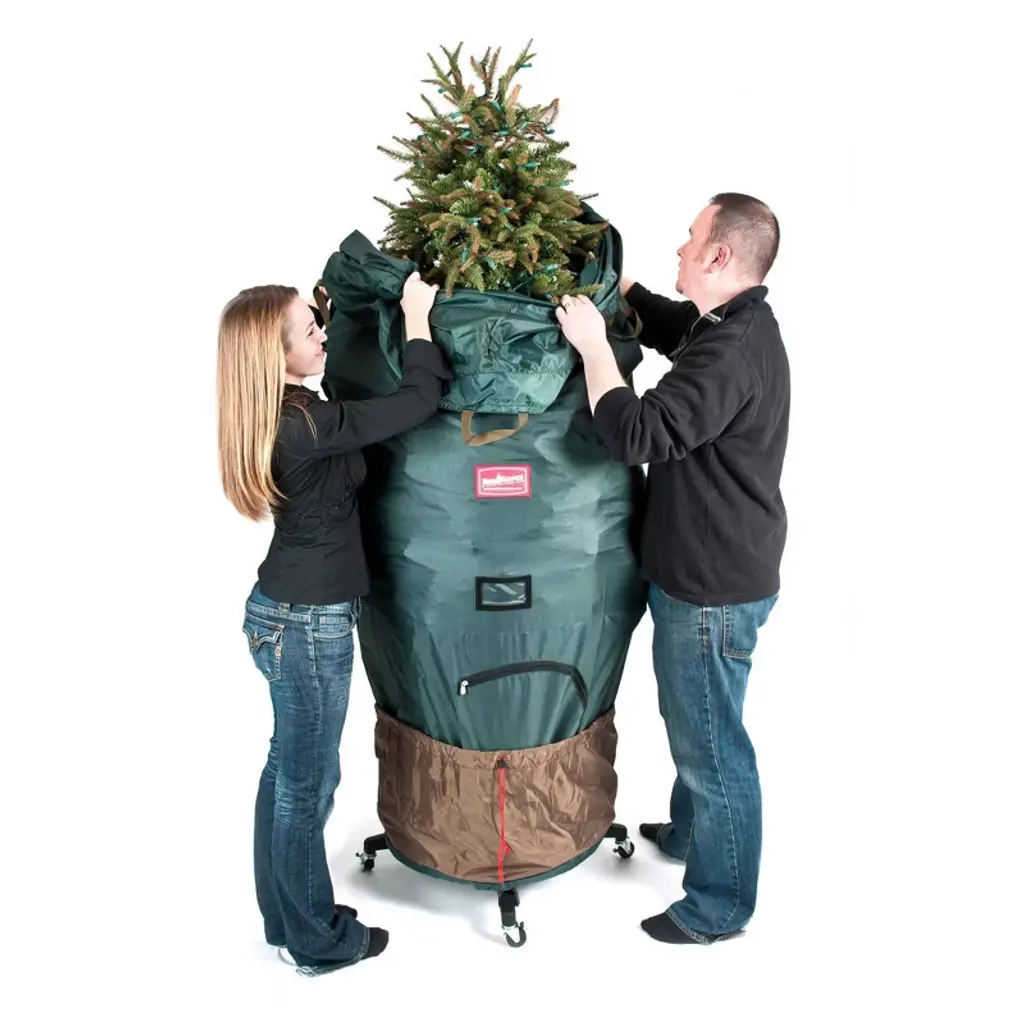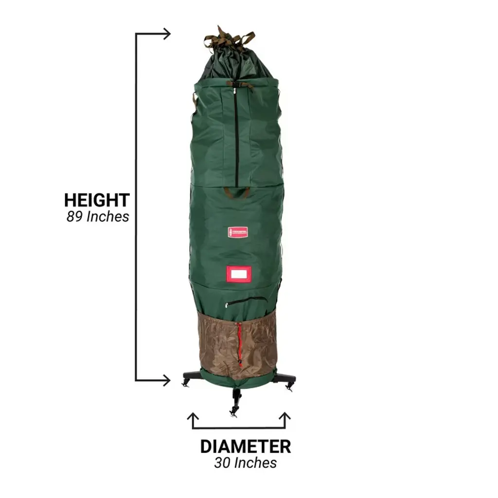 We understand your frustration with your artificial Christmas tree. Each year, set up and take down of your tree tests your patience as you assemble each section and try to find the plugs to make all the lights work. You force a large tree into a cardboard box that is too small to fit your Christmas tree, and break your back carrying the box in and out of storage. This repeated assembly and disassembly, along with that taped together cardboard box, shortens the lifespan of your Christmas tree. The good news is that it doesn't have to be this difficult or time consuming. The upright tree storage bag is perfect for artificial Christmas trees that are 7.5ft. tall or less. Storing your tree upright allows you to keep your tree assembled, already cutting your setup and take down time in half. Pair that with the space-savings you'll have from storing your tree vertically, with the use of the included rolling tree stand so you can wheel your bagged tree into storage, and suddenly the task you once hated becomes a whole lot easier. Next year, when set up your tree, simply bunch the bag up at the base of your tree, securing it in The attached tree skirt, and your storage bag will be discreetly hidden from sight as if it weren't even on the tree to begin with. A Patented Product: Patent(s) 7,694,494 and 7,775,360