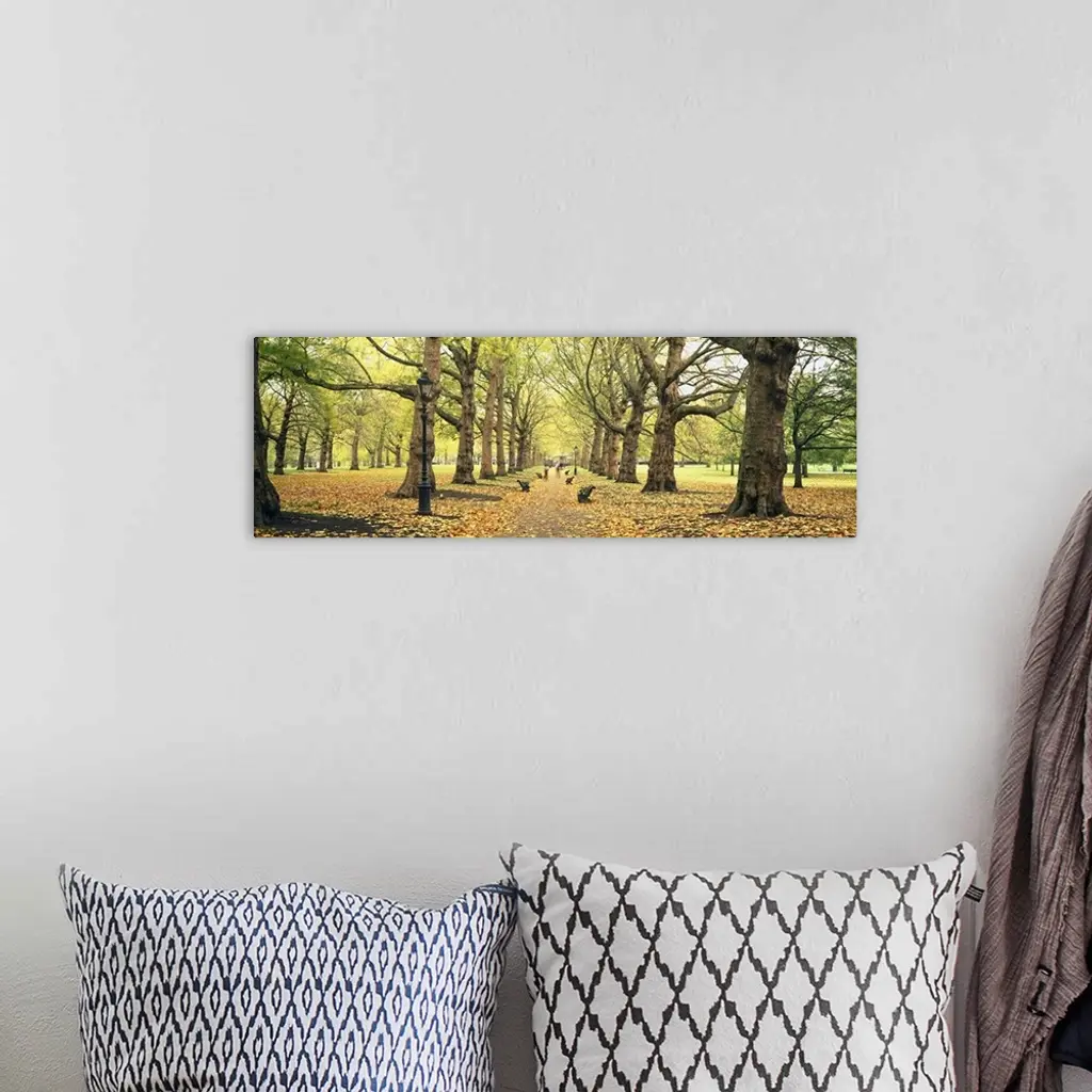 This panoramic picture is of a walking path in a park with large trees lining the path and leaves covering the ground.