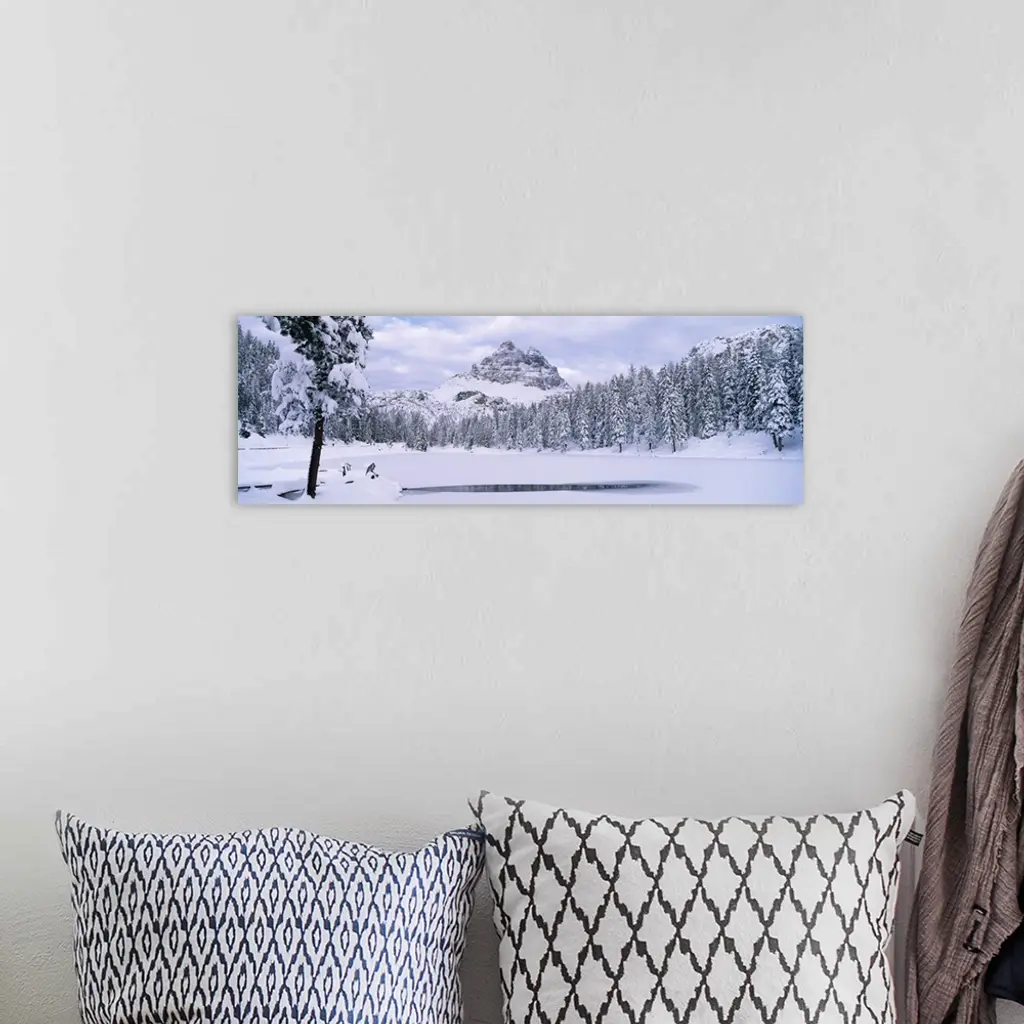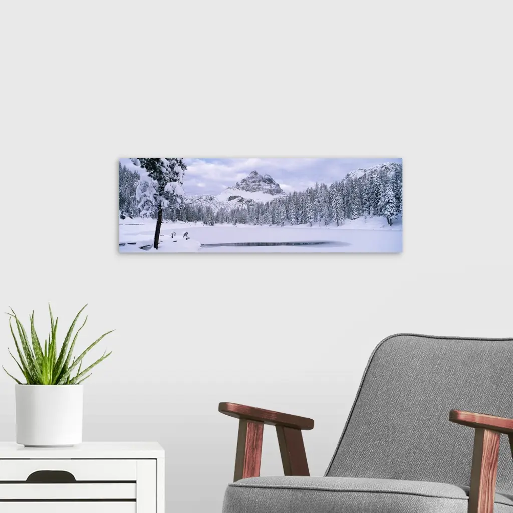 Trees along a frozen lake, Lake Antorno, Tre Cime Di Lavaredo, Dolomites, Cadore, Province of Belluno, Veneto, Italy wall art for home and office decor. Discover canvas art prints, photos, mural, big canvas art and framed wall art in GreatBigCanvas.com's varied collections.
