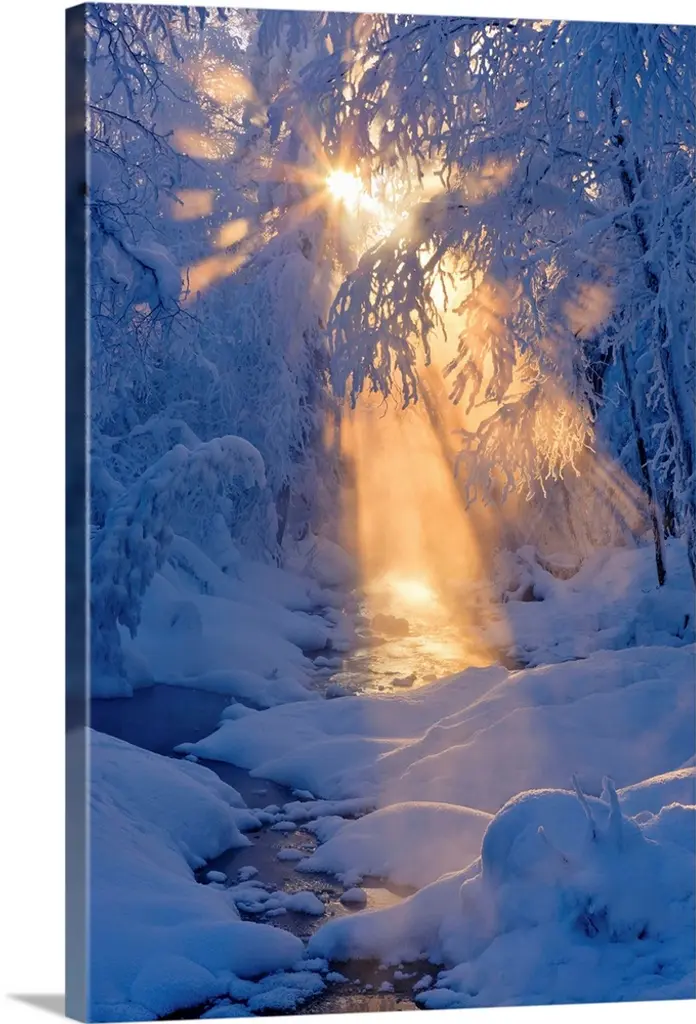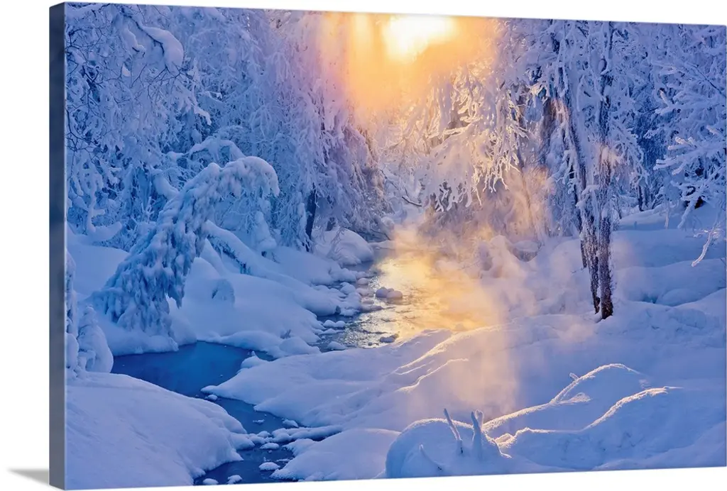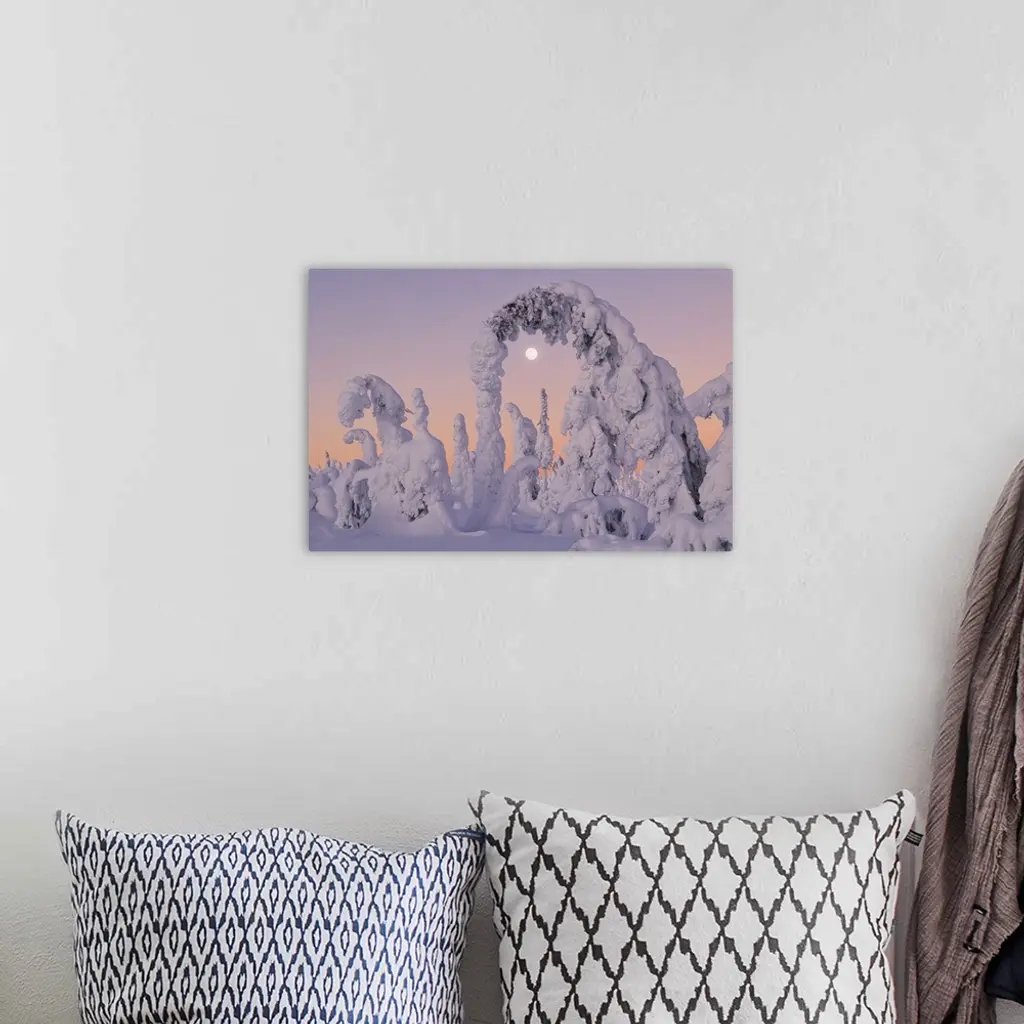 Trees Covered With Snow At Dawn With A Full Moon In Background, Lapland, Finland