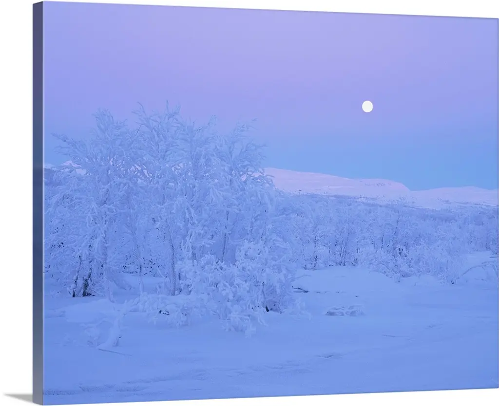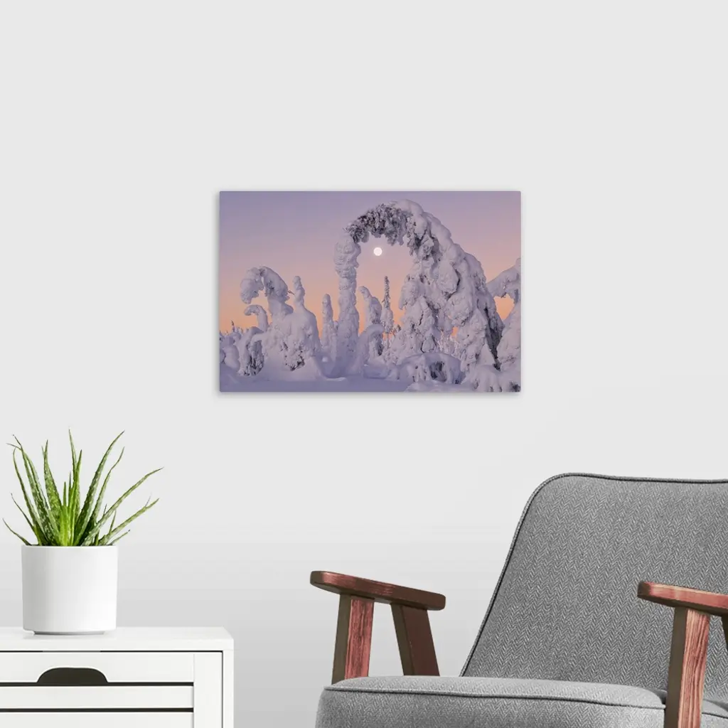 Trees covered with snow at dawn with a full moon in background, Riisitunturi National Park, Posio, Lapland, Finland