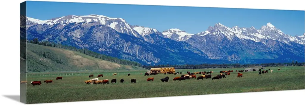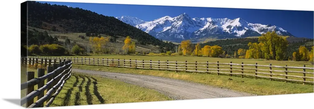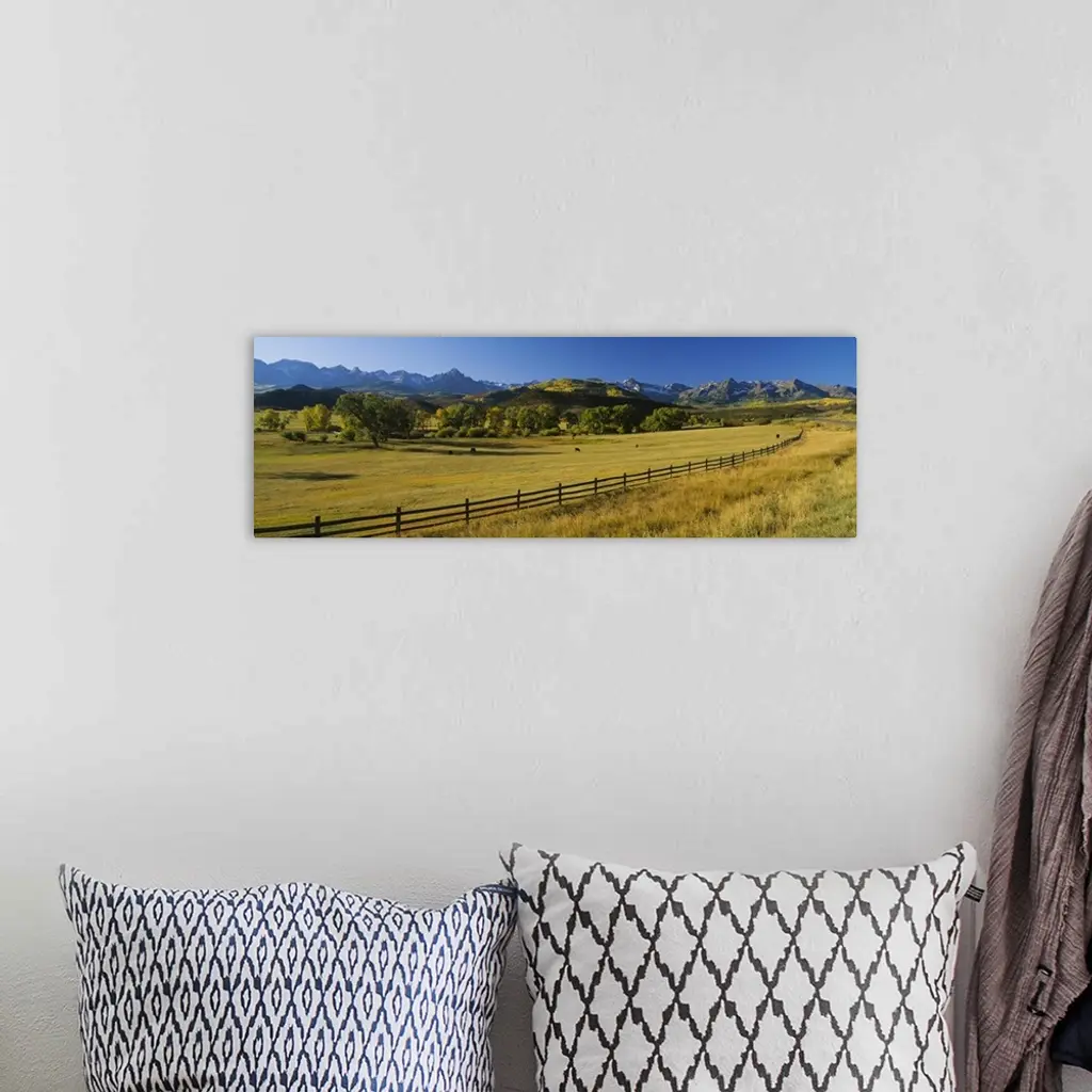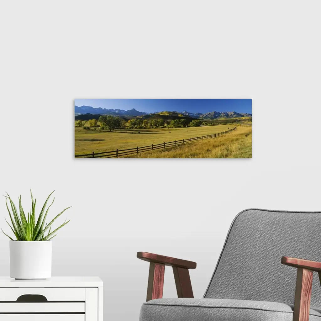 Wide angle photograph on a giant canvas of a wooden fence running alongside an vast field with trees and grazing cattle. Mountains can be seen on the distance horizon, beneath a blue sky in Colorado.