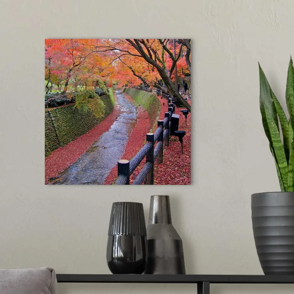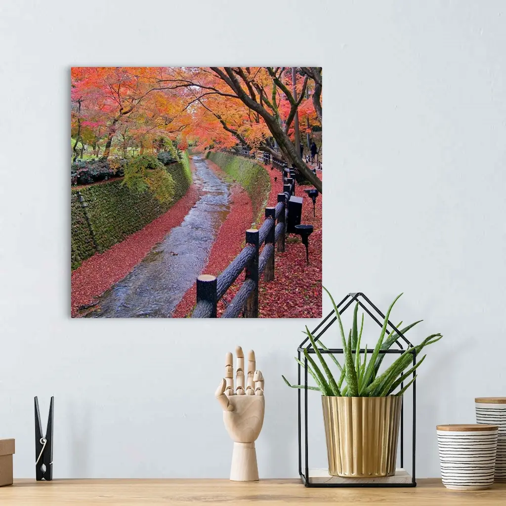 Trees with autumn colors along bending river in Kyoto with red leaves scattered along riverside.
