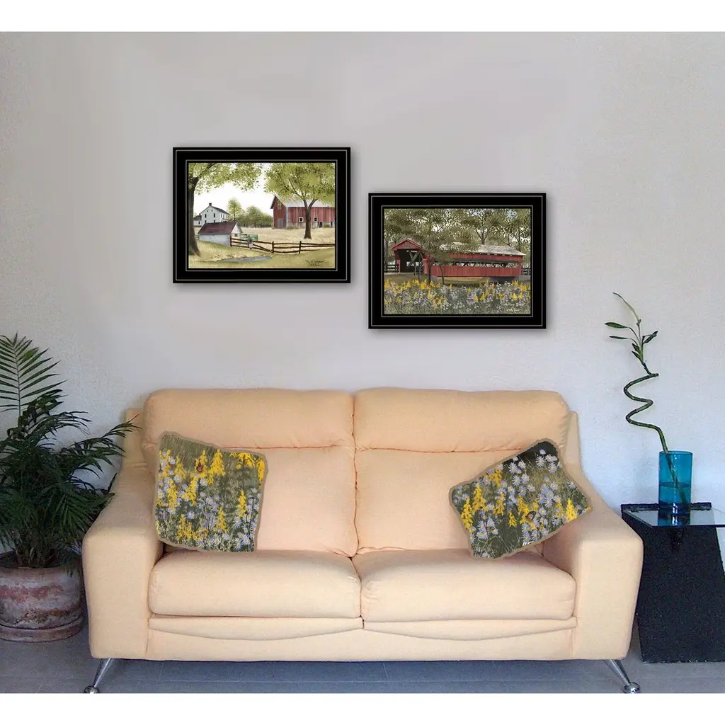 V622-704G "The Spring House" vignette by artisan Billy Jacob. This 2 piece black framed vignette(2-19x15) of the old spring House and Pottersburg Bridge framed prints. A beautiful red covered bridge with flowers and a walk across. The spring house and farm reminds us of our grandparents homestead. The surface of the print is textured with a fade resistant coating so no glass is necessary. Arrives ready to hang. Made in the USA by skilled American workers.