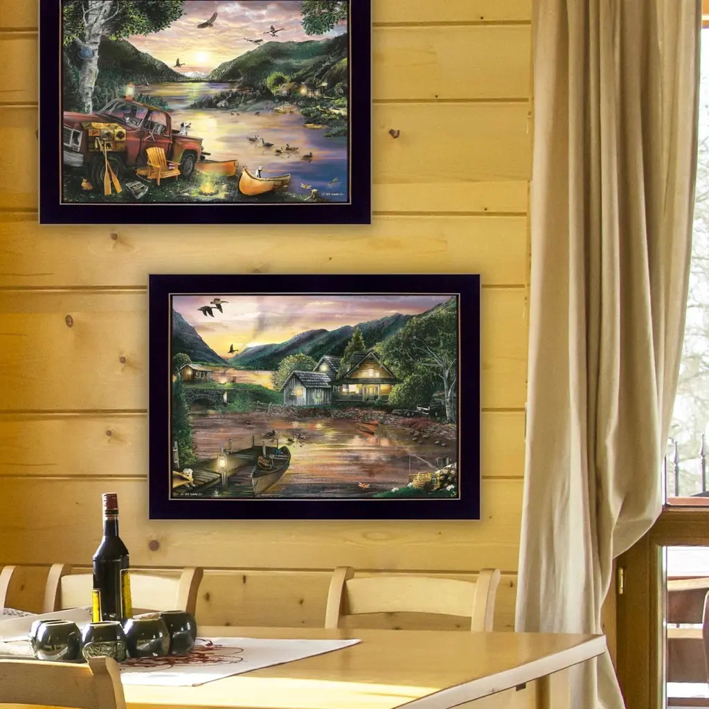 VED657-712 "Lakefront Camping" by Artisan Ed Wargo. This decorative black (2-18x14) framed Collection of camp fire beside a lake, old pickup truck, row boat, and the geese flying overhead at dust, and they are fishing yet! Framed print has a UV coating (glass is not needed) and arrives ready to hang. Made in USA.