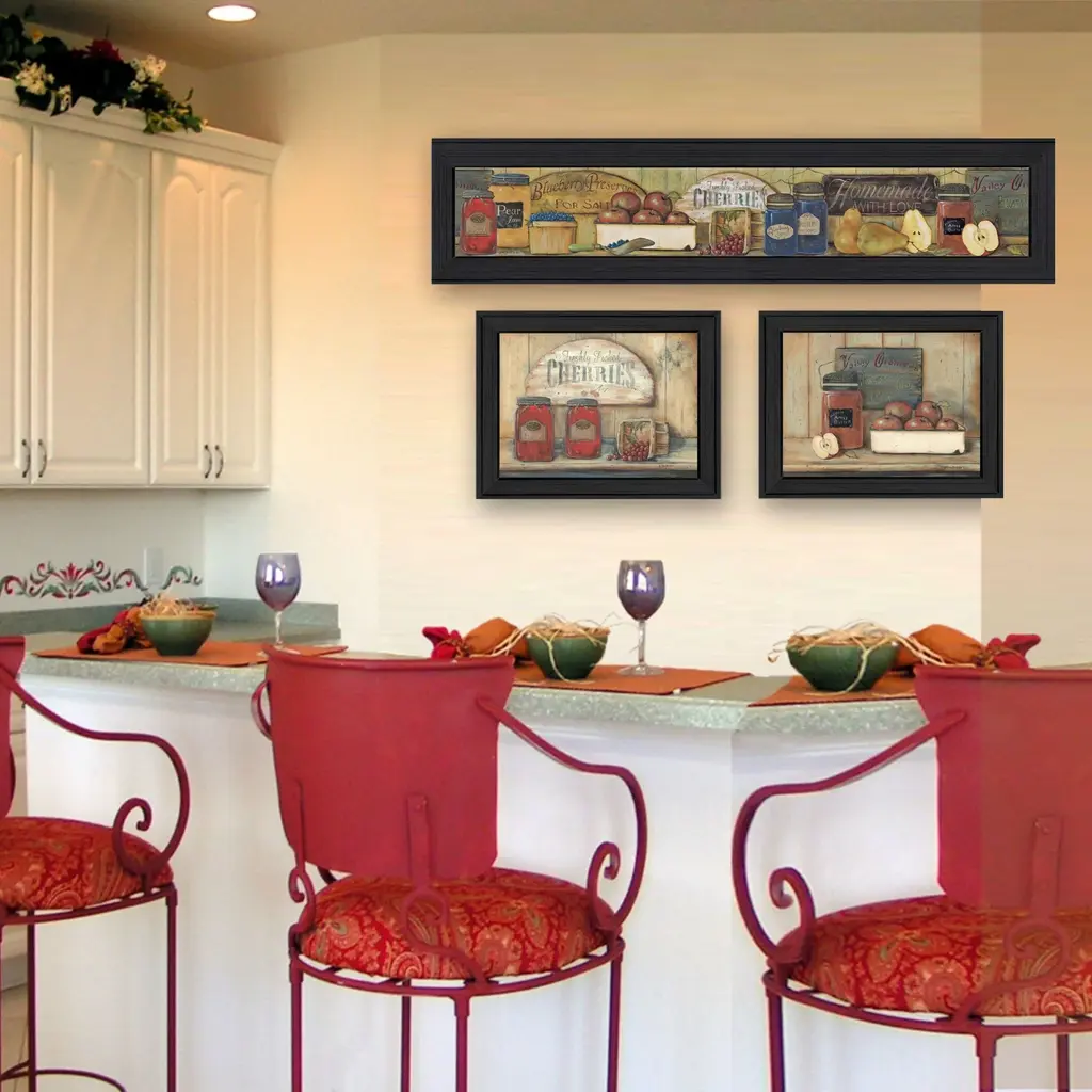 Kitchen is a set of (3) framed art prints including: 2 - 19" x 15" & 1 - 39"x9" black framed art prints by artist Pam Britton. This 3 piece collection consists of: Cherry Jam with 2 jars of jam and cherries spilling on the counter, Apple Butter has a jar of apple butter with a tub of apples, Country Kitchen has blueberries, apples, cherries, pears and jars of jam and apple butter. The framed prints have a protective, archival finish (glass is not needed) and arrive ready to hang.