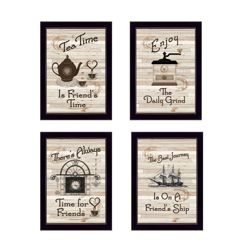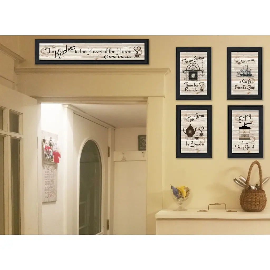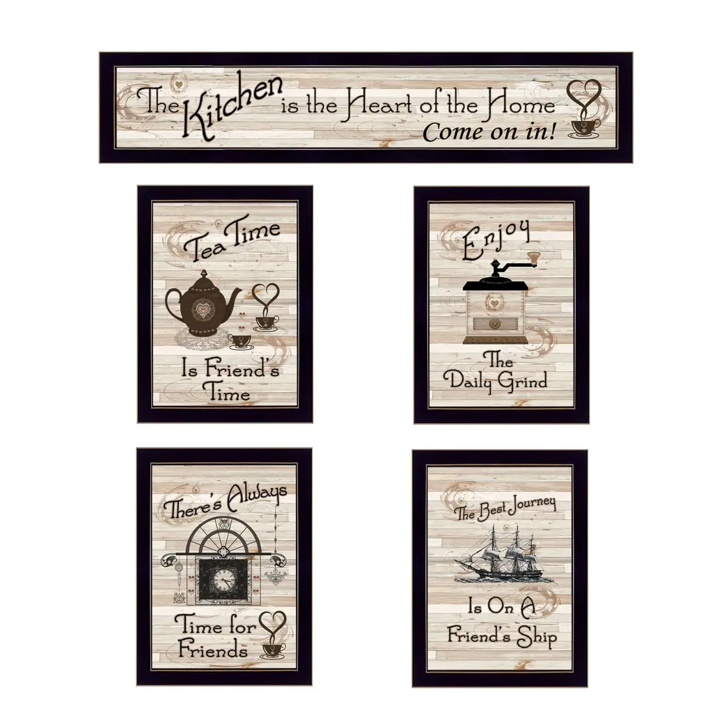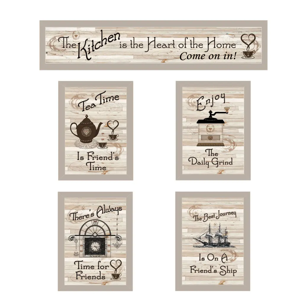 Kitchen Friendship Collection II, by the designers at Trendy decor 4U, a 5 piece grouping in matching white frames: "Kitchen is the Heart of the Home", and 4 framed prints: Tea Time; Time for Friends; The Daily Grind; and Friendship Journey Journey. The surface of the prints is textured with a fade resistant coating so no glass is necessary. Arrives ready to hang. Made in the USA by skilled American workers.