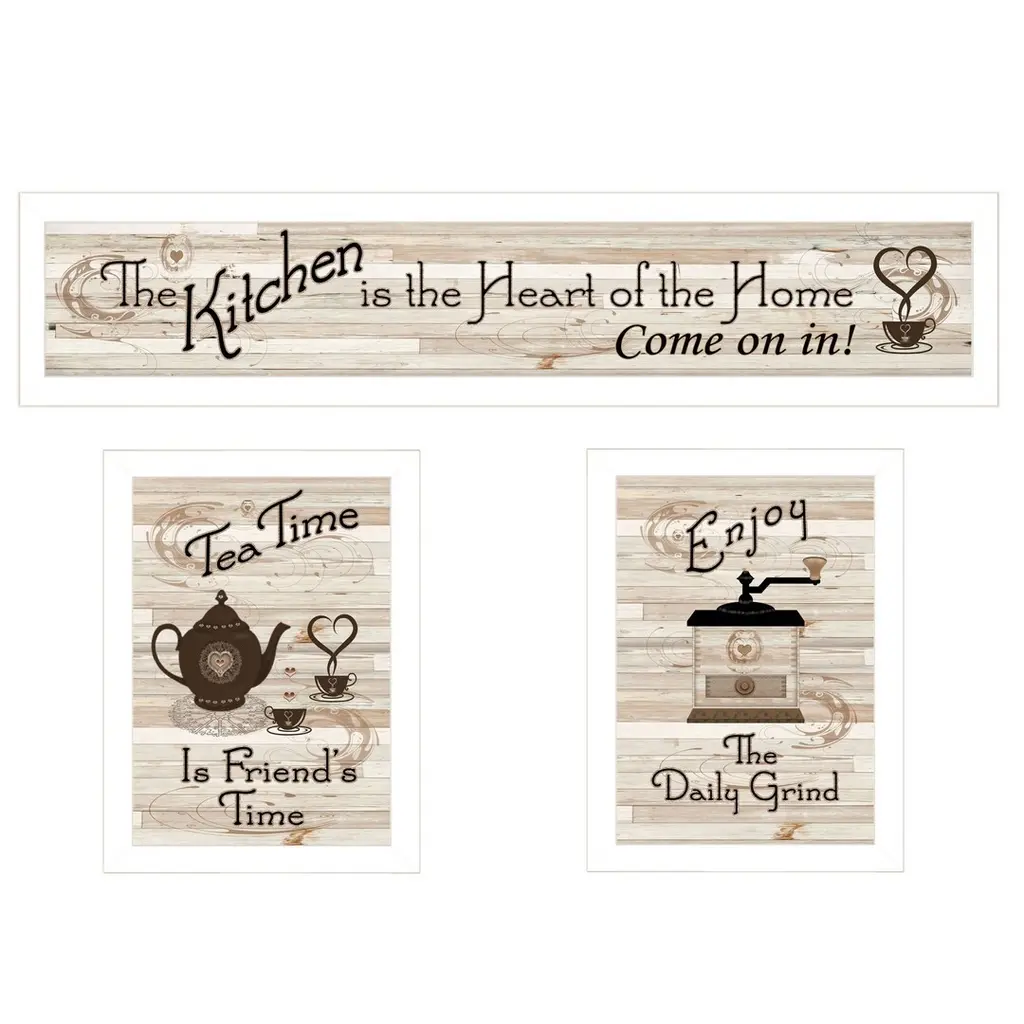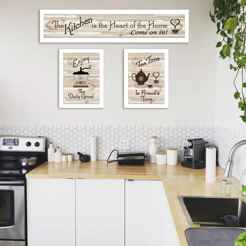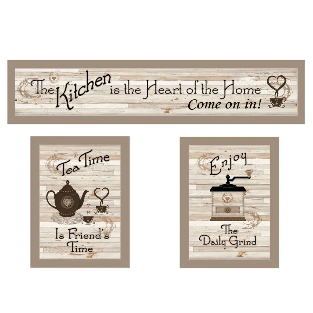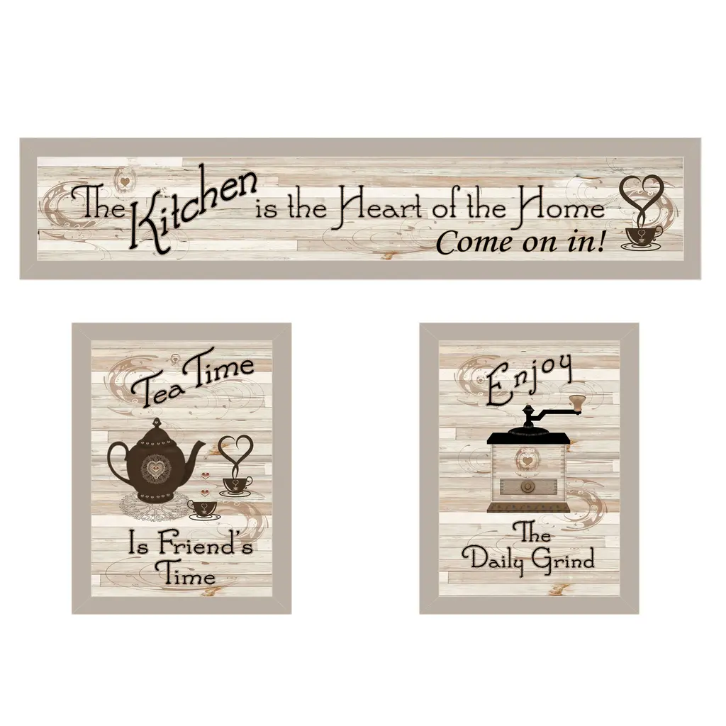 Kitchen Friendship Collection III, a 3 piece grouping of kitchen decor framed art by the designers at Trendy Decor 4U, (1) 32 x 7 "Kitchen is the Heart of the Home, plus 2 (10 x 14) "Tea Time" and "The Daily Grind", all in matching frames. The surface of the prints is textured with a fade resistant coating so no glass is necessary. Arrives ready to hang. Made in the USA by skilled American workers.