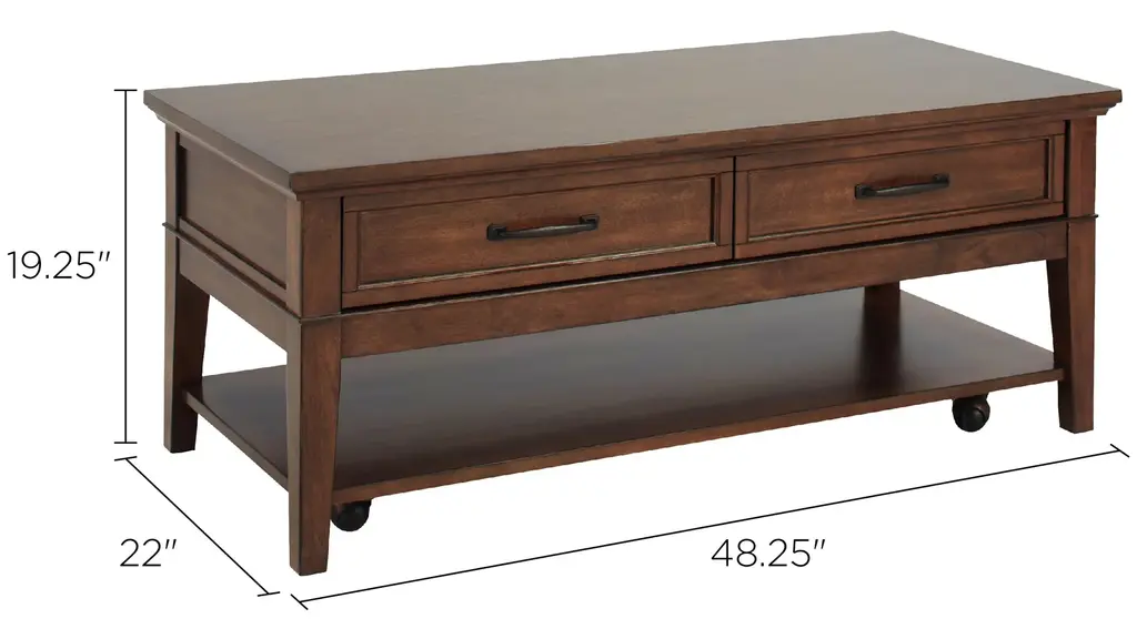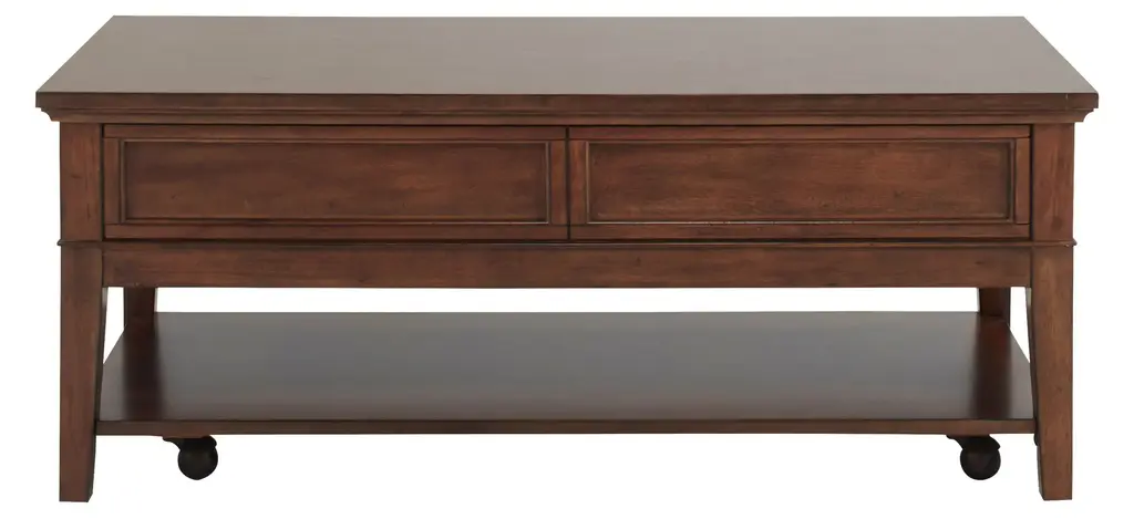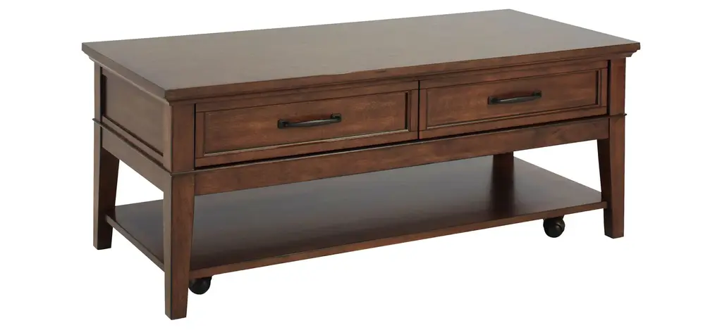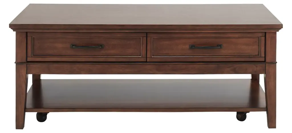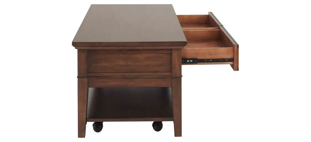 The Trenton cocktail table brings a timeless look to any living space. Its brown cherry finish is warm and pleasant.