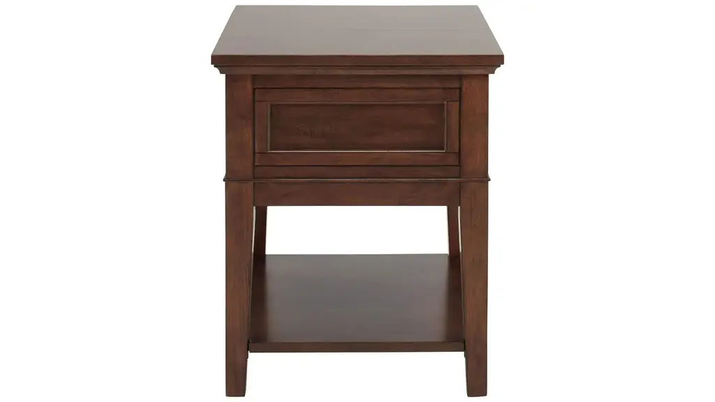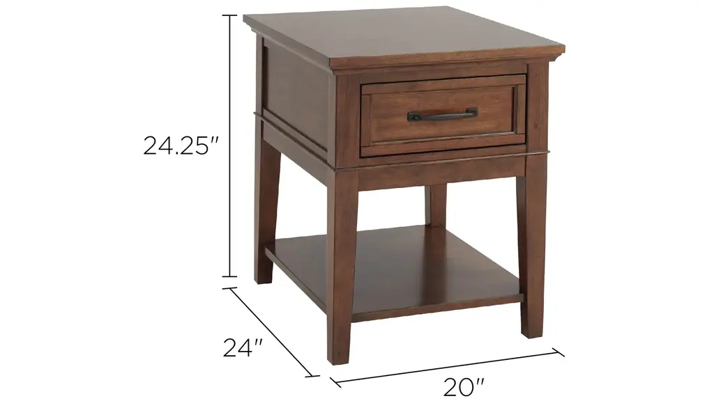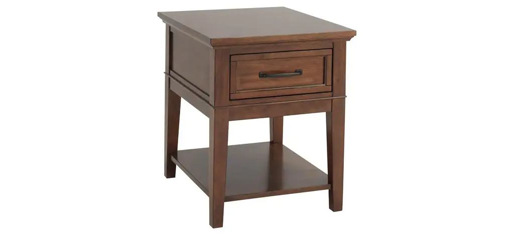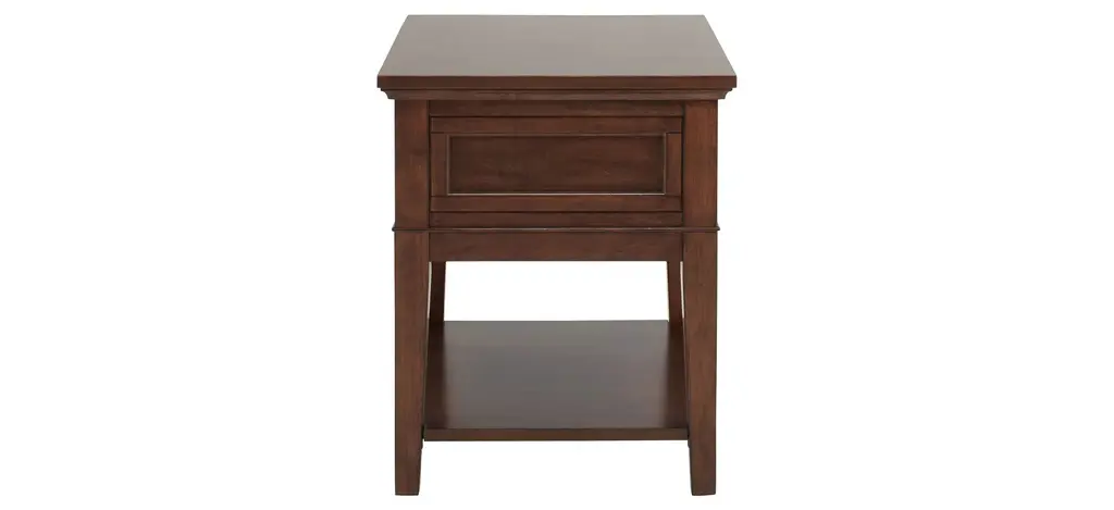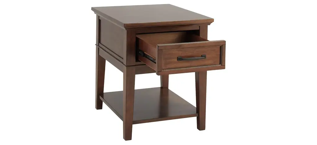 The Trenton end table brings a timeless look to any living space. Its brown cherry finish is warm and pleasant, while the drawer and shelf offer ample sofa-side storage.