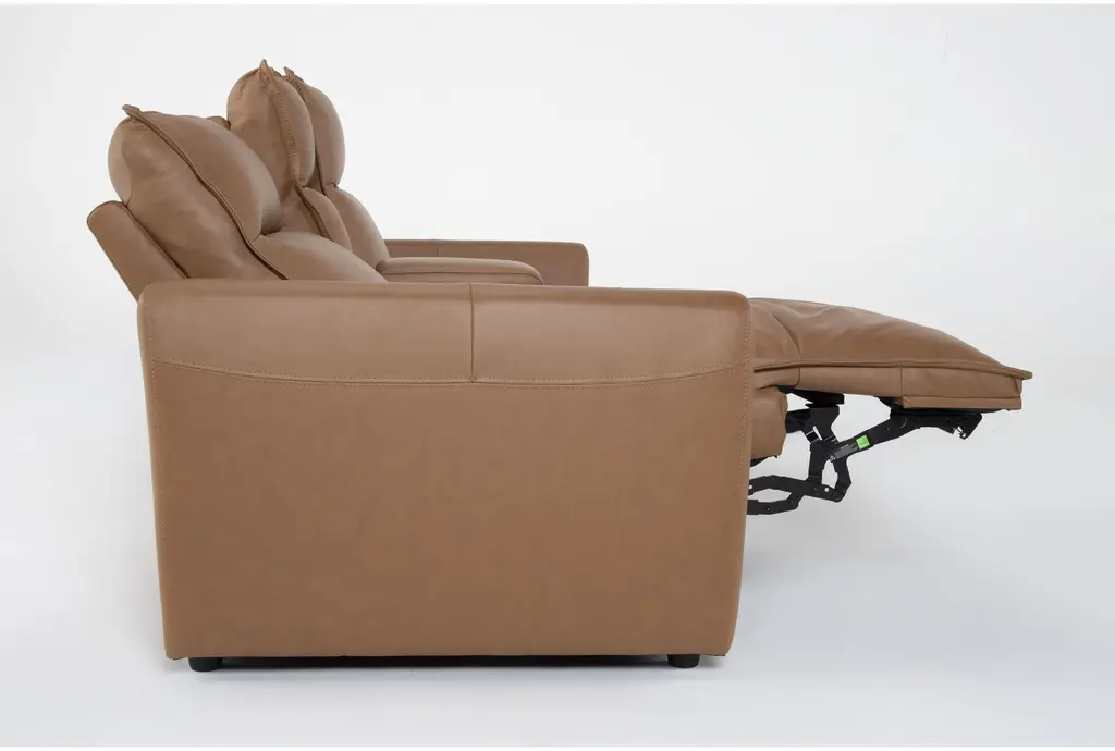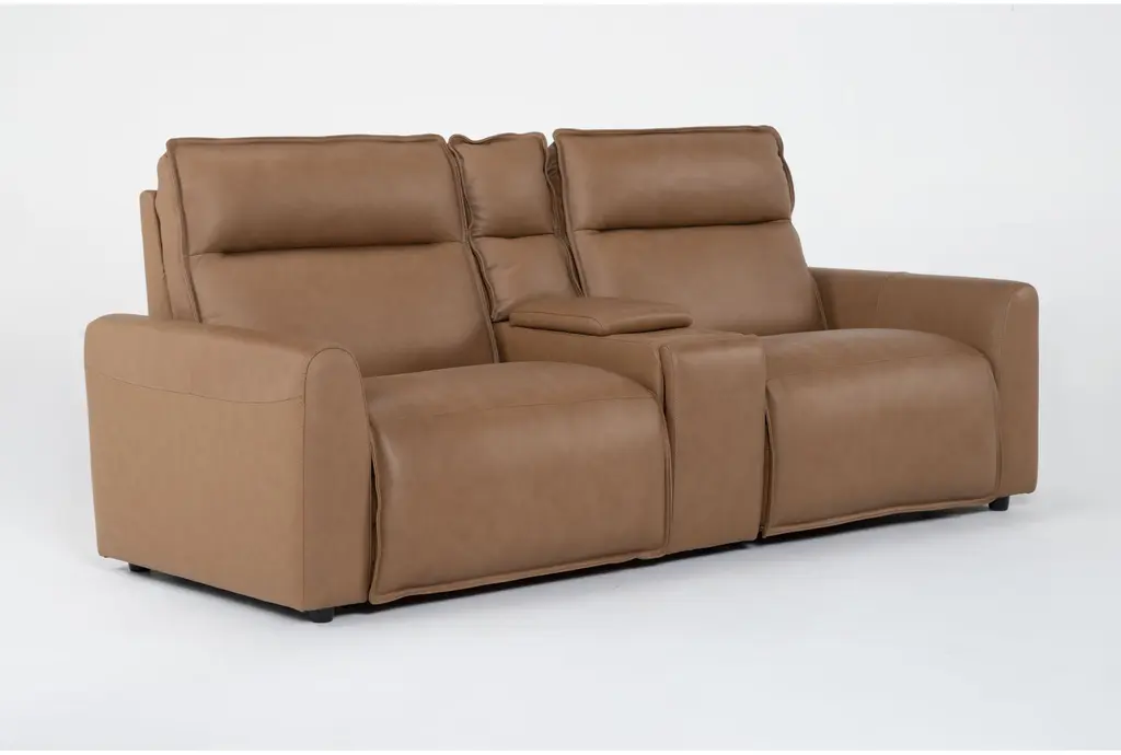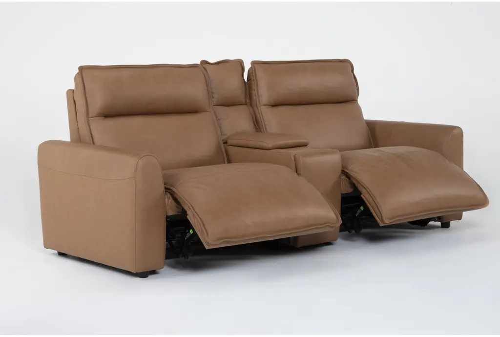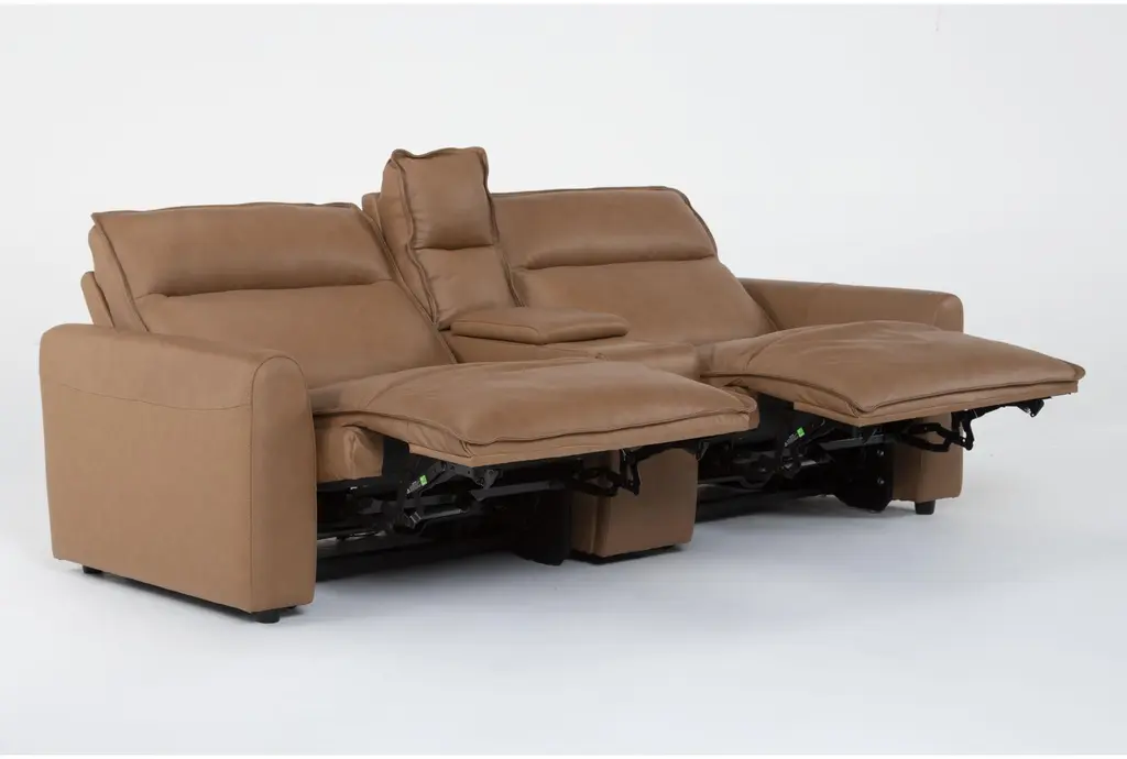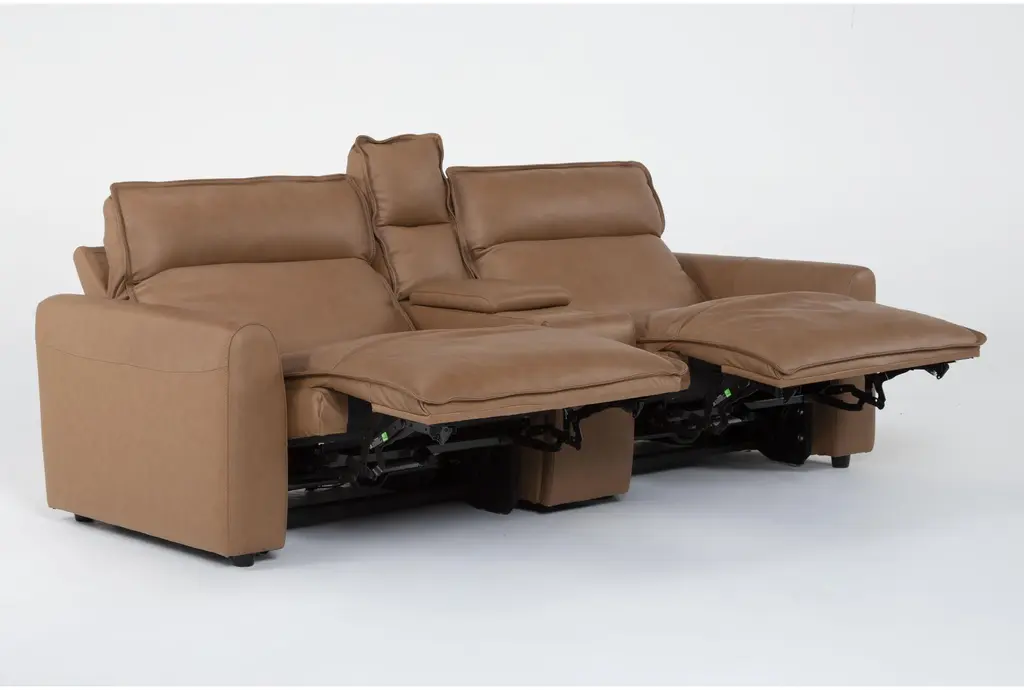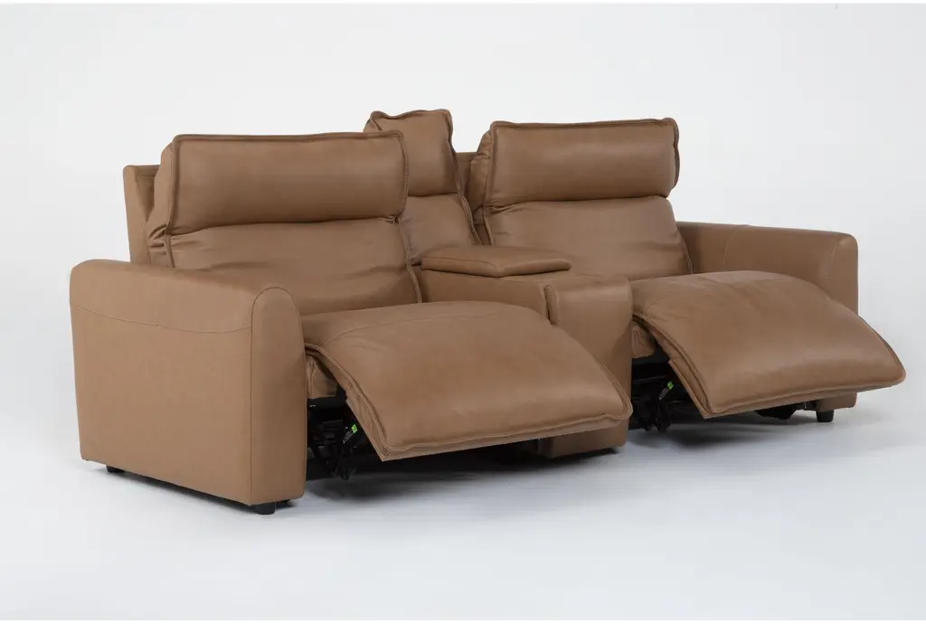 Trenton Saddle Brown Leather 97" 3 Piece Power Reclining Modular Console Loveseat With Power Headrest Wireless Charging Storage Pop Out Cupholders & Usb