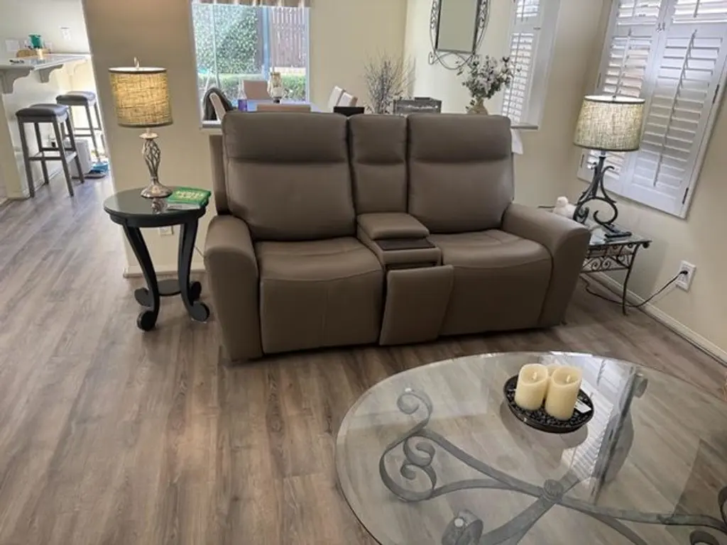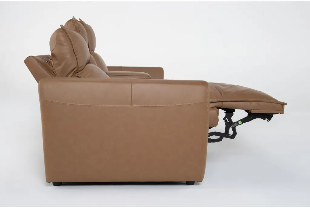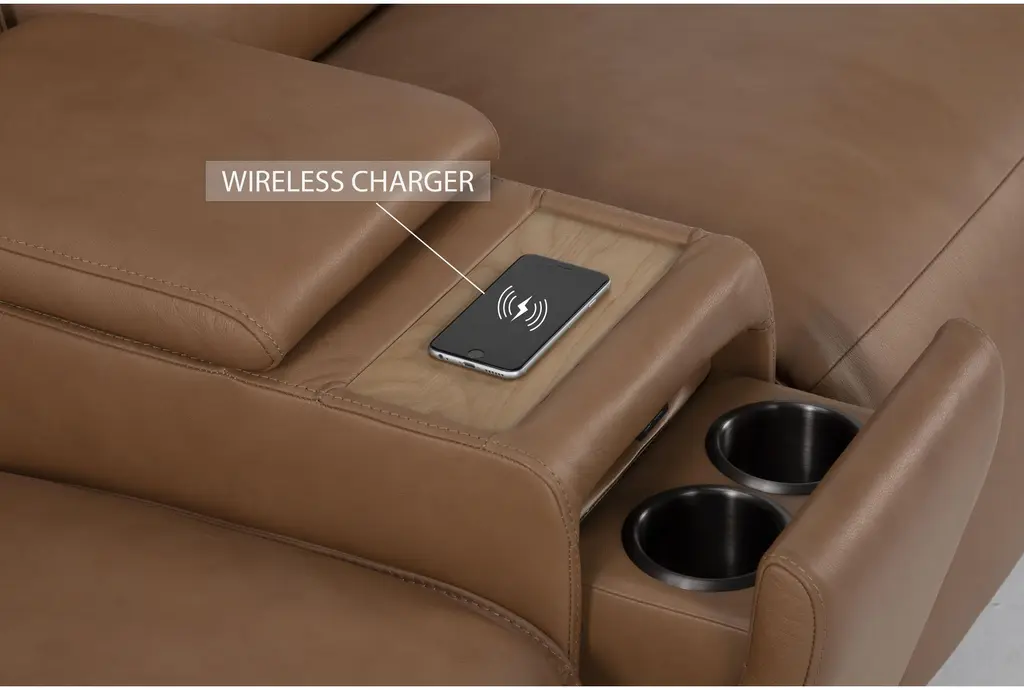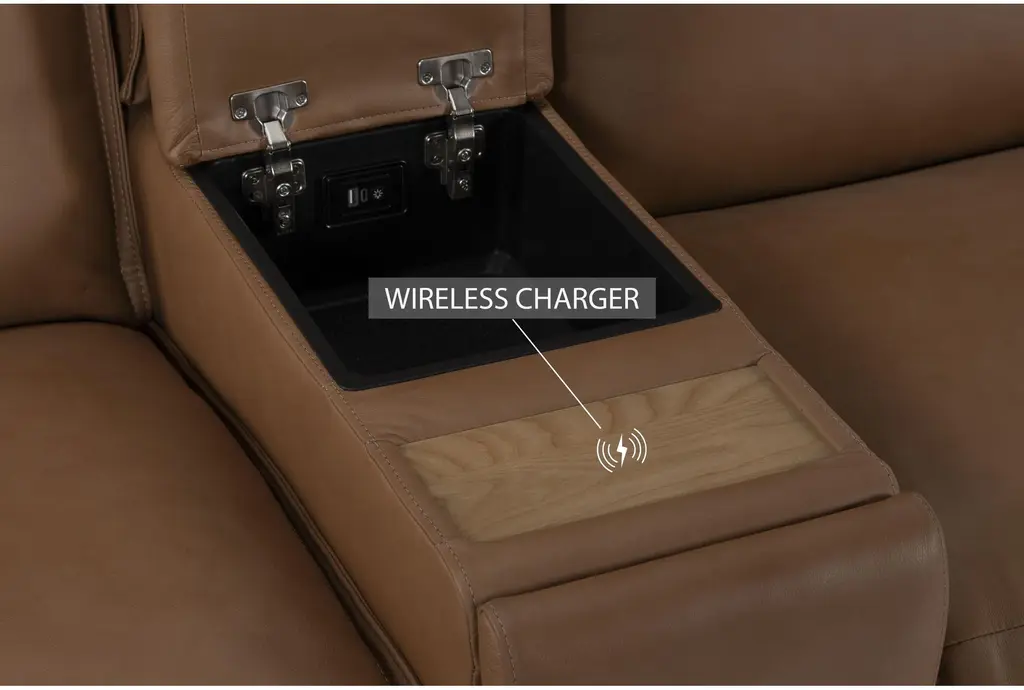 Experience unparalleled comfort and modern design with the Trenton Saddle Brown Leather 97" 3 Piece Power Reclining Modular Console Loveseat. Upholstered in 100% top grain leather, this modular loveseat features a variety of conveniences, including wireless charging and USB ports, to enhance your relaxation time. The adjustable headrest and pop-out cupholders add extra functionality to this stylish piece.