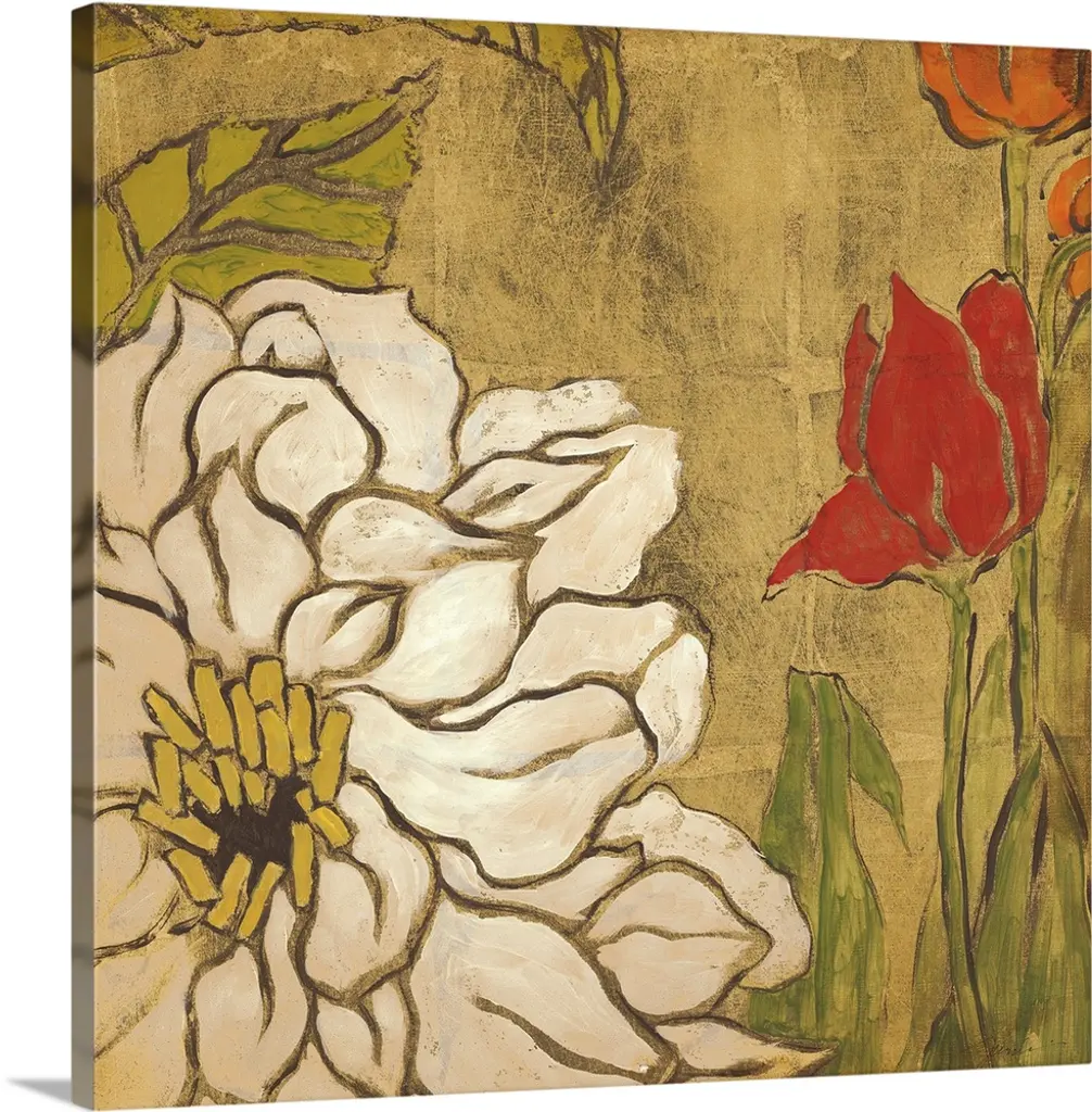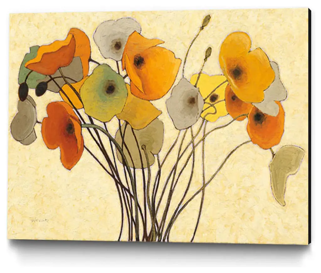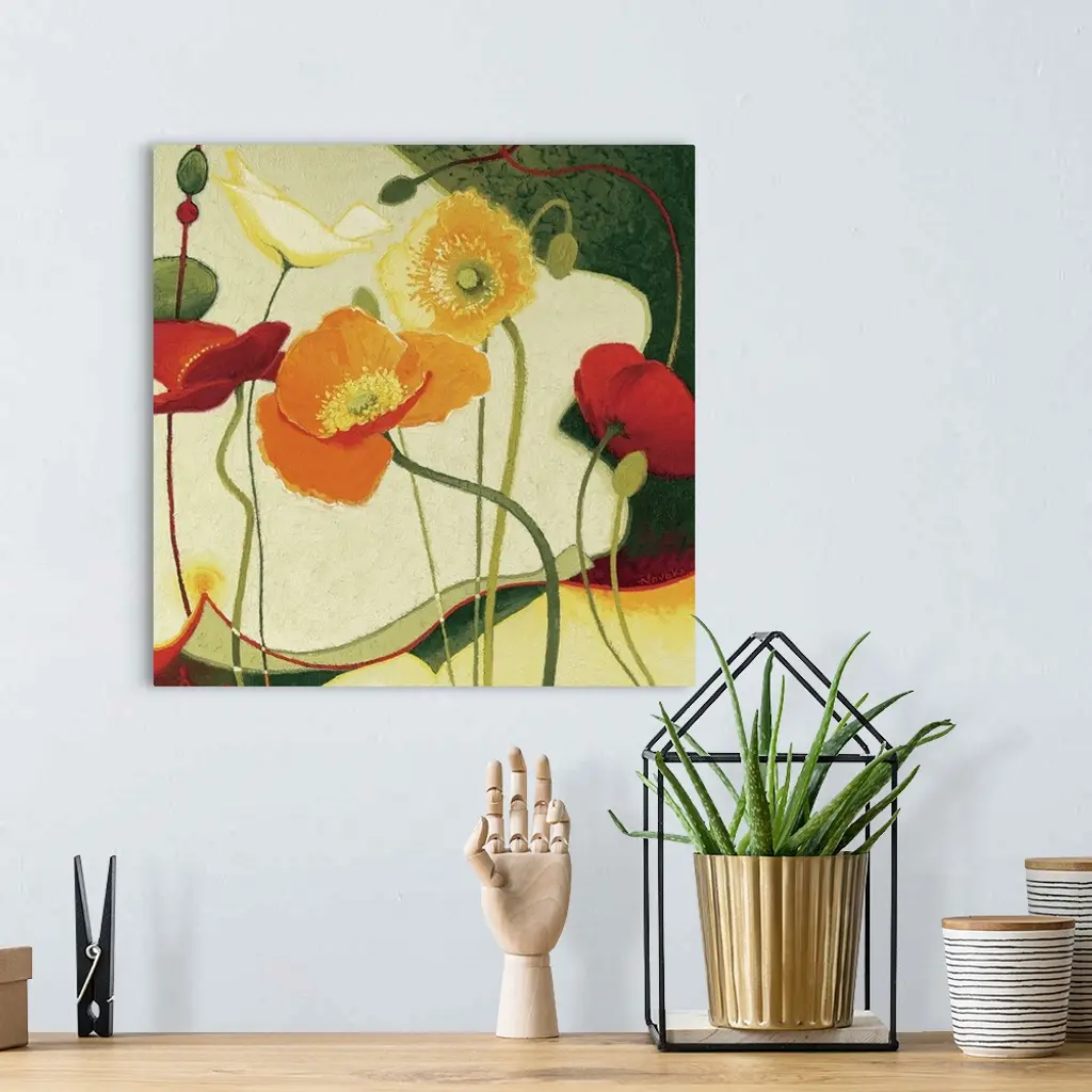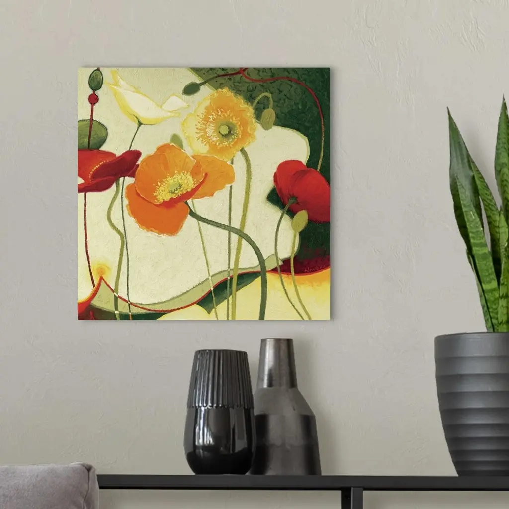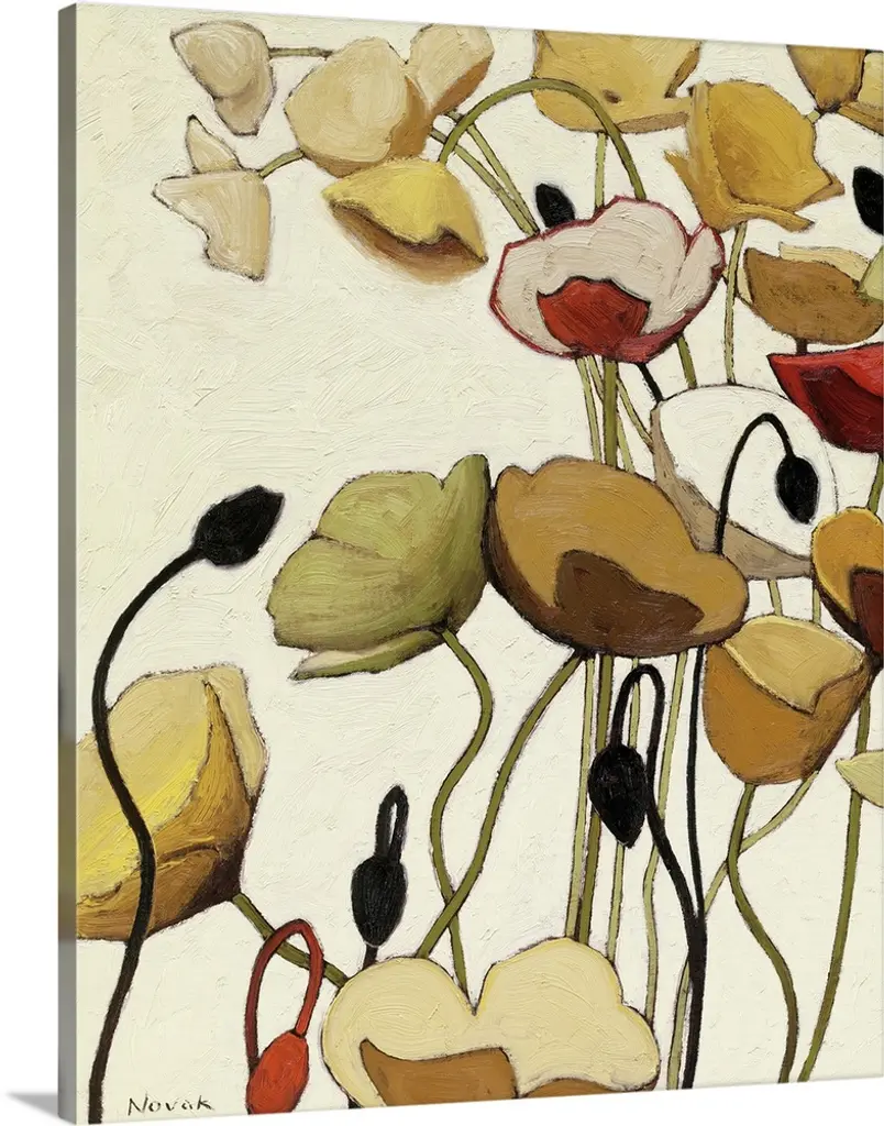 Big contemporary art portrays a group of colorful poppy flowers sitting against a background that includes large curved patches of neutral and dark cool tones. Artist uses a lot of curvy lines to represent the stems of the flowers.