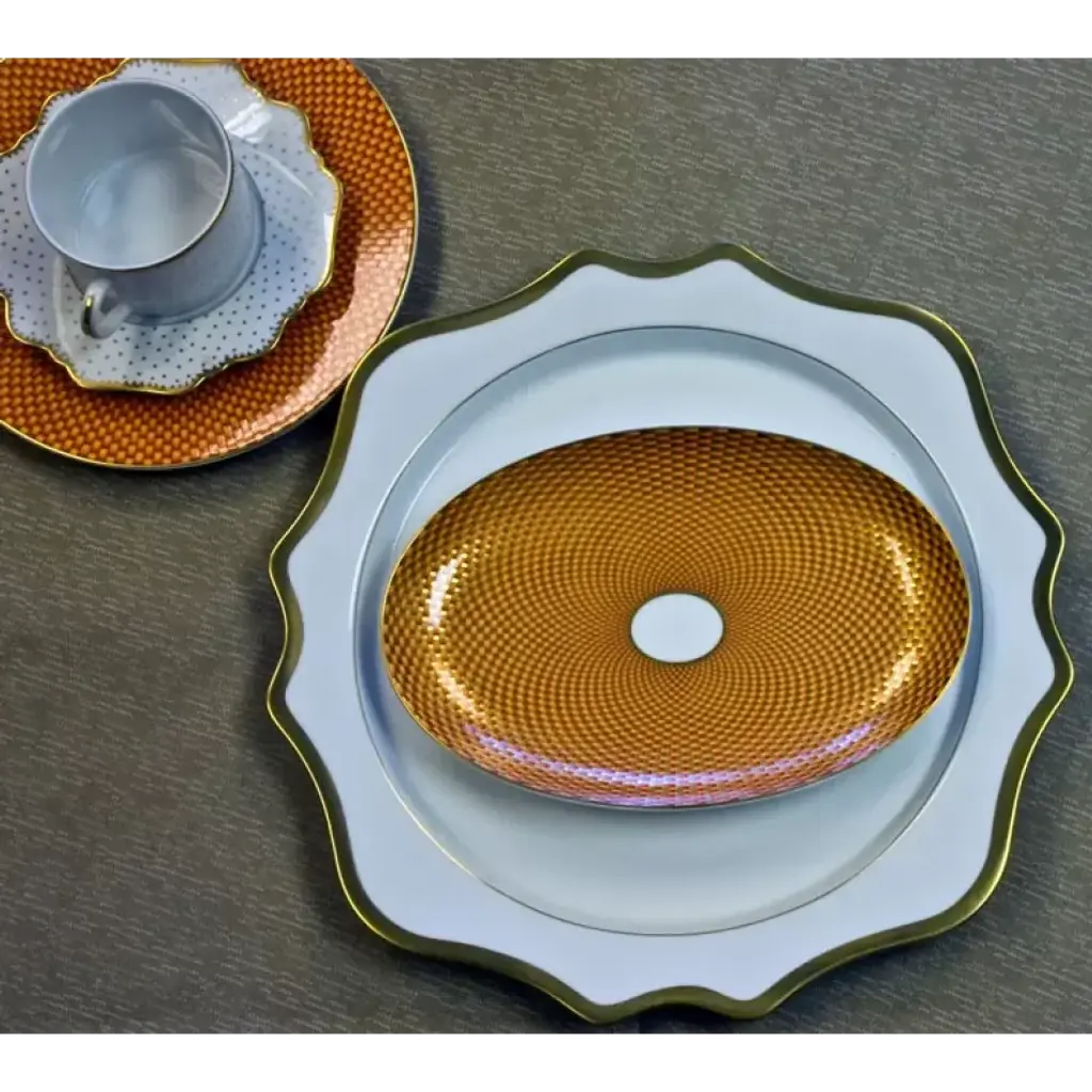 From the house of Raynaud, the Tresor dinnerware collection features an ornate pattern of gold and a range of colors from earth tones to turquoise. Mix and match the colors for a truly unique look. Raynaud was established in 1849 and is the only survivor of 11 porcelain factories existing in Limoges, France. After years of research, Raynaud discovered techniques to create infinite combinations of fade-resistant decorations that is still used by porcelain makers. Boasting a client list of numerous presidents to Princess Diana, Raynaud has been the synonym of quality, known and recognized on every continent.