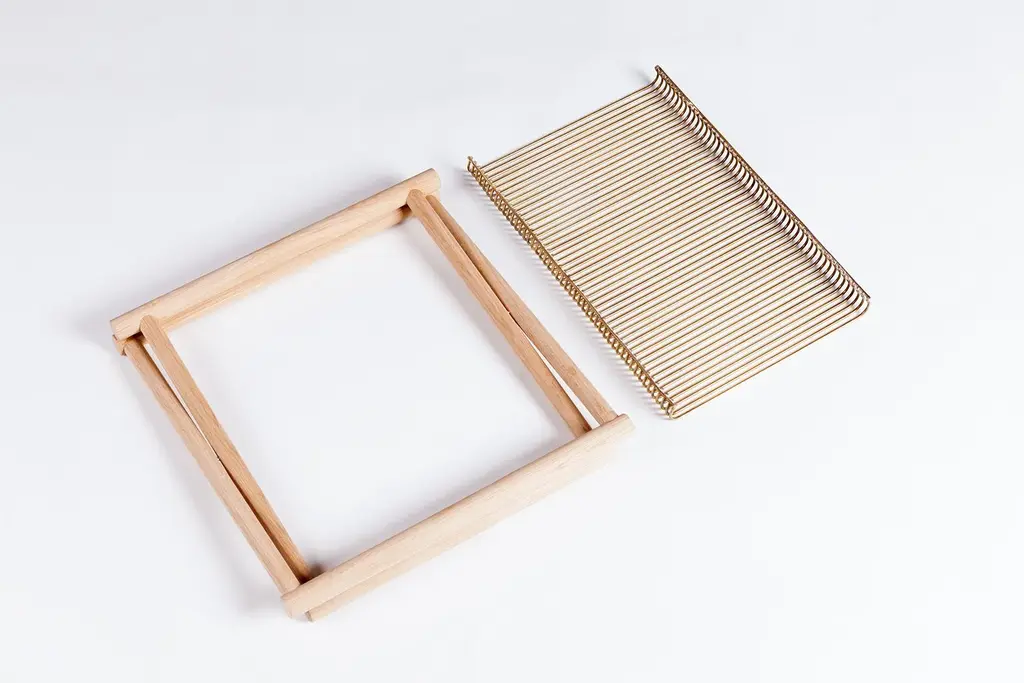 The tables of the Trestle collection are composed of a folding structure in solid oak (diameter 30-25mm), with a natural or wengé-colored finish, and a tabletop made entirely by hand with a complex weave of metal rods that are bent and welded together. Numbered,Numbered