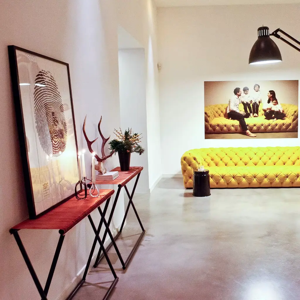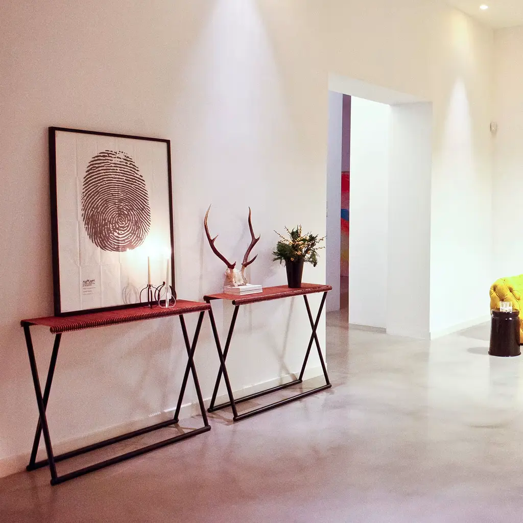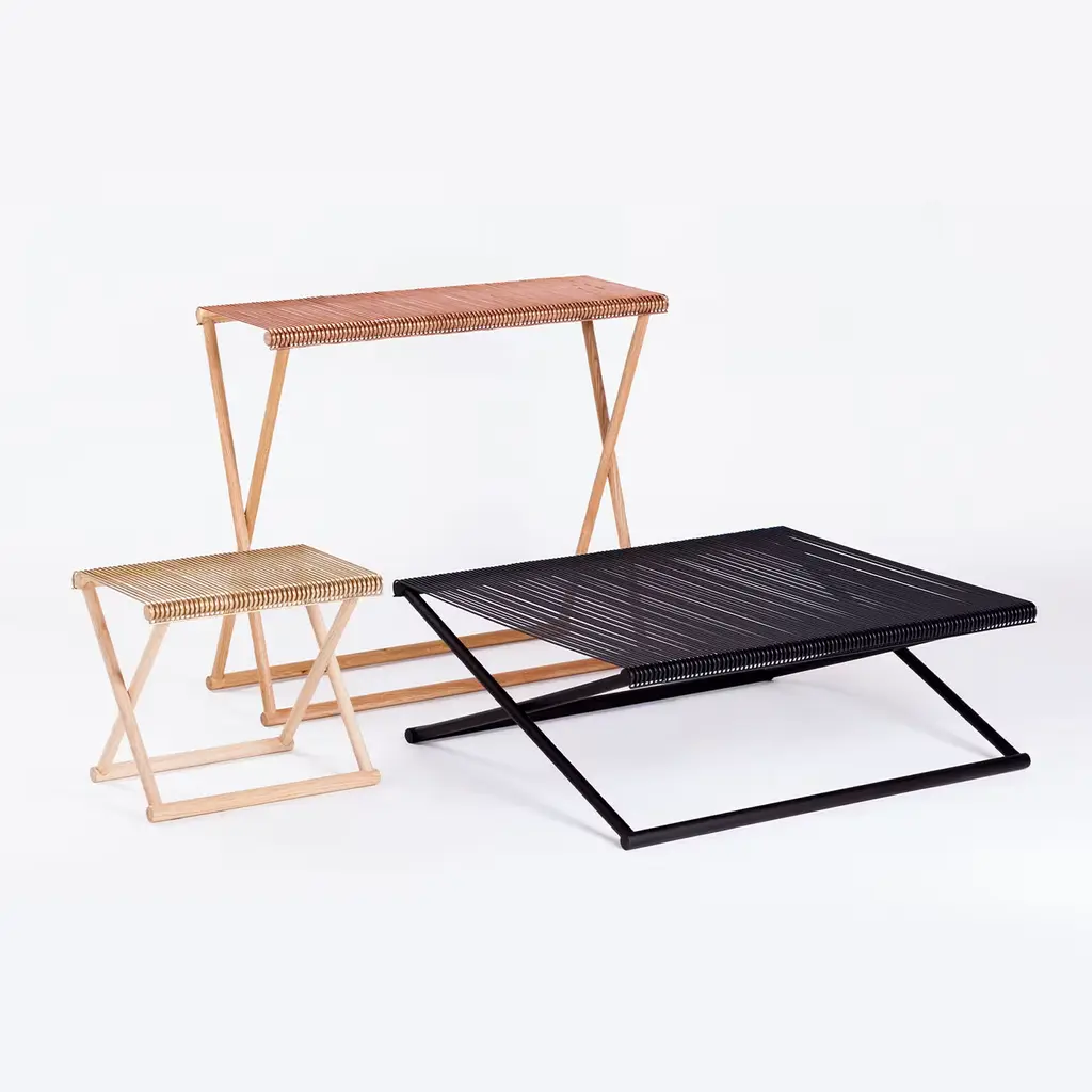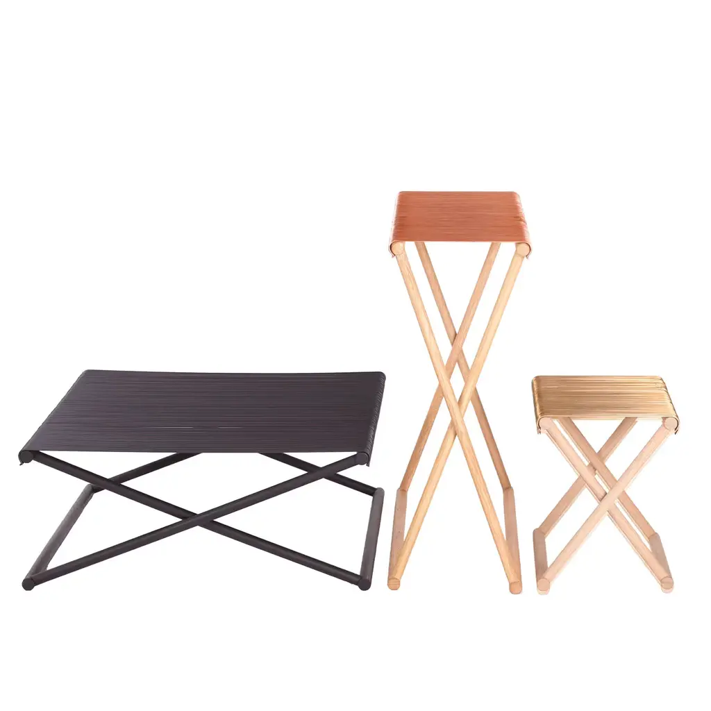 The tables of the Trestle collection are composed of an oak wood folding structure realized with a natural or wengè finish, and a completely handmade top plan, made by a complex weave of metal rods curved and welded. Also available with the structure in varnished iron.