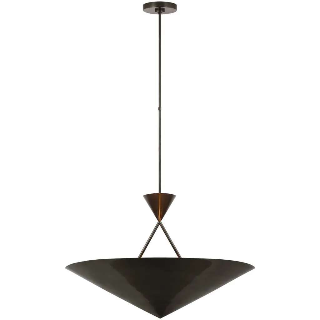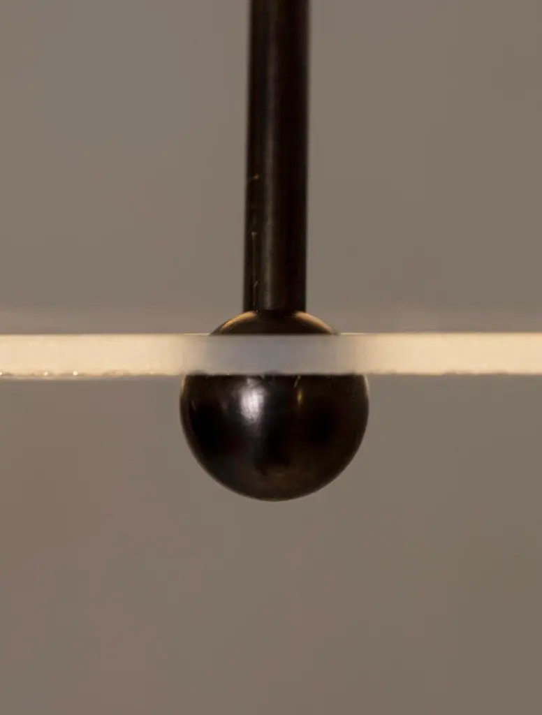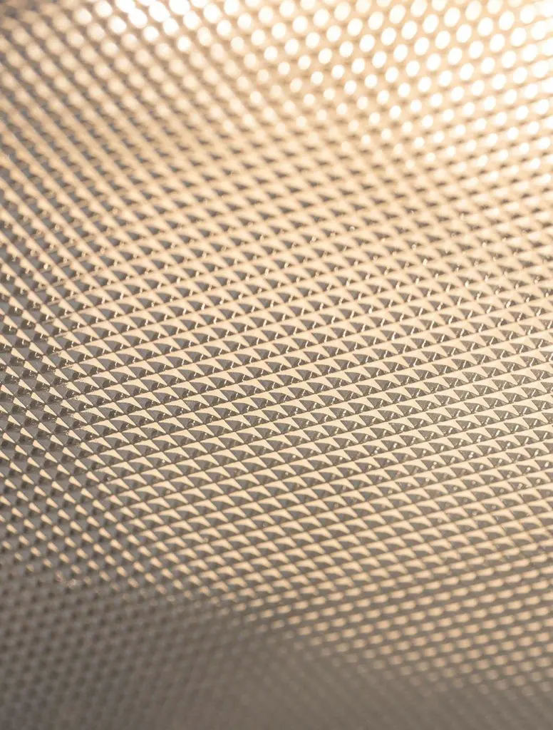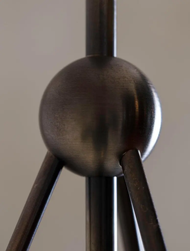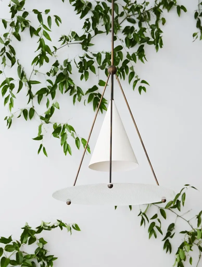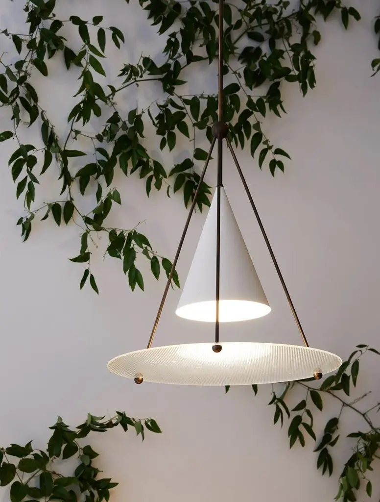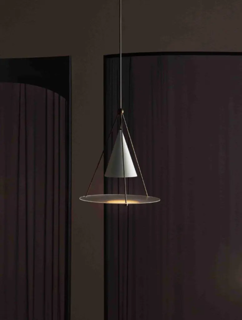 The tri cone pendant echoes it’s form in 3 geometric elements. A tetrahedron structure suspends a glass disc under a cone shade that houses a focused spot-light. The light is diffused by a micro-pyramid texture in the glass resulting in a beautiful expanse of diffused light.
