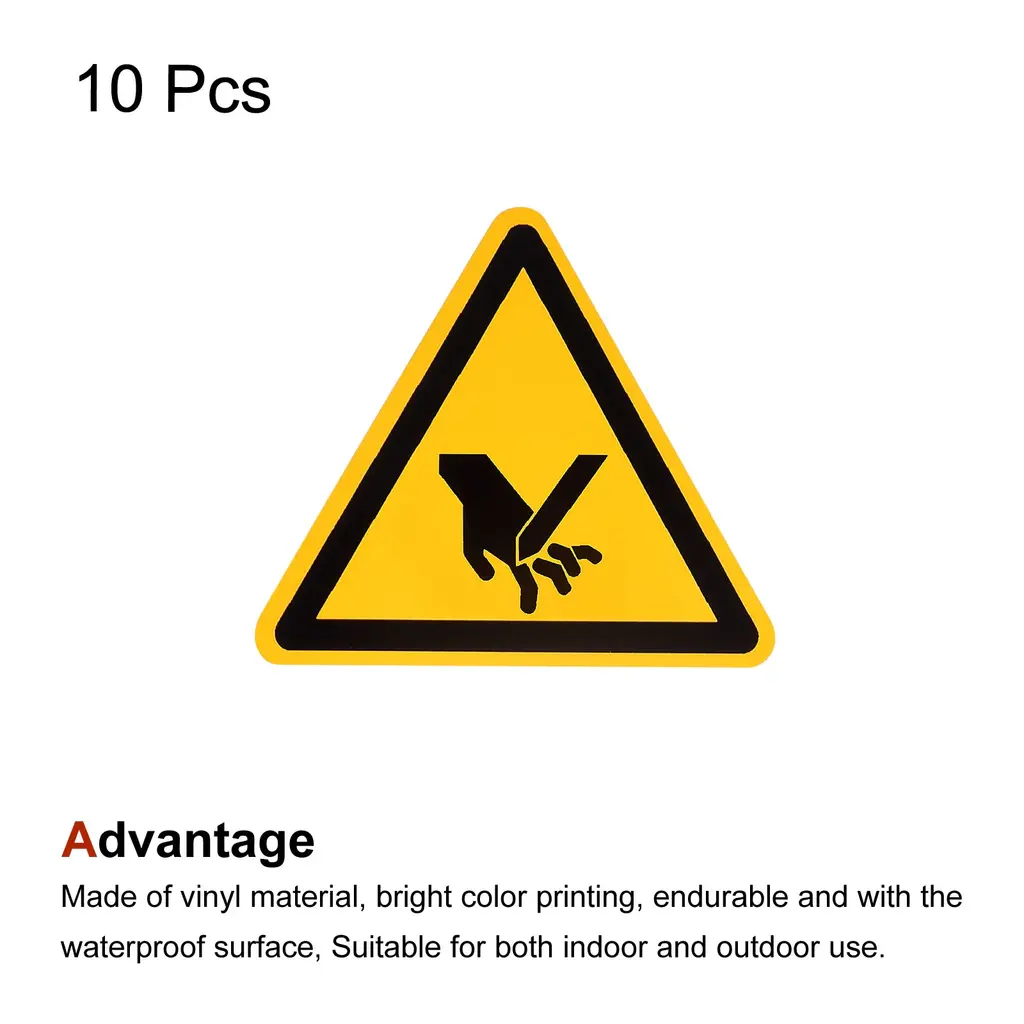 What is this? Small-sized triangle Anti Cutting Hand Warning Sign to indicate the danger of Machine What will I get? Length: 20mm/0.78inch;Thickness:0.2mm/0.008inch Pack of 10 warning sign Is there any advantages of the product? Made of vinyl material, bright color printing, endurable and with waterproof surface, Suitable for both indoor and outdoor use How to use it? Self-adhesive, easy to use, just peel and stick What should I notice? Due to the light problem, there is a slight color difference in the picture shooting